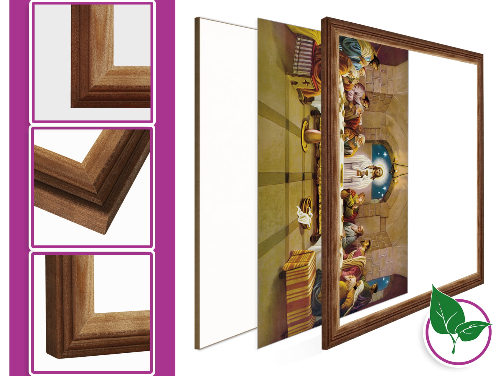 Rama obrazu w 100% naturalna, wykonana z drzewa sosnowego sezonowanego, drewno użyte przy produkcji ramek jest suszone w najwyższej klasy warunkach.