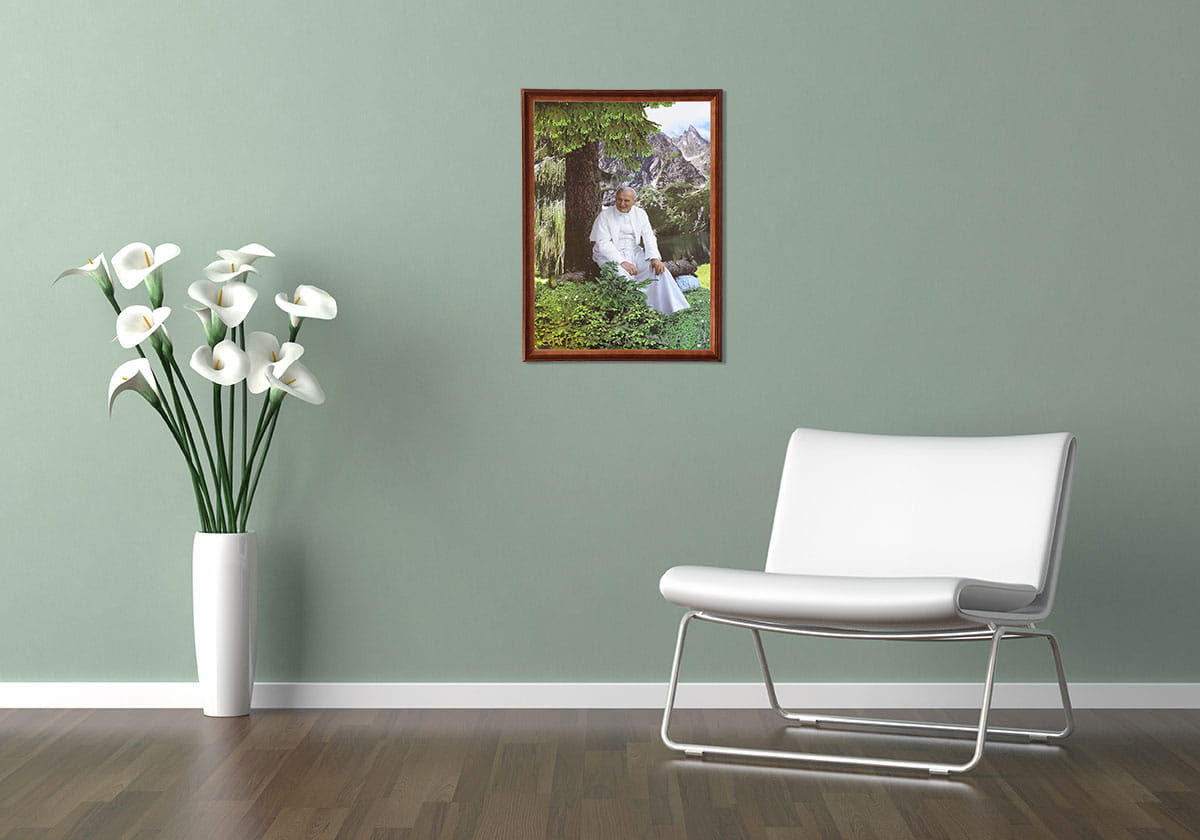 Obraz w ramie o tematyce religijnej w rozmiarze 50x70cm - Jan Paweł II w górach
