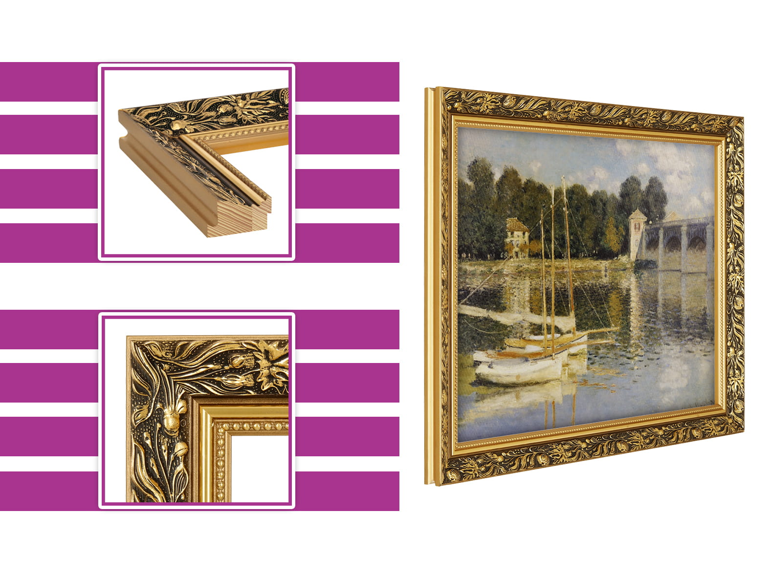 - Zdobiona listwa zostaje pokryta złotem w formie sproszkowanego metalu szlachetnego. Po utwardzeniu na złoconą warstwę nakładana jest ręcznie zacierana patyna. Dzięki zastosowaniu takiego rozwiązania rama uzyskuje atrakcyjny, trójwymiarowy efekt.