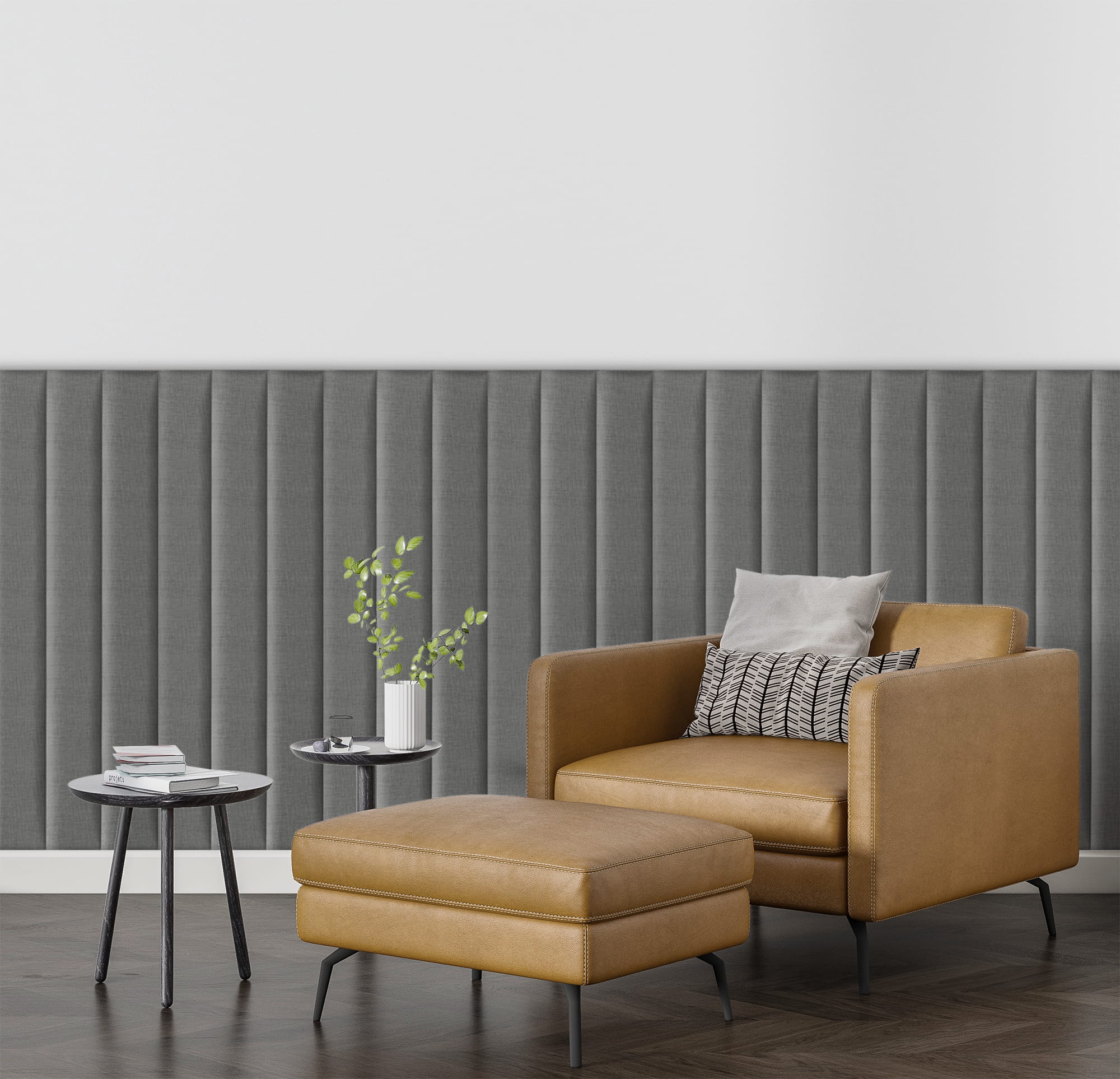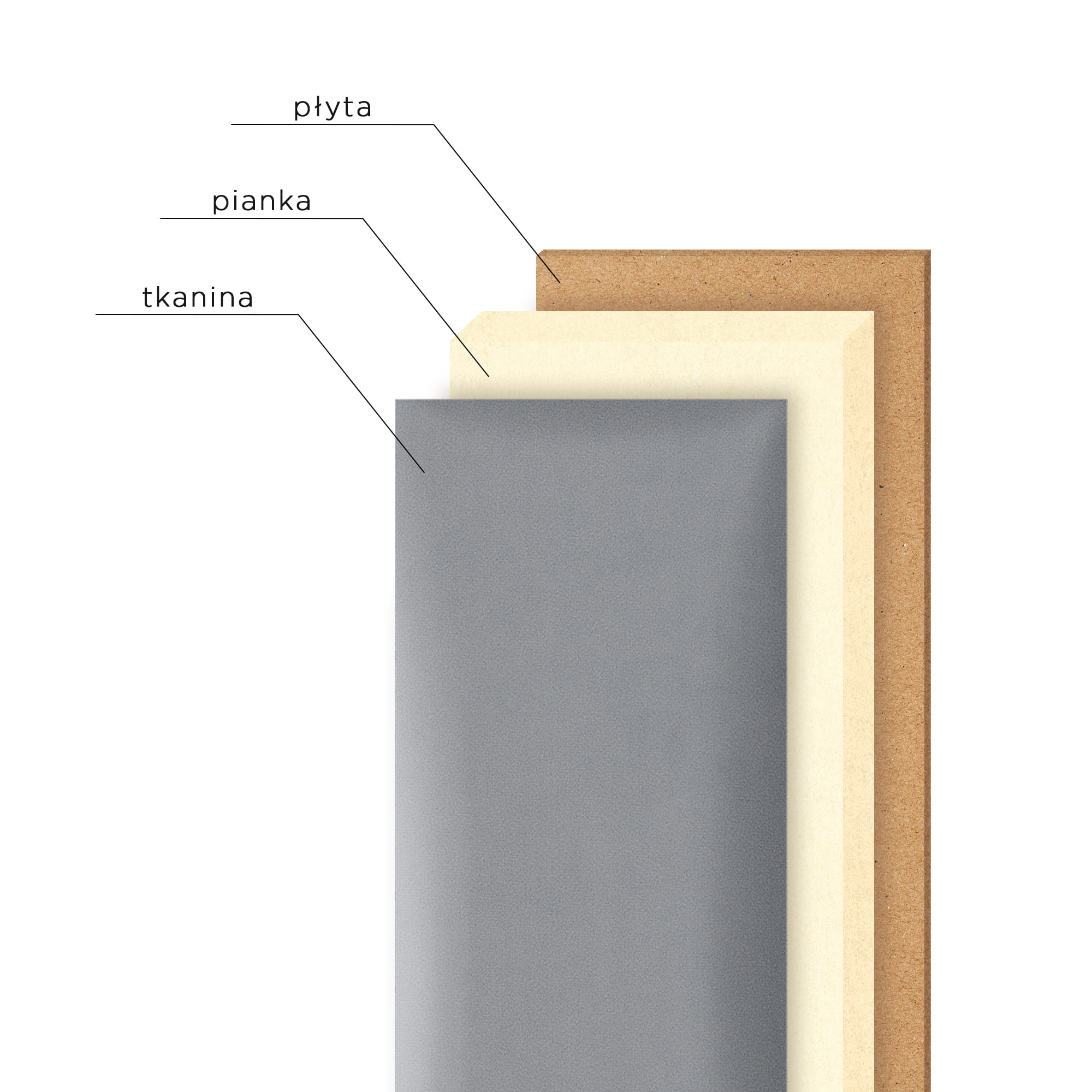 Elegancki wygląd panelu to zasługa zastosowania wysokogatunkowej, tkaniny tapicerskiej, która posiada miękki, welwetowy dotyk. Solidna konstrukcja panelu opiera się na płycie meblowej, która zapewnia stabilność i trwałość, a montaż ścienny odbywa się za pomocą kleju lub rzepów montażowych.