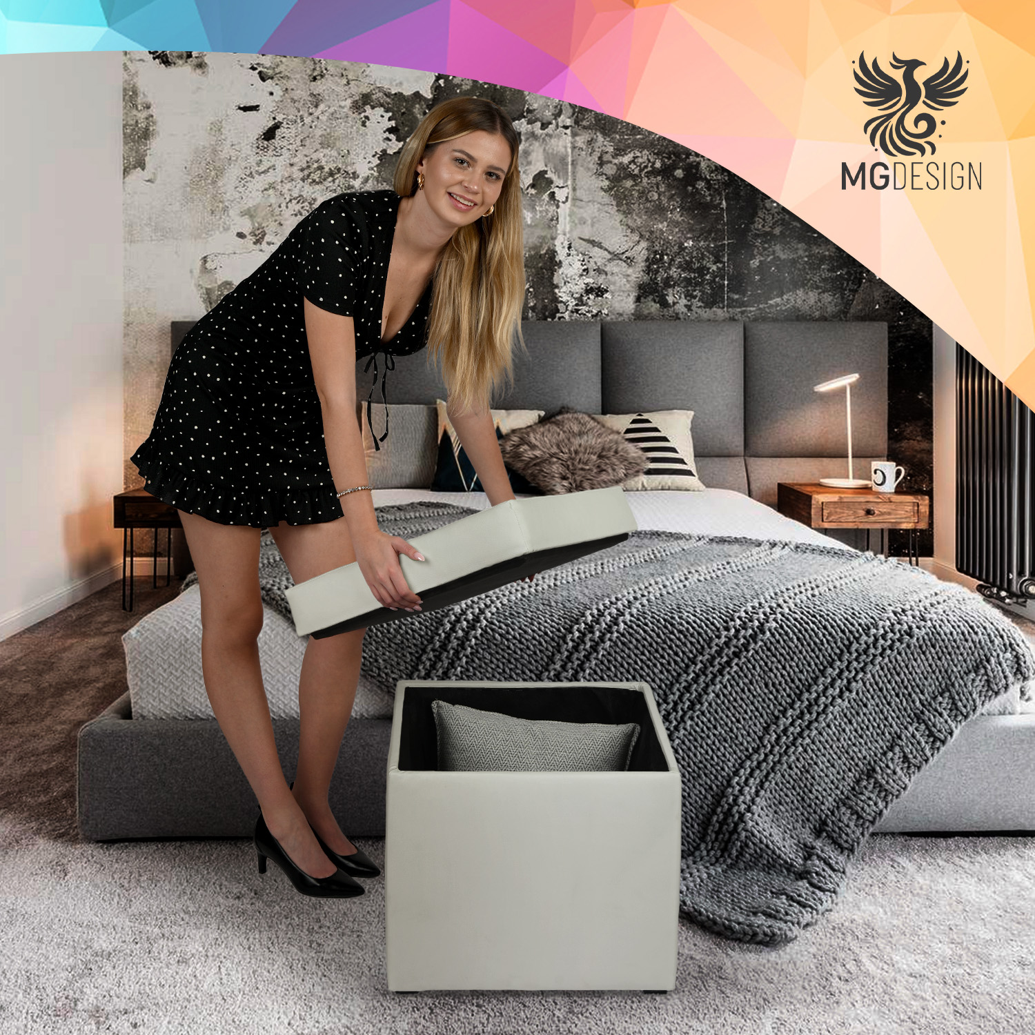 Podnoszone siedzisko kryje pojemny schowek, który pozwala wygodnie przechowywać koce, poduszki, tekstylia lub inne drobiazgi. Dzięki temu pufa pomaga utrzymać porządek w pomieszczeniu, a jednocześnie pozostaje estetycznym elementem aranżacji wnętrza.