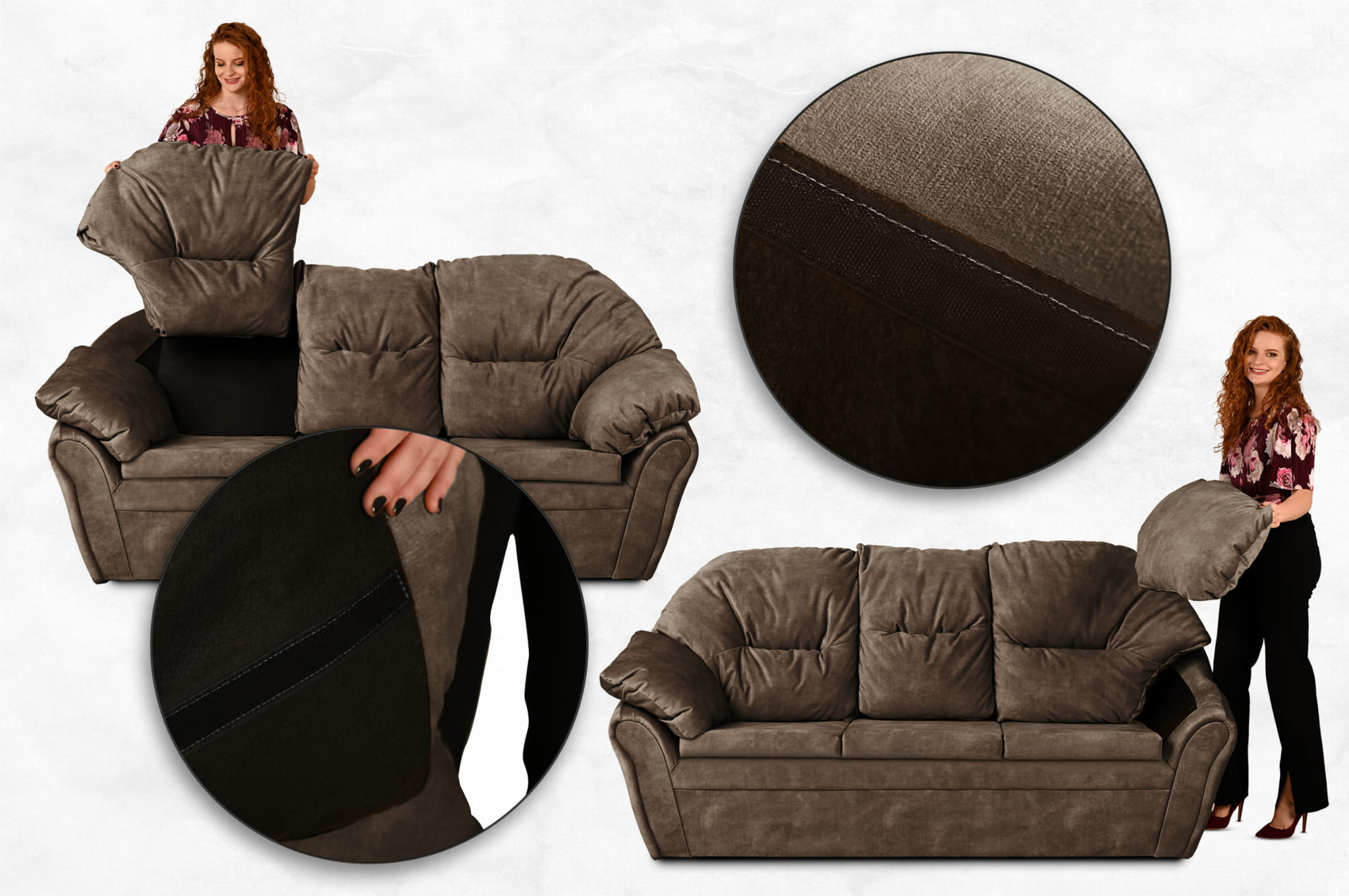 Puszysta, miękka sofa Irma z welurowej tkaniny w kolorze ciemnobrązowym z oparciem i podłokietnikami mocowanymi na rzepy