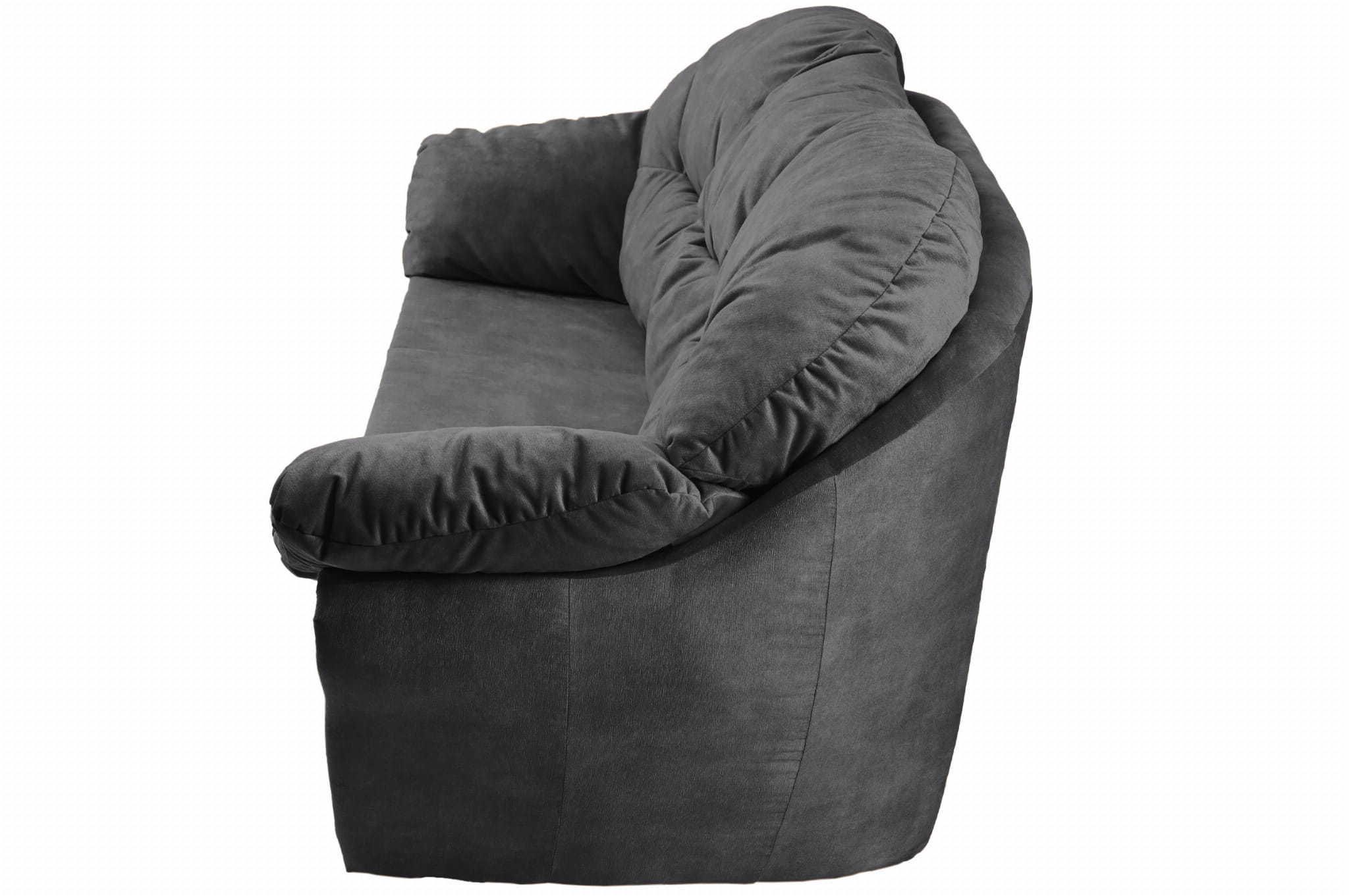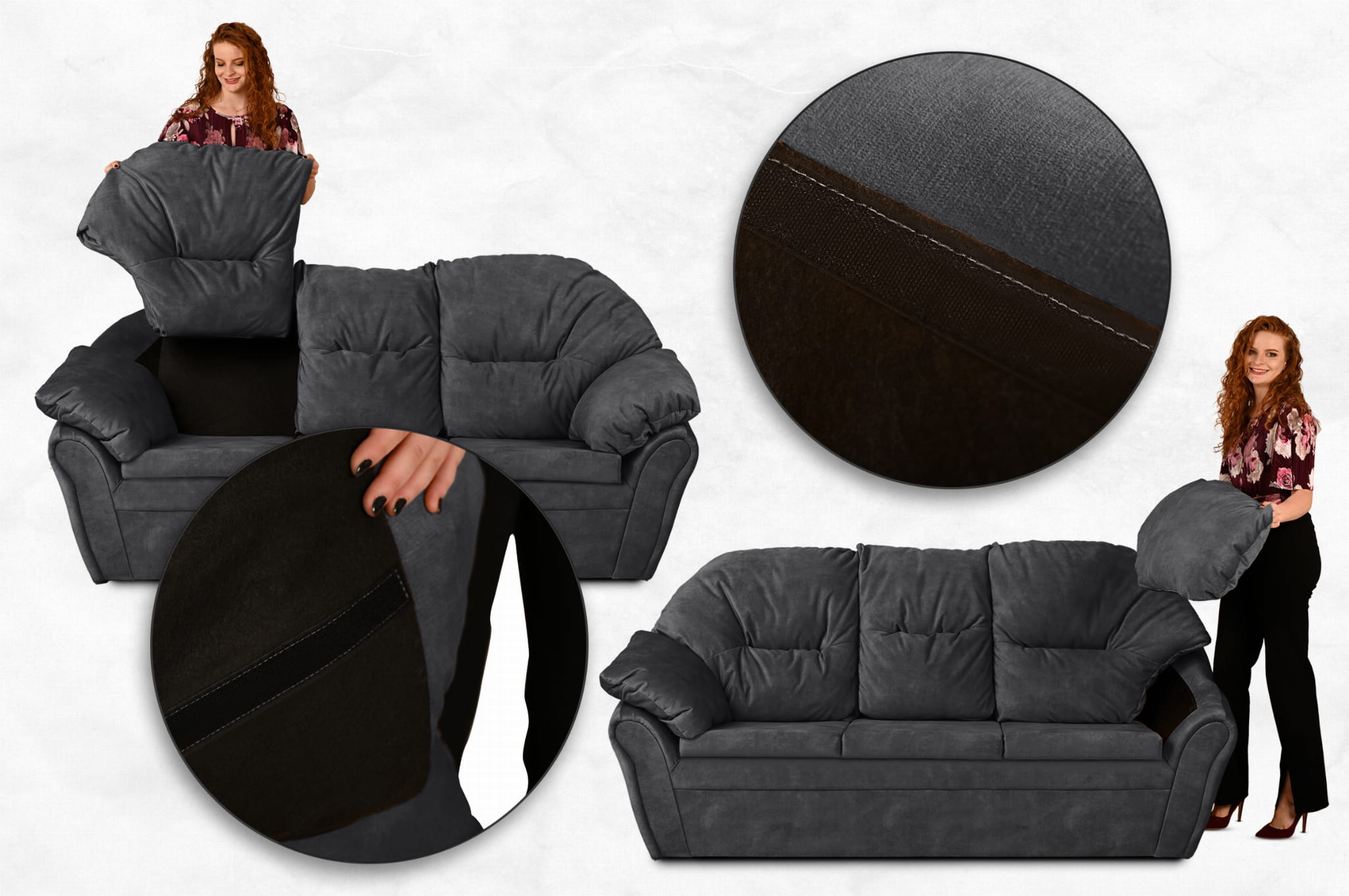Puszysta, miękka sofa Irma z welurowej tkaniny w kolorze ciemnoszarym z oparciem i podłokietnikami mocowanymi na rzepy