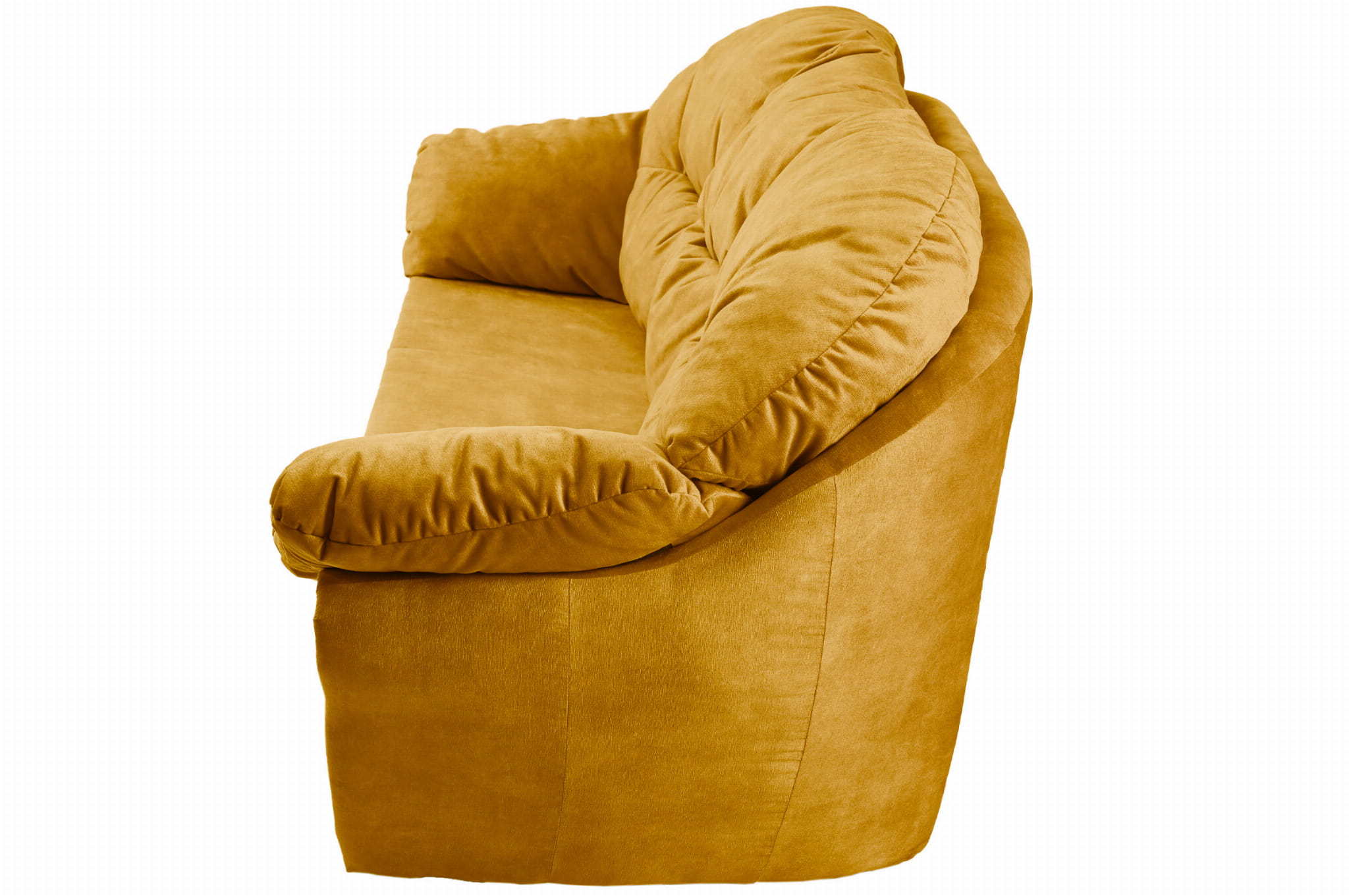 Puszysta, miękka sofa Irma z welurowej tkaniny w kolorze złotym z oparciem i podłokietnikami mocowanymi na rzepy
