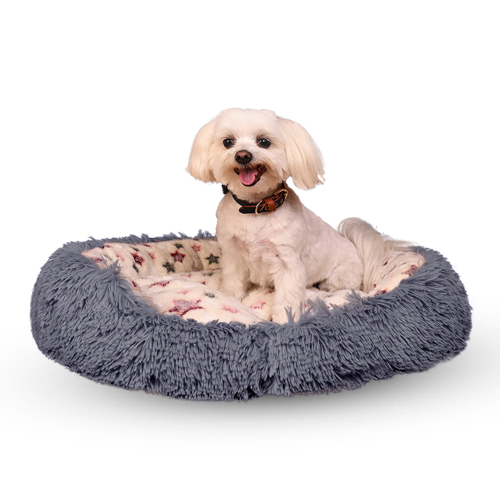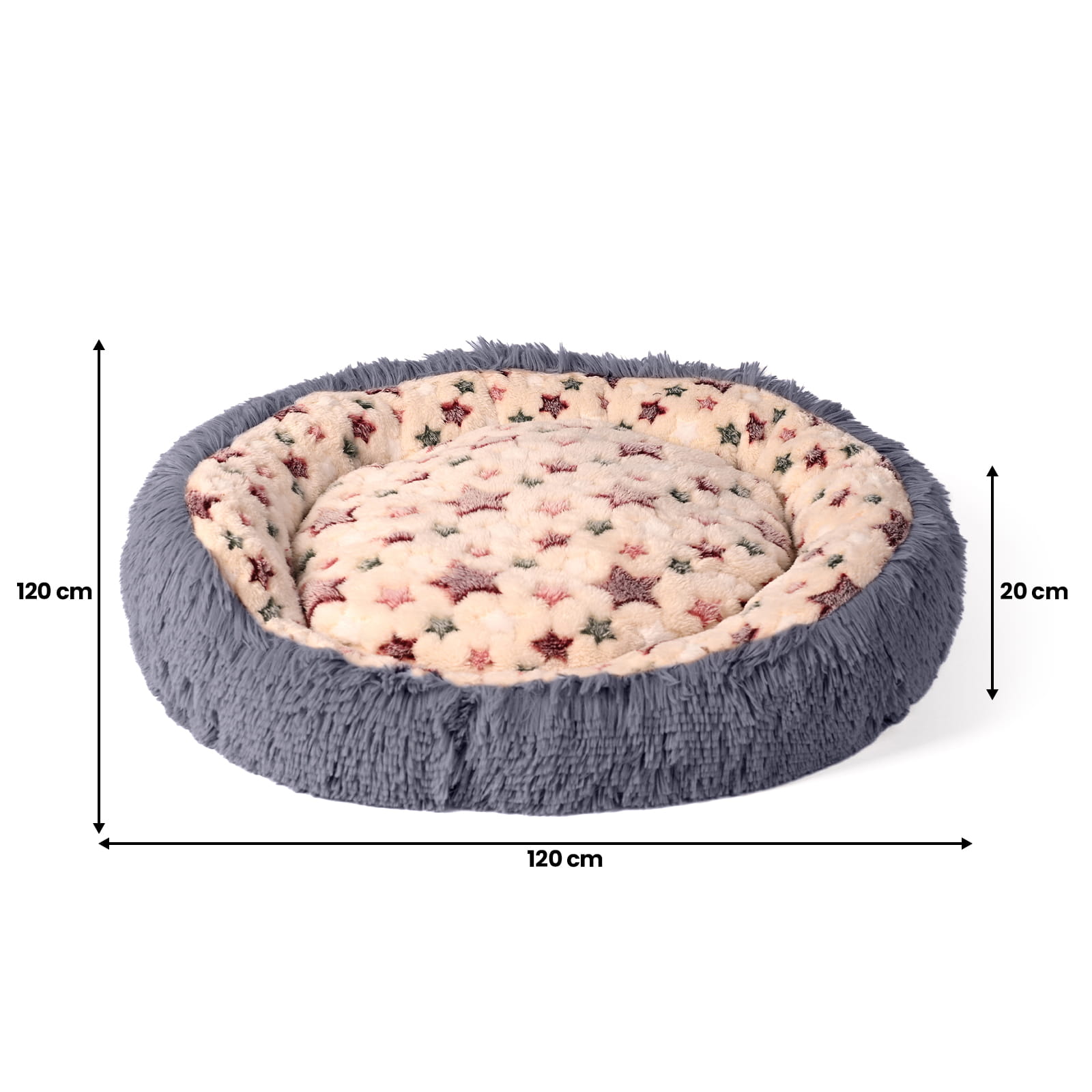 Puszyste legowisko dla psa i kota 120x120 cm XXXL z miękkiej, pluszowej tkaniny z wzorem w gwiazdki FLUFFY – poduszka chmurka szara