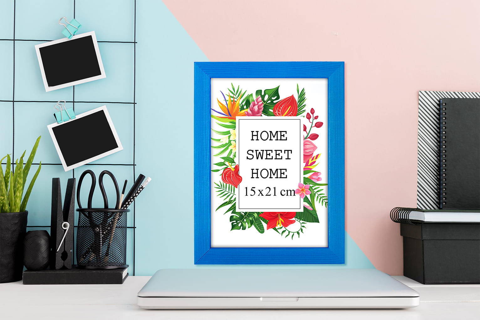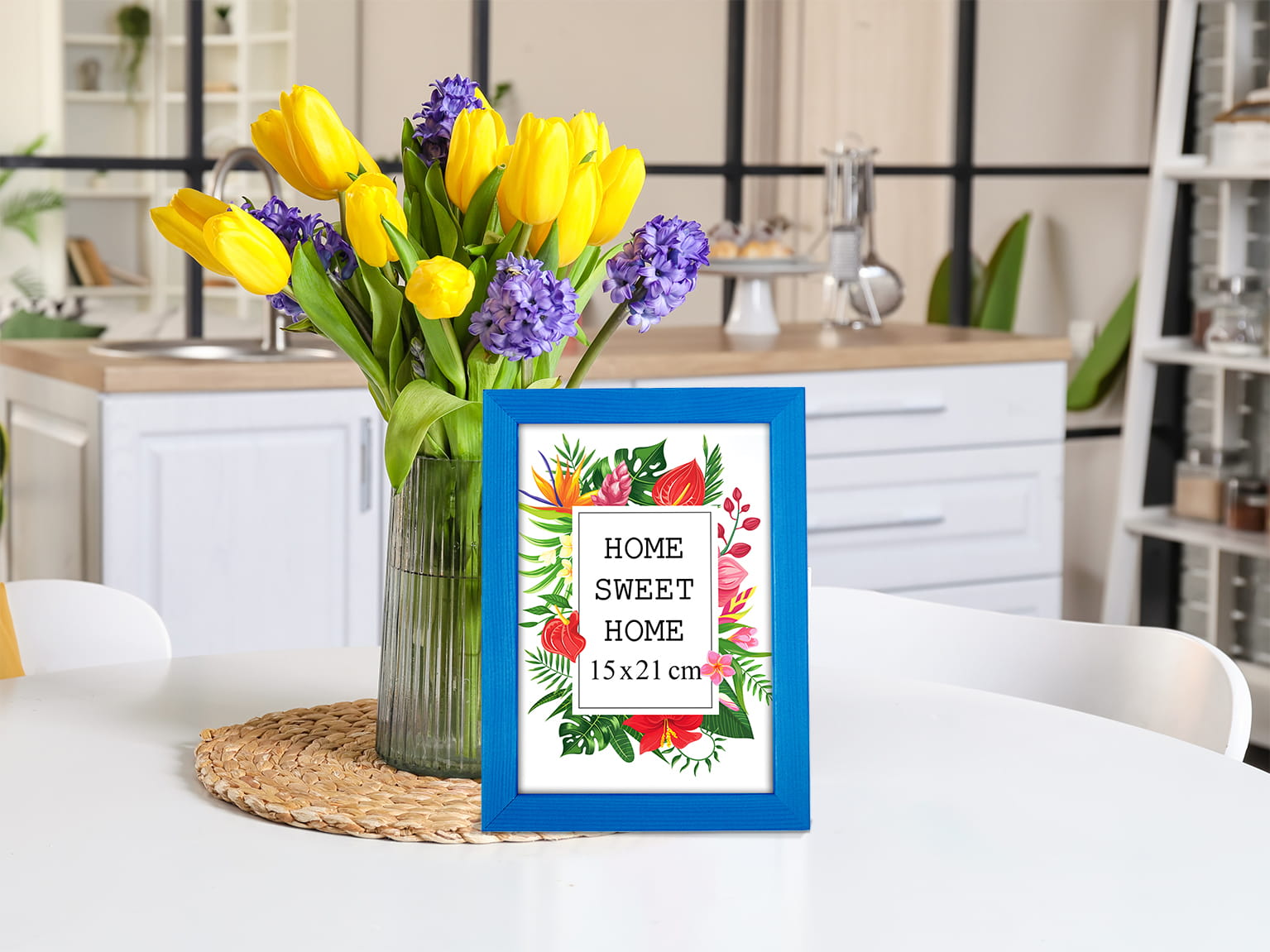Ramka w rozmiarze 15x21 cm w kolorze niebieskim.