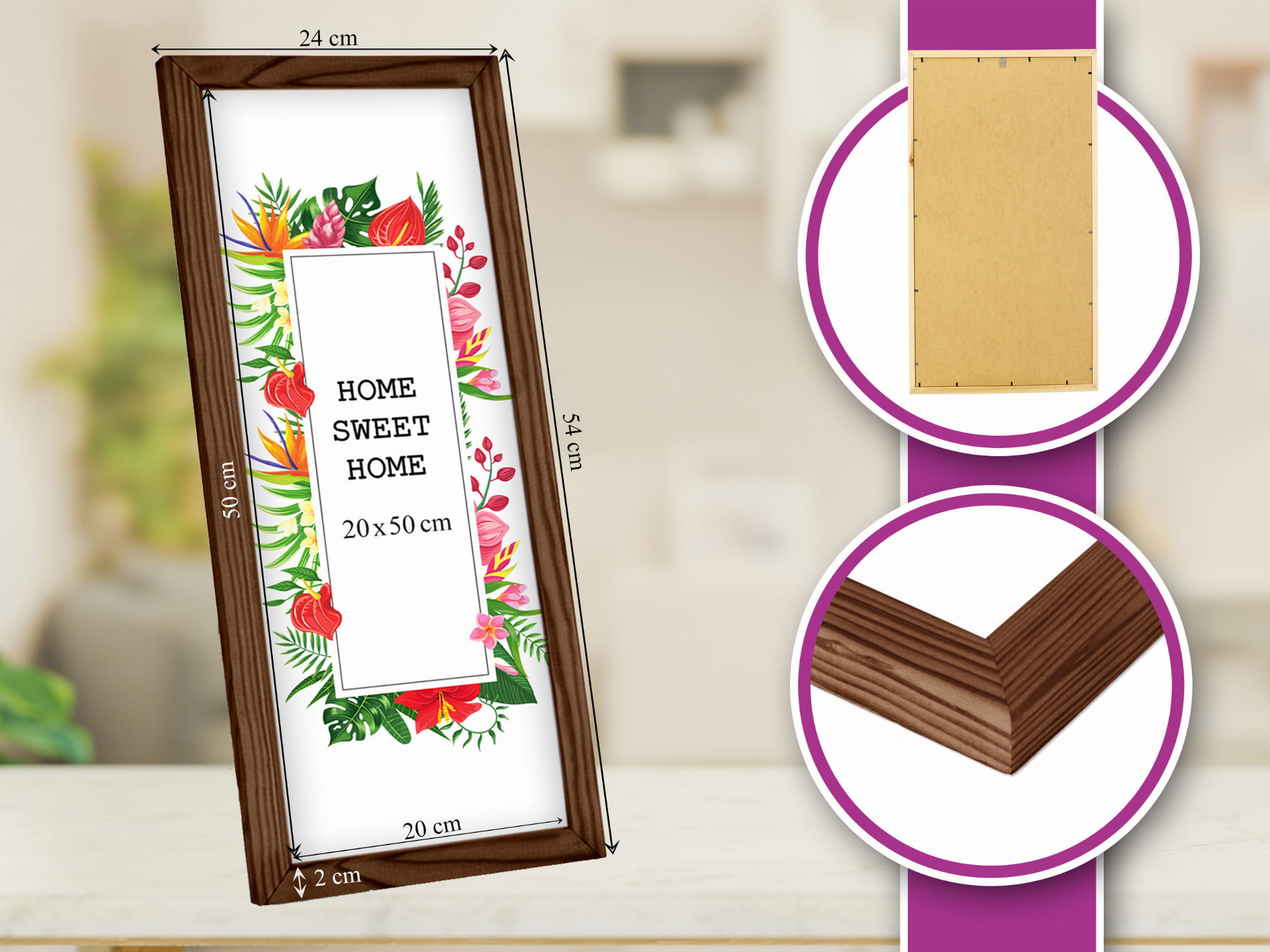 Drewniana ramka w rozmiarze 20x50cm w kolorze brązowym.