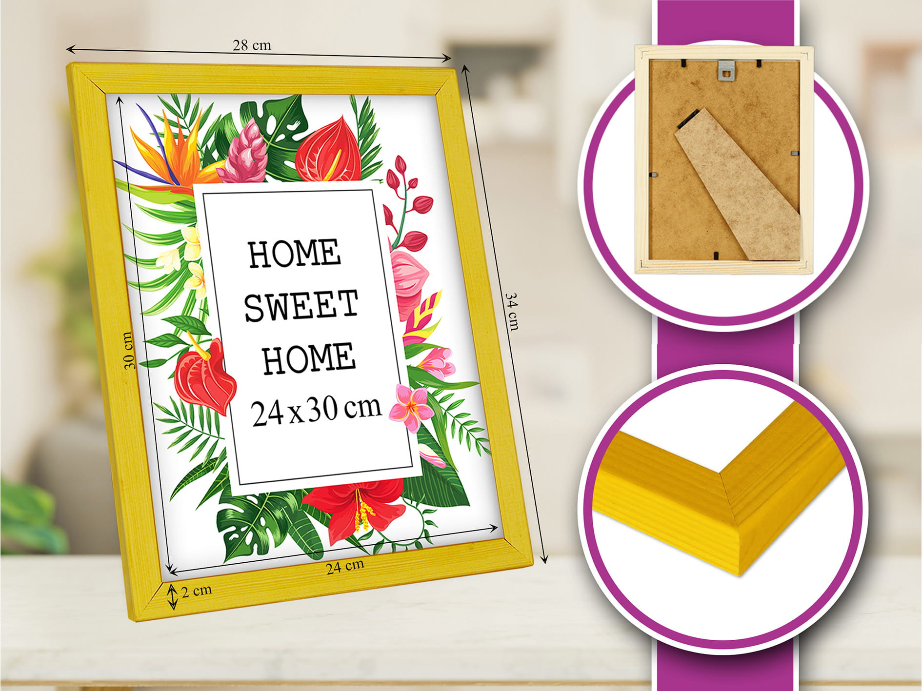 Drewniana ramka w rozmiarze 24cmx30cm w kolorze żółtym.