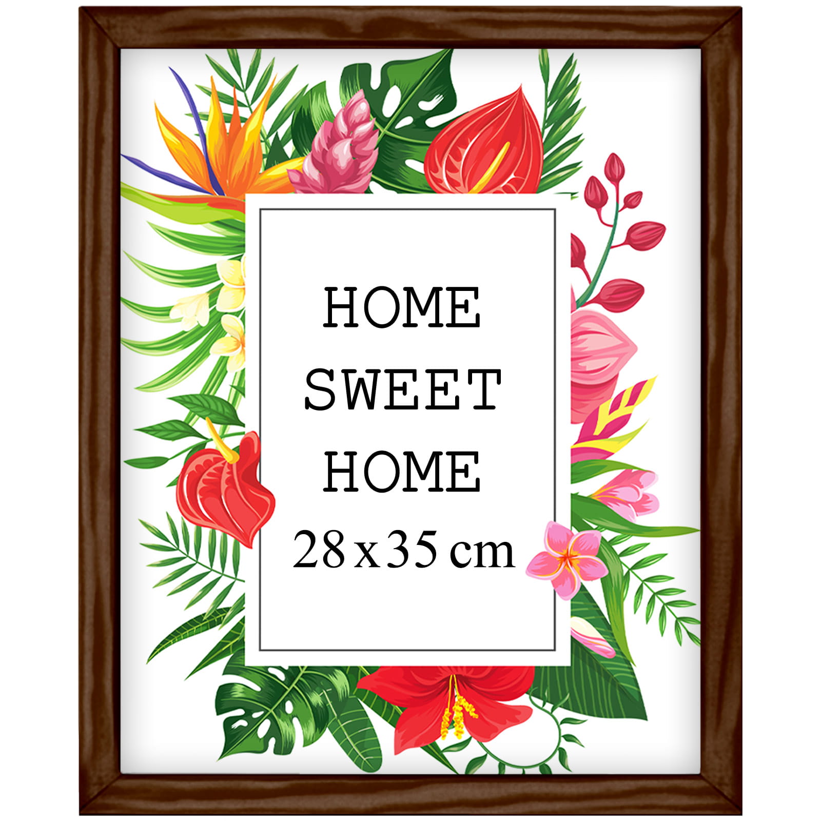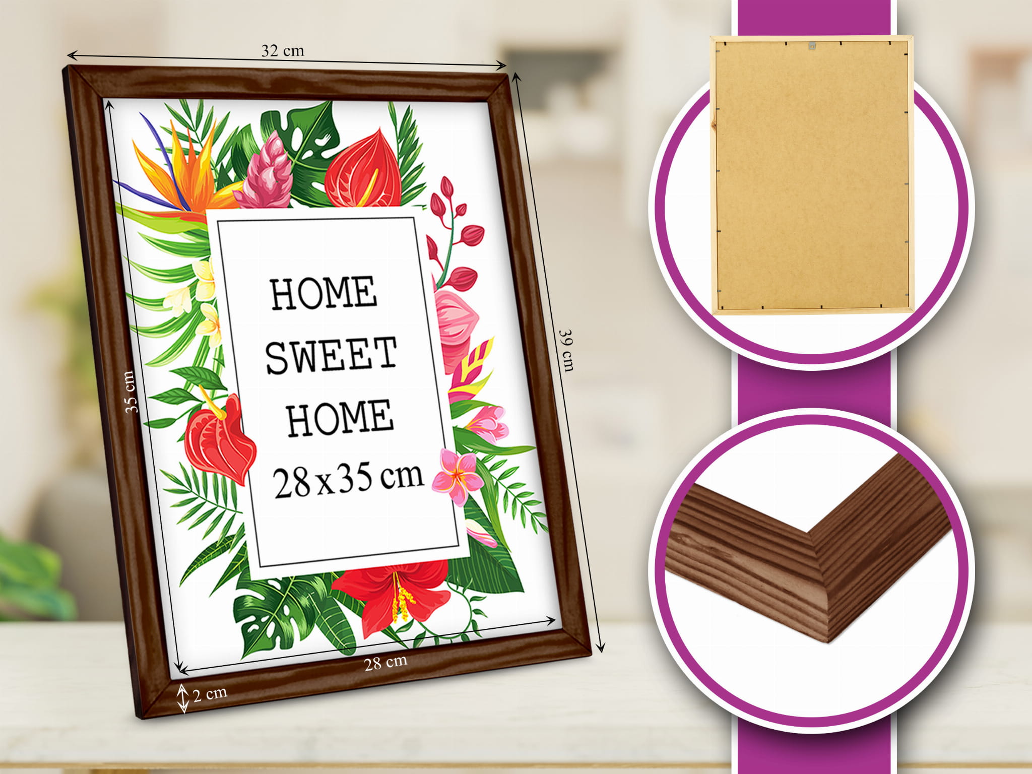 Drewniana ramka w rozmiarze 28cm x 35cm w kolorze brązowym.