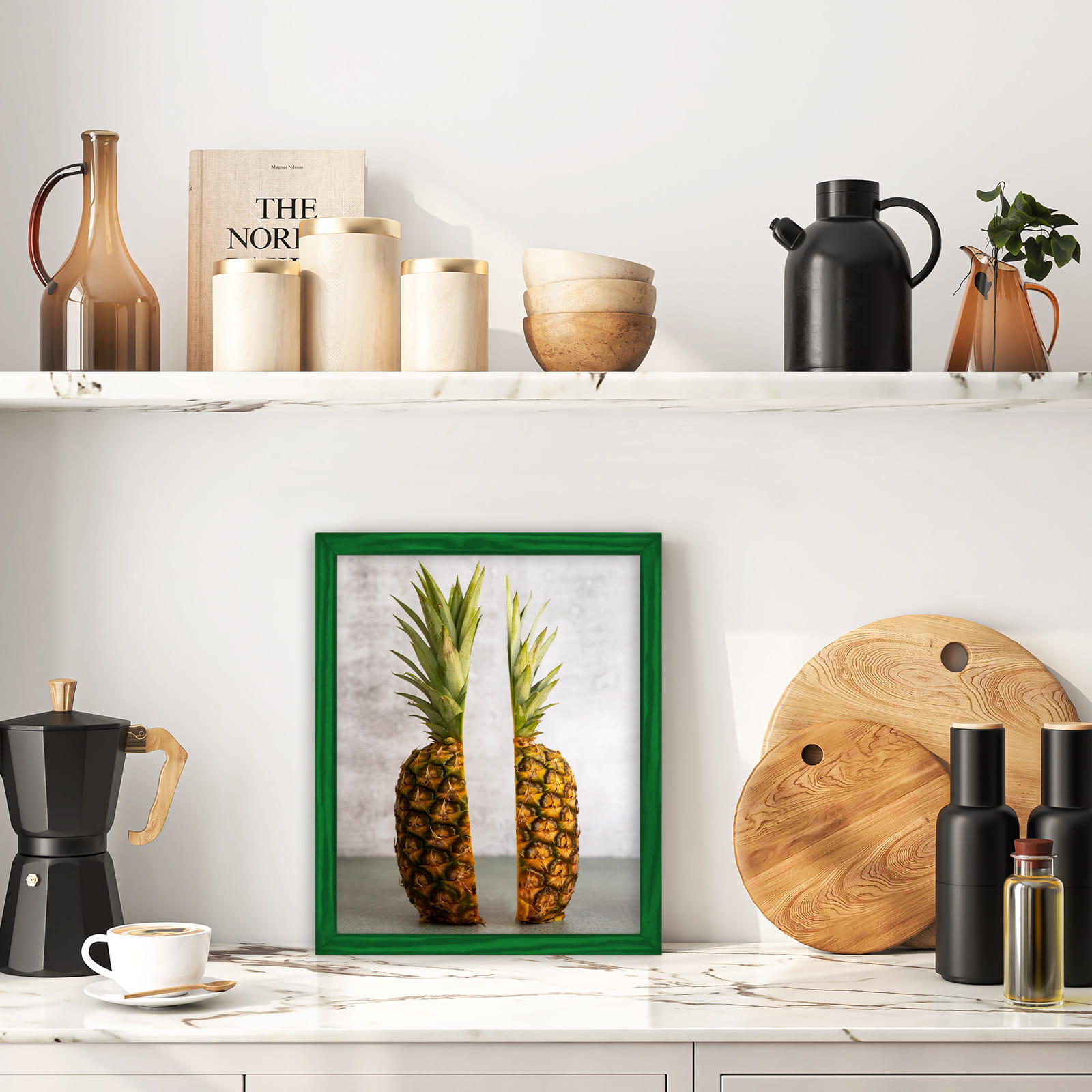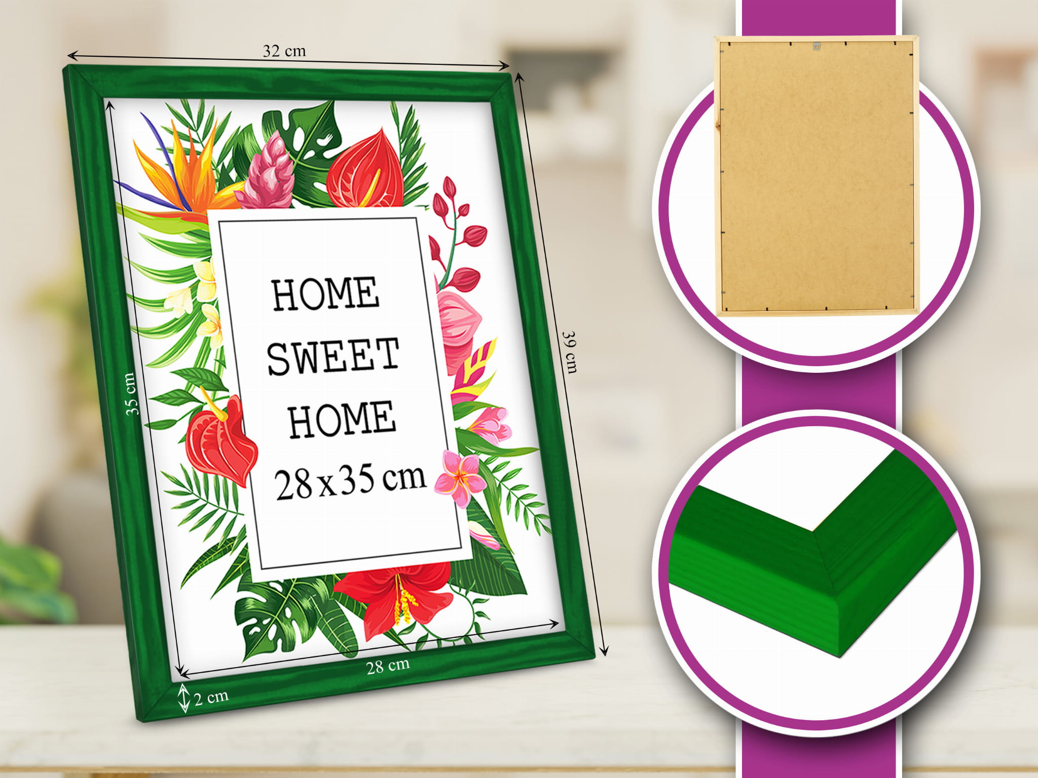 Drewniana ramka w rozmiarze 28cm x 35cm w kolorze zielonym.