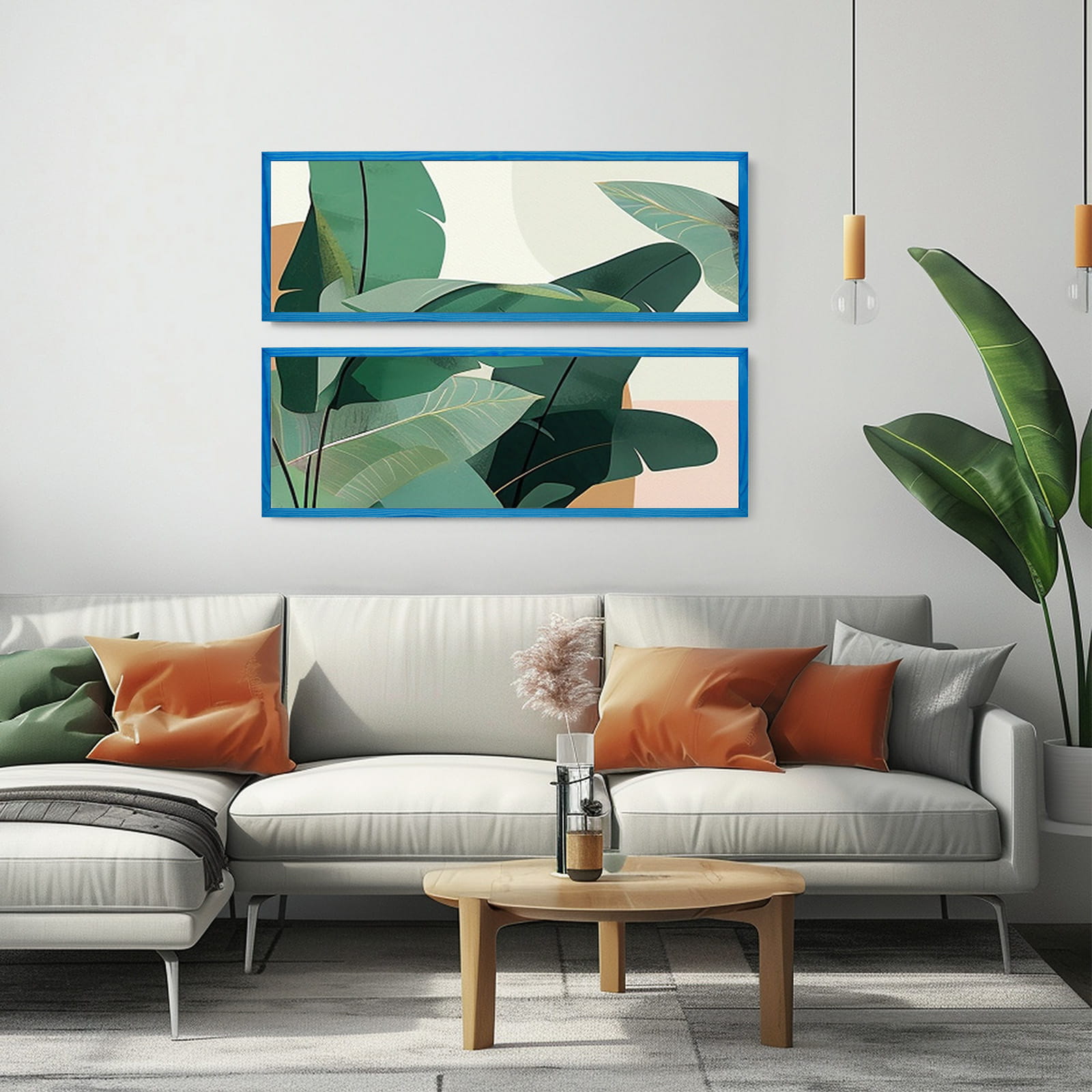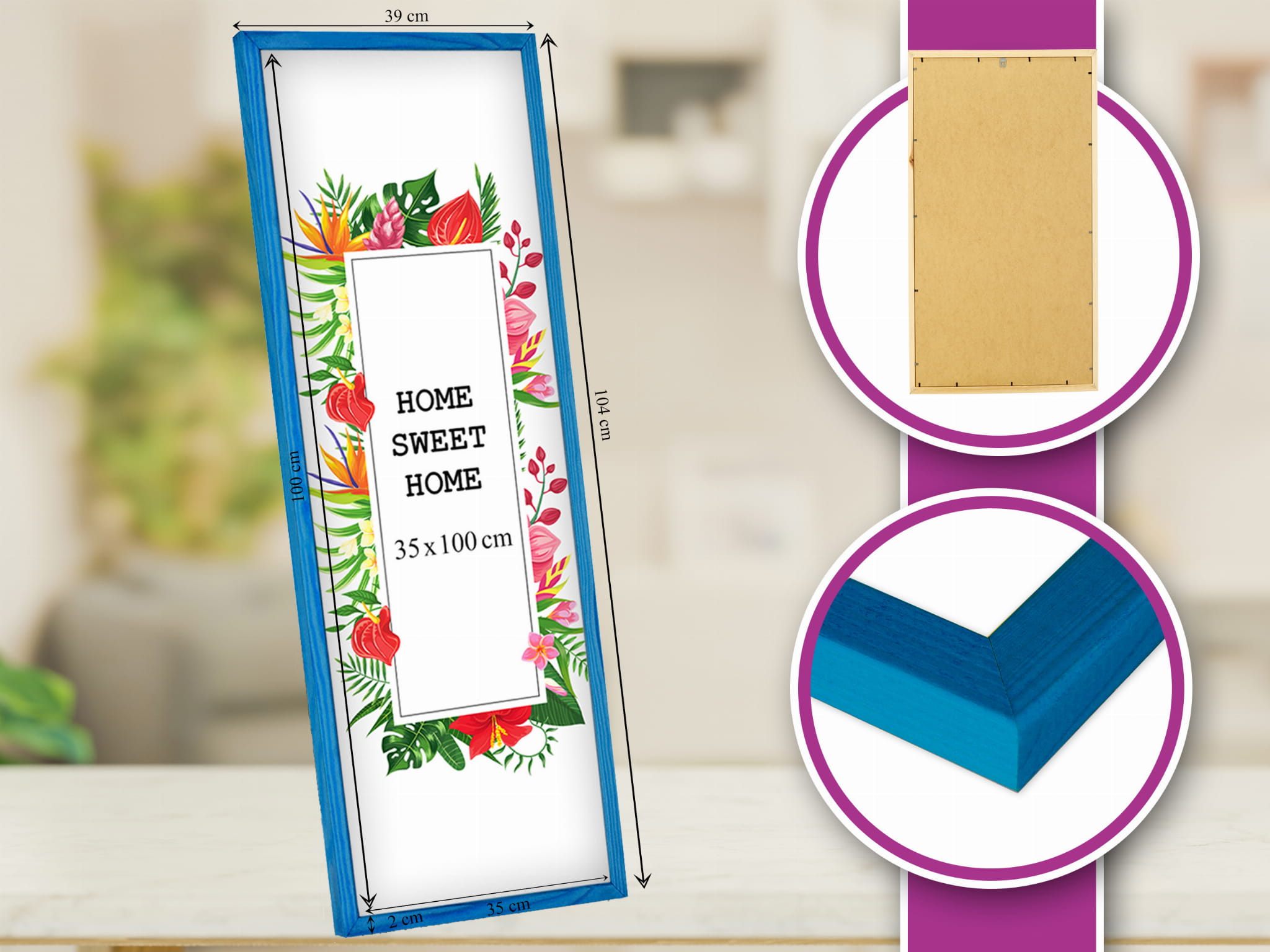 Drewniana ramka w rozmiarze 35x100 cm w kolorze niebieskim.