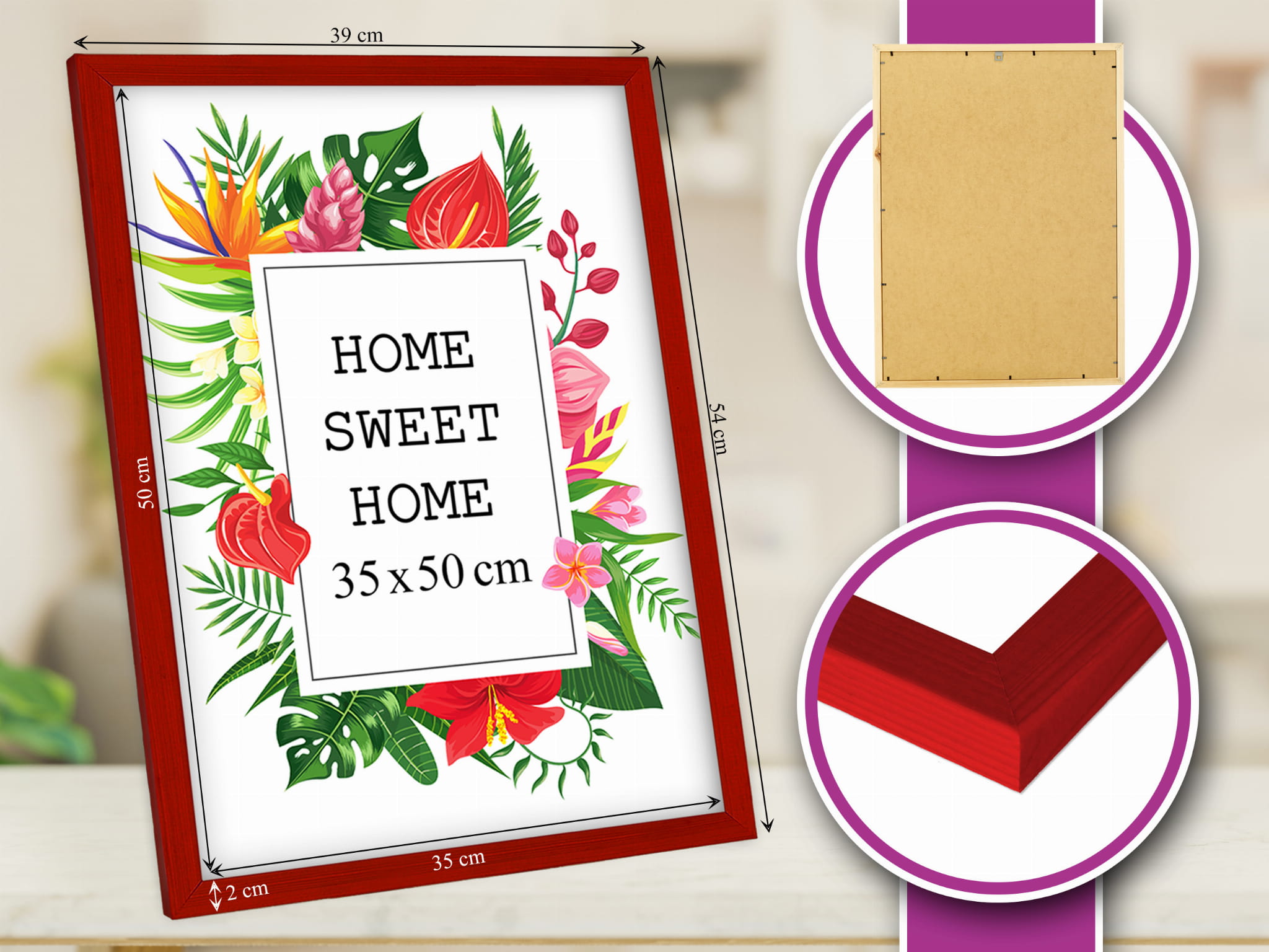 Drewniana ramka w rozmiarze 35cmx50cm w kolorze czerwonym.