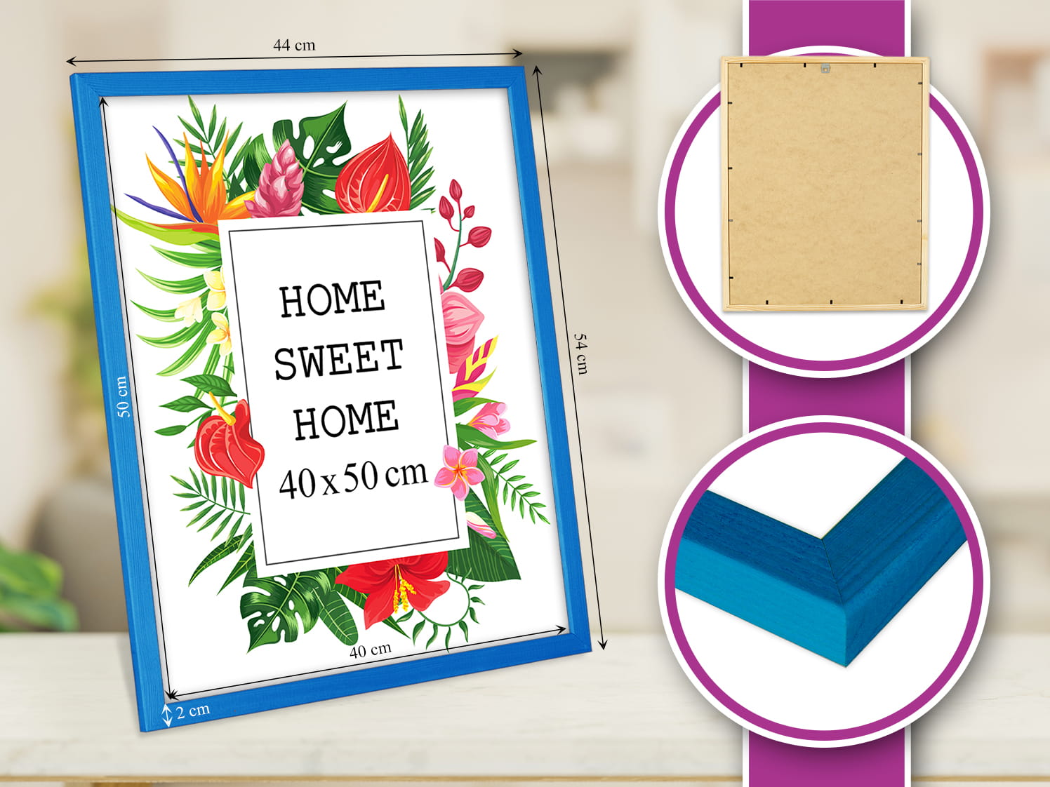 Drewniana ramka w rozmiarze 40cmx50cm w kolorze niebieskim.