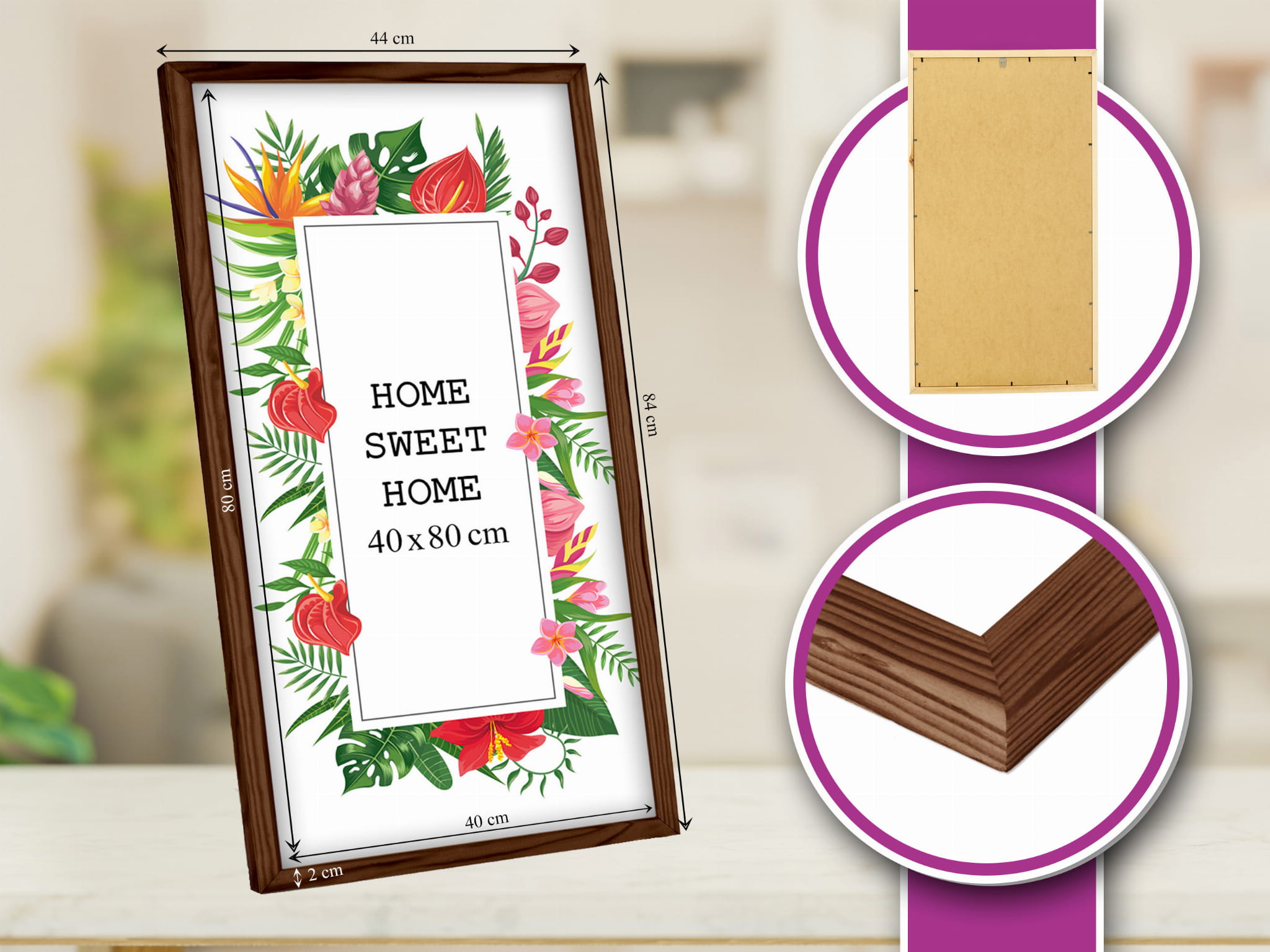 Drewniana ramka w rozmiarze 40x80cm w kolorze brązowym.