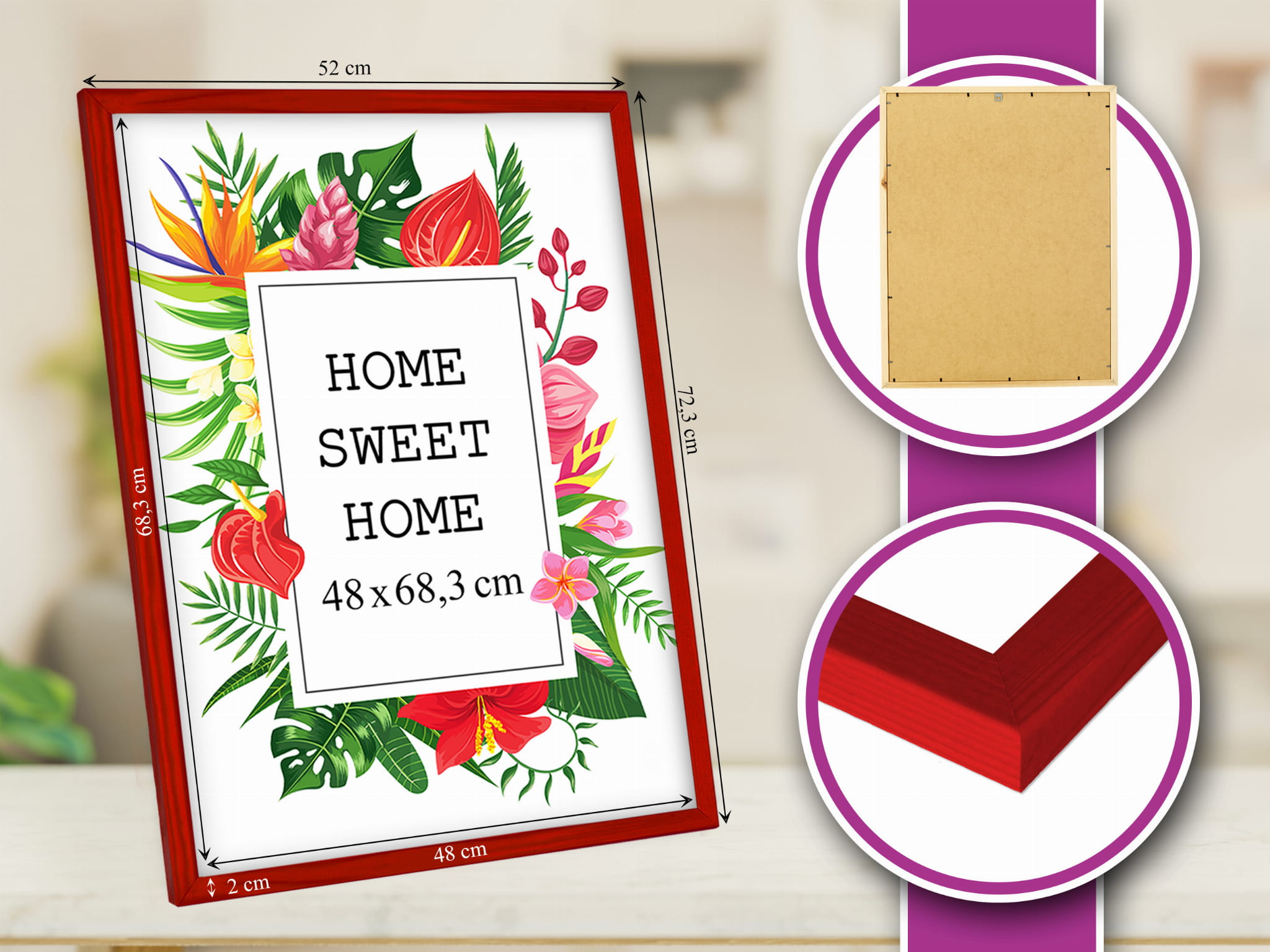 Drewniana ramka w rozmiarze 48cmx68,3cm w kolorze czerwonym.