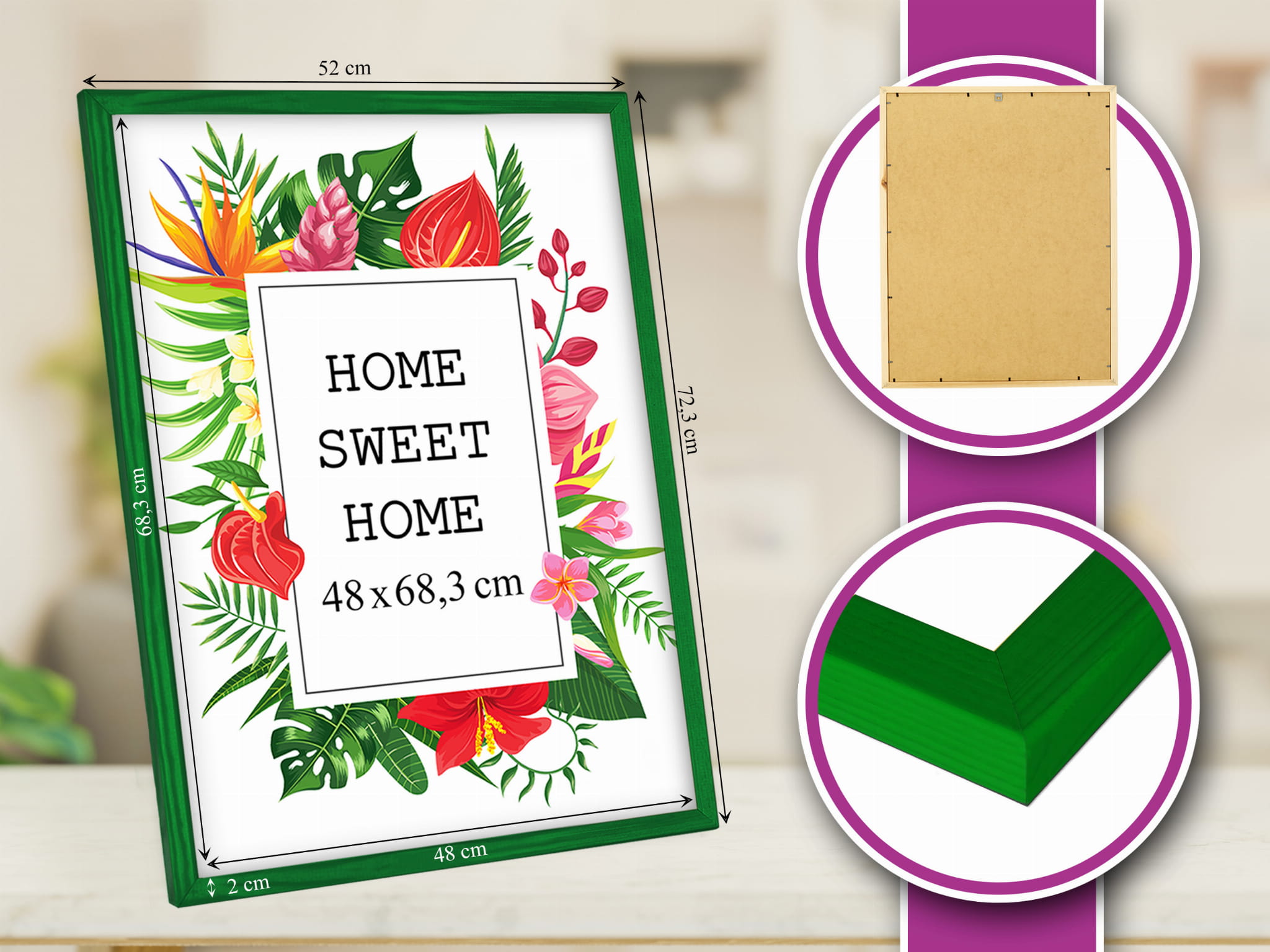 Drewniana ramka w rozmiarze 48cmx68,3cm w kolorze zielonym.