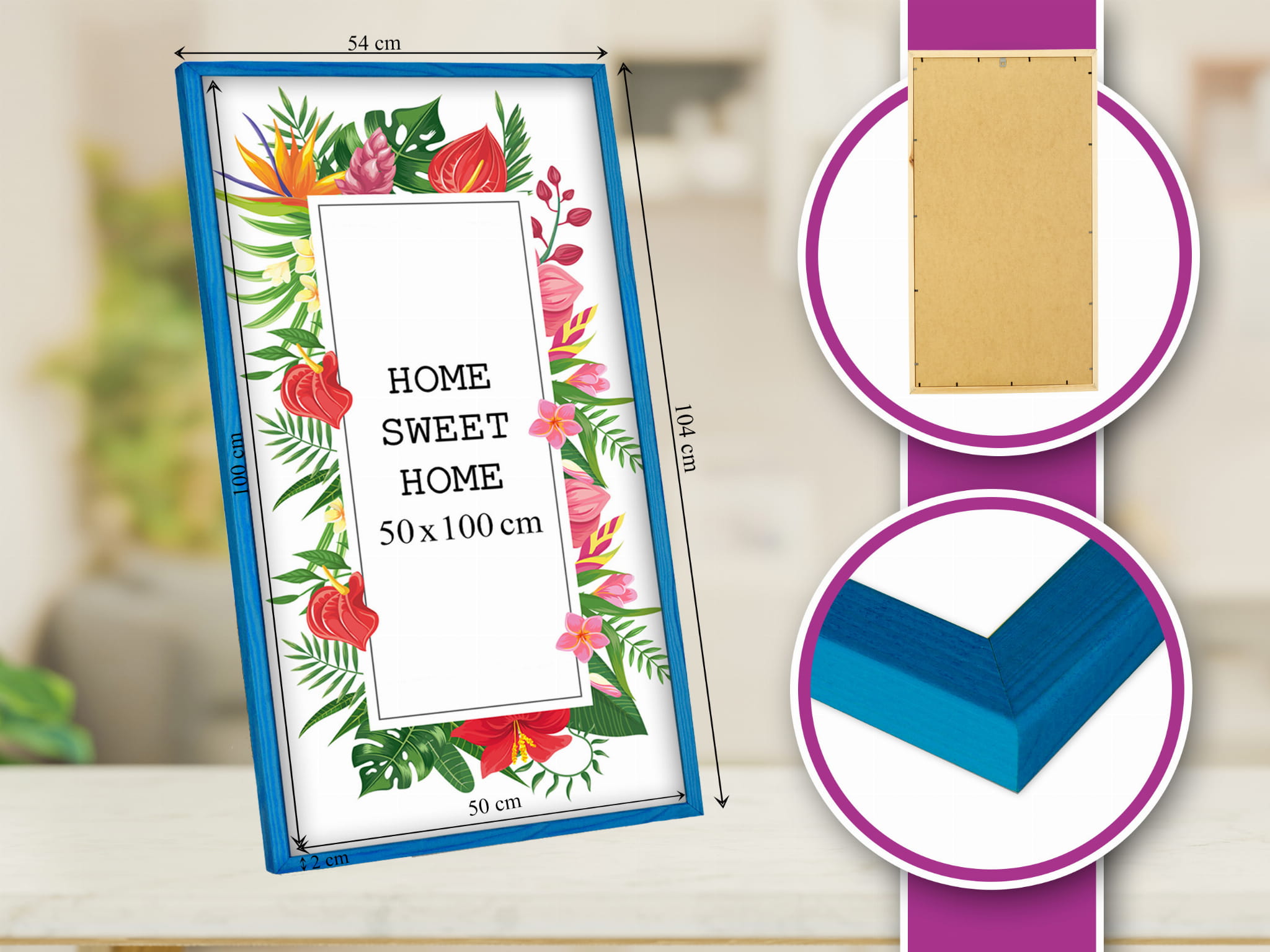 Drewniana ramka w rozmiarze 50x100 cm w kolorze niebieskim.