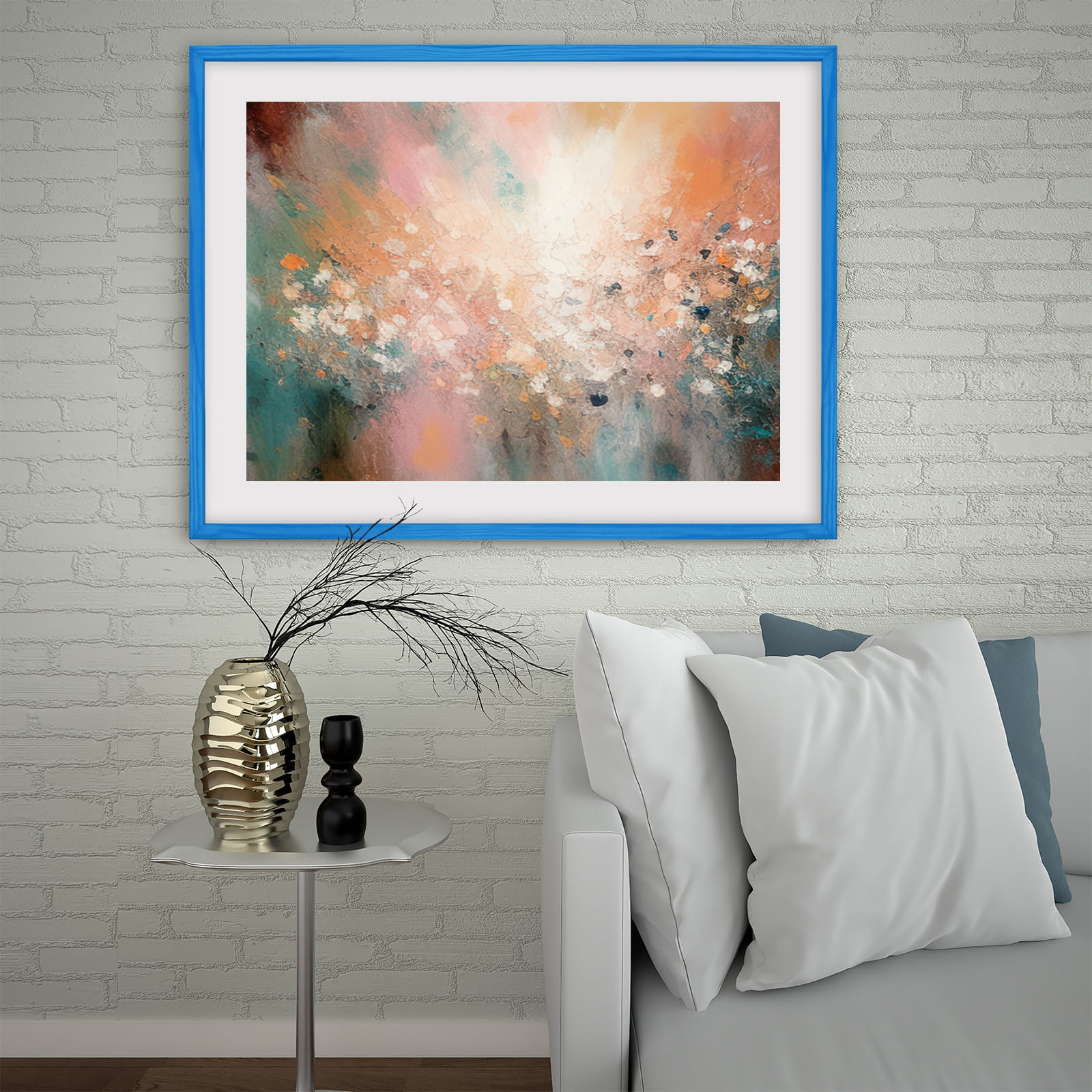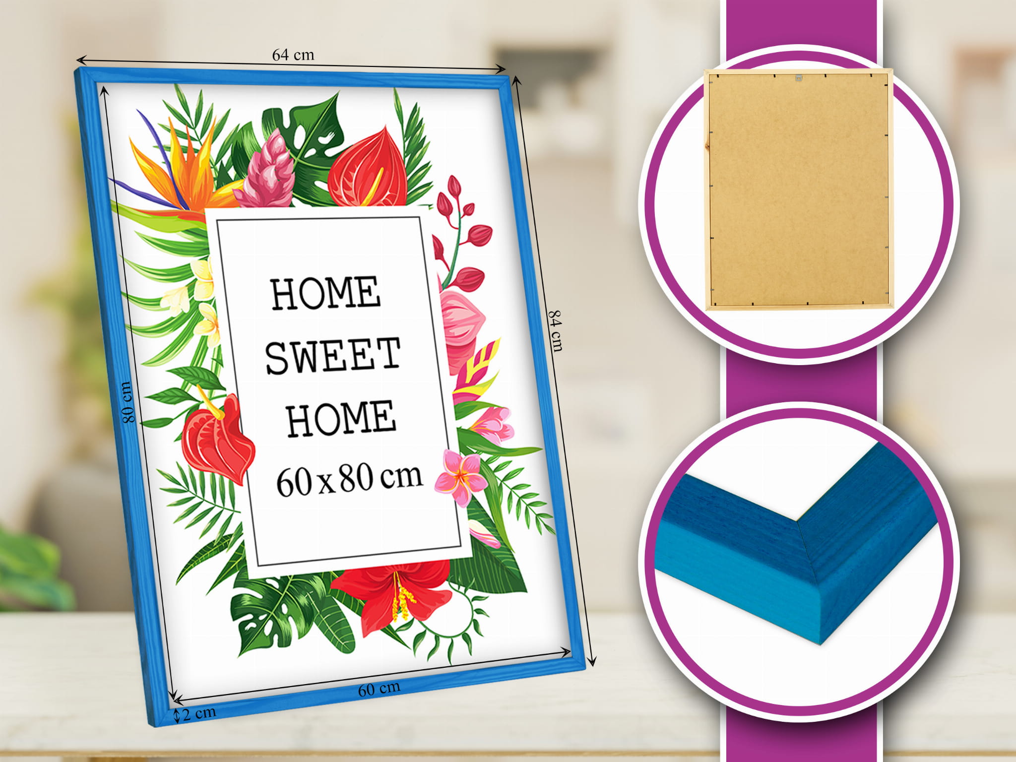 Drewniana ramka w rozmiarze 60cm x 80cm w kolorze niebieskim.