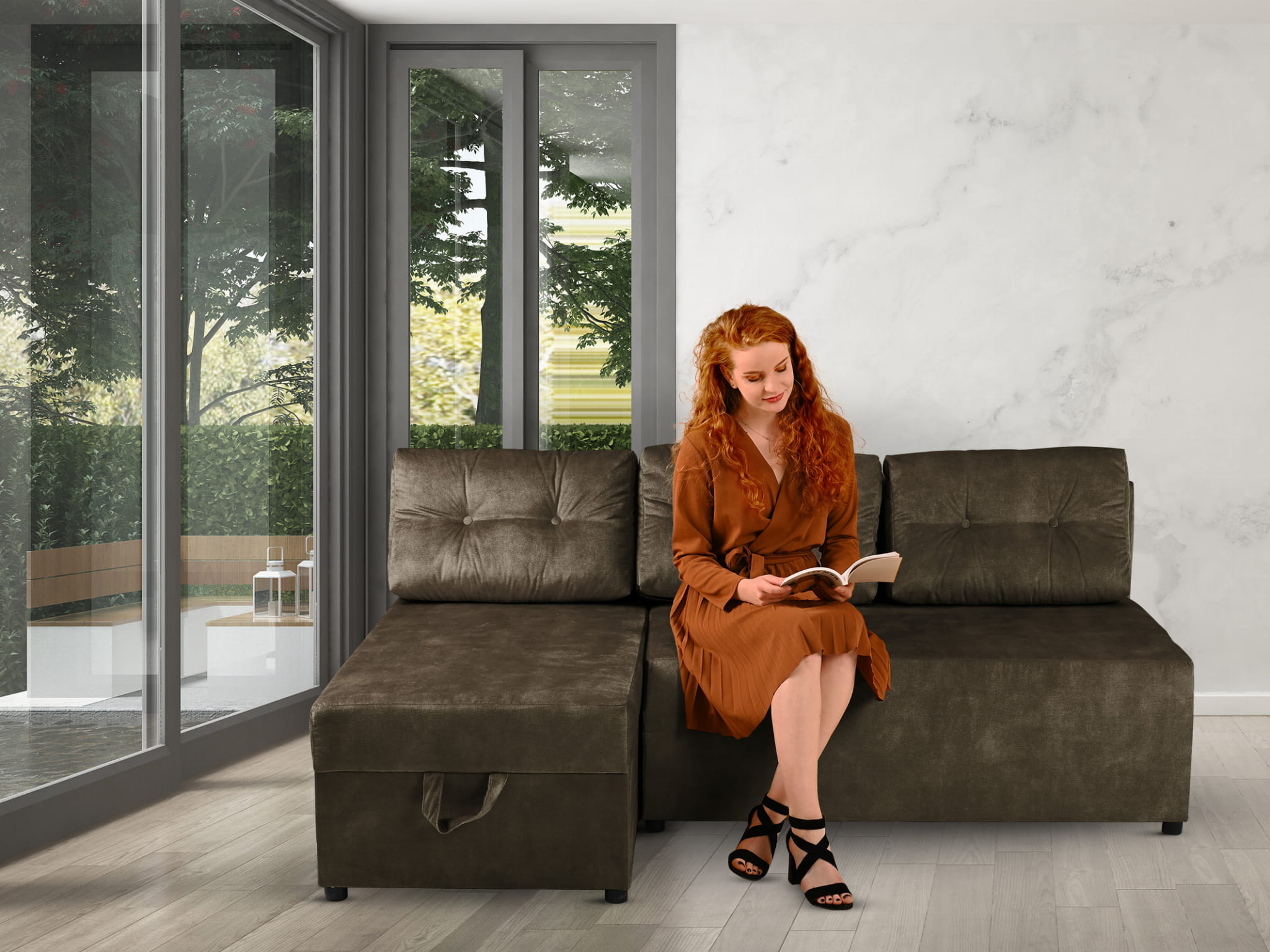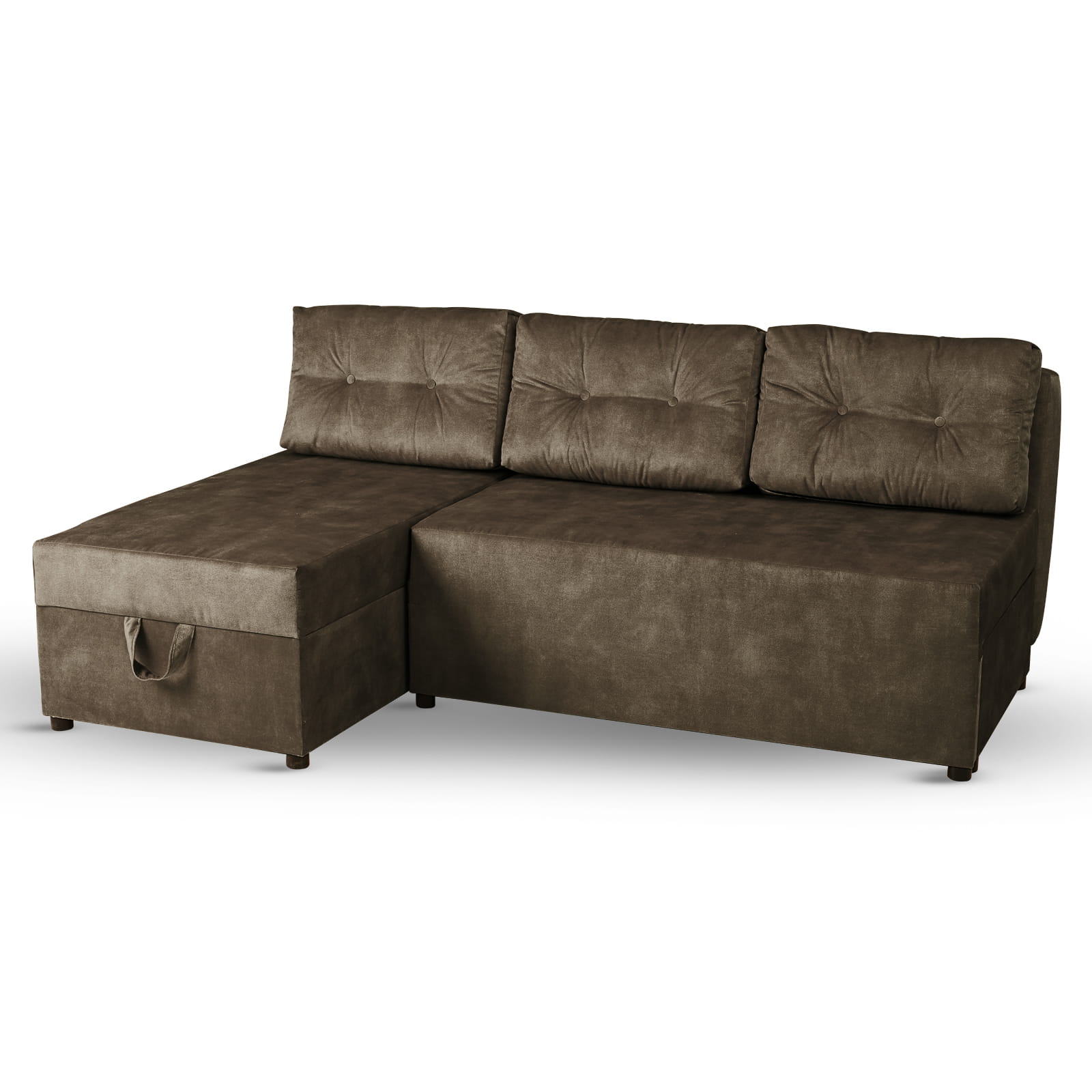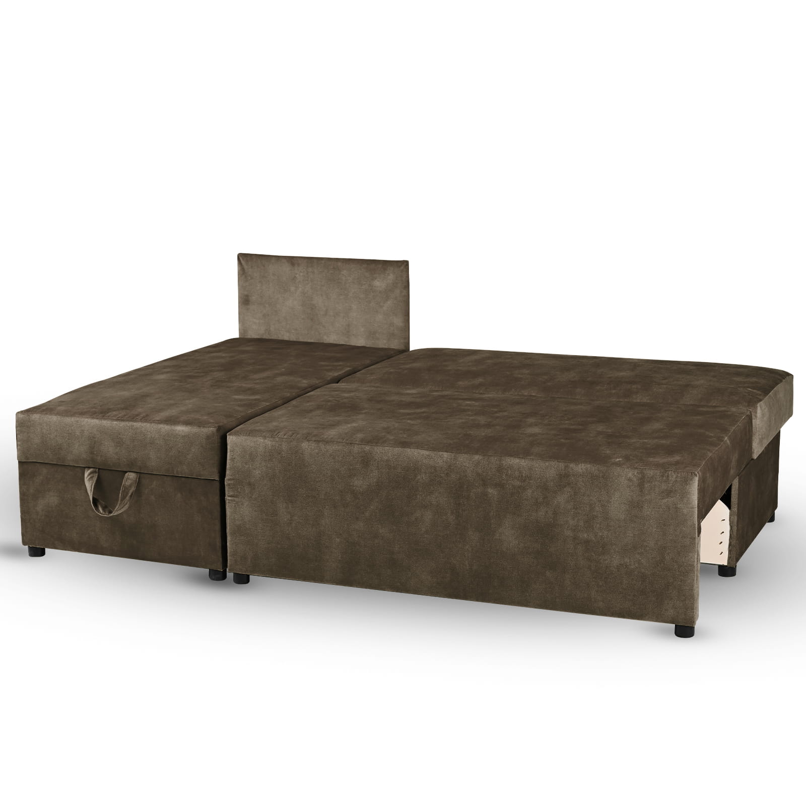 Rozkładany narożnik ALAN lewy z welurowej tkaniny w kolorze ciemnobrązowym z funkcją spania i dwoma pojemnikami na pościel