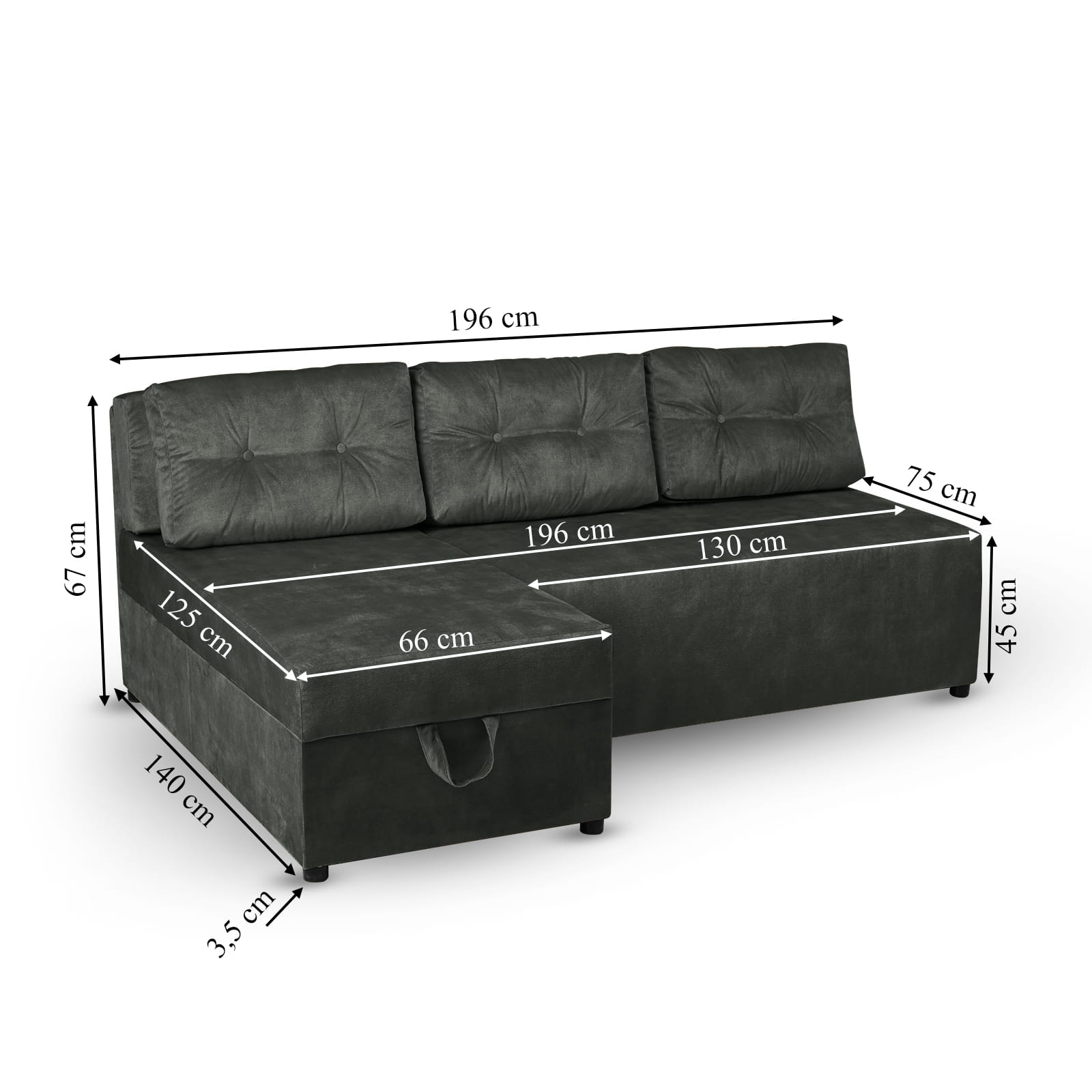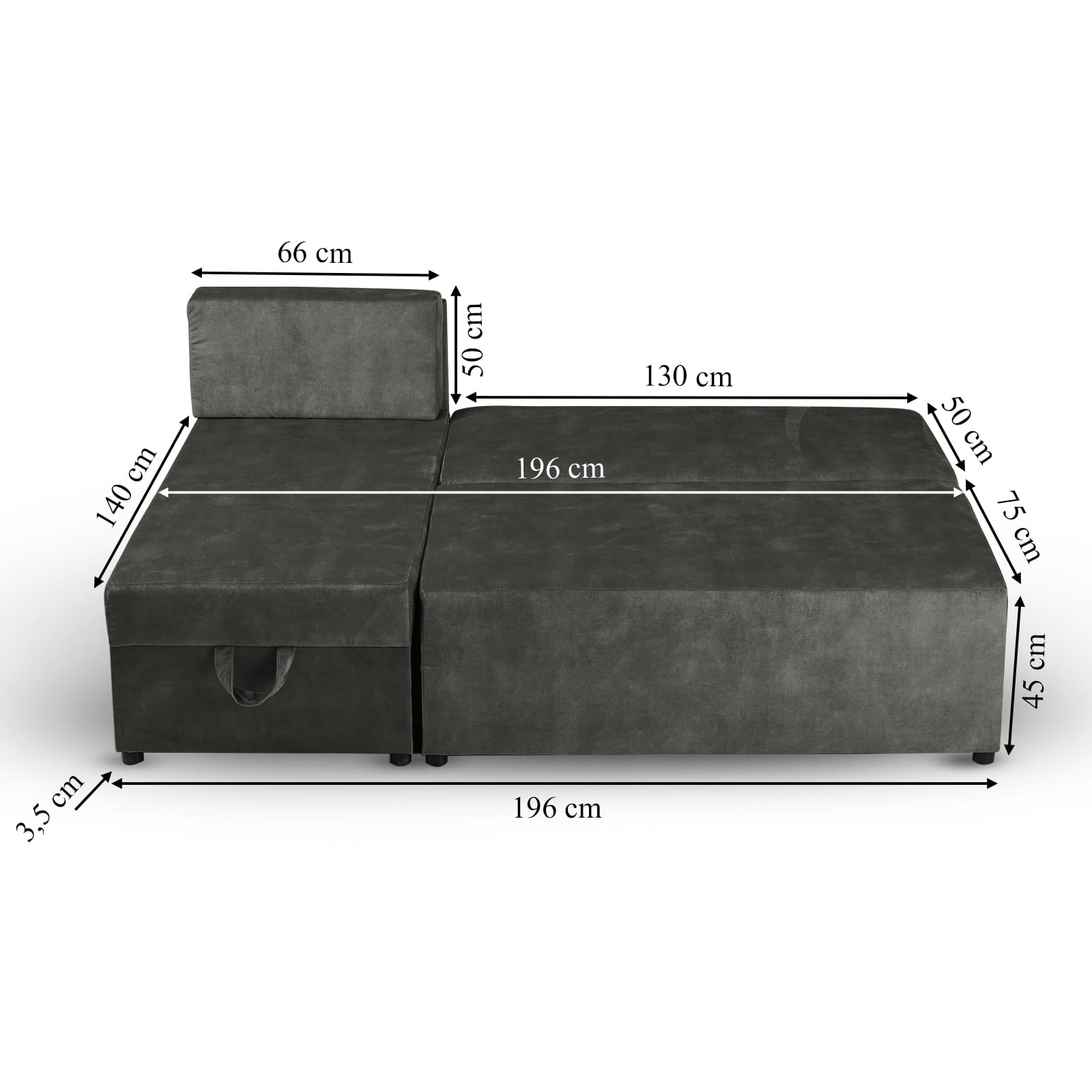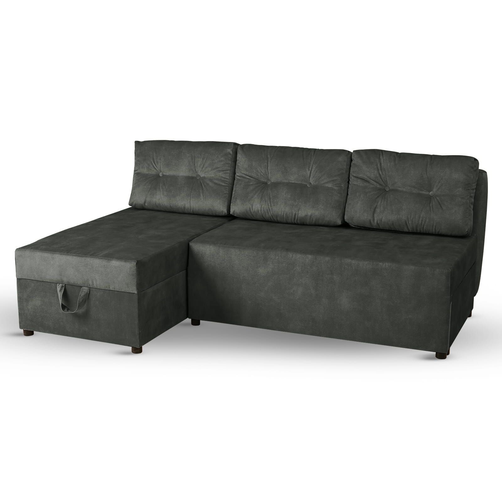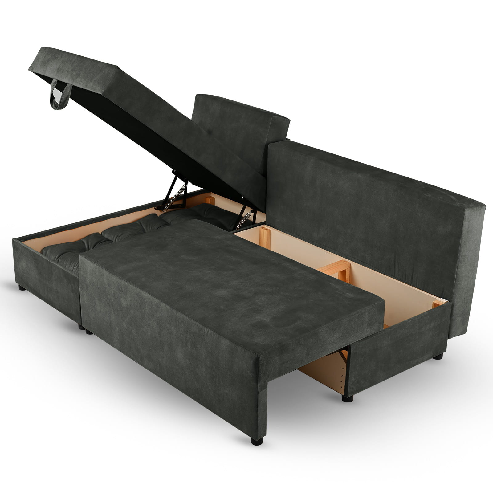 Rozkładany narożnik ALAN lewy z welurowej tkaniny w kolorze ciemnoszarym z funkcją spania i dwoma pojemnikami na pościel
