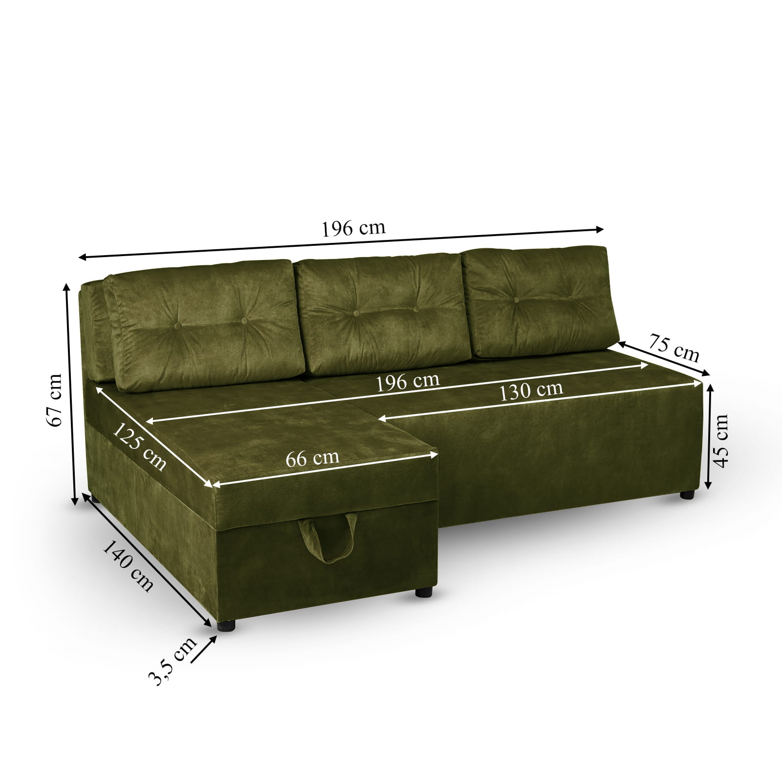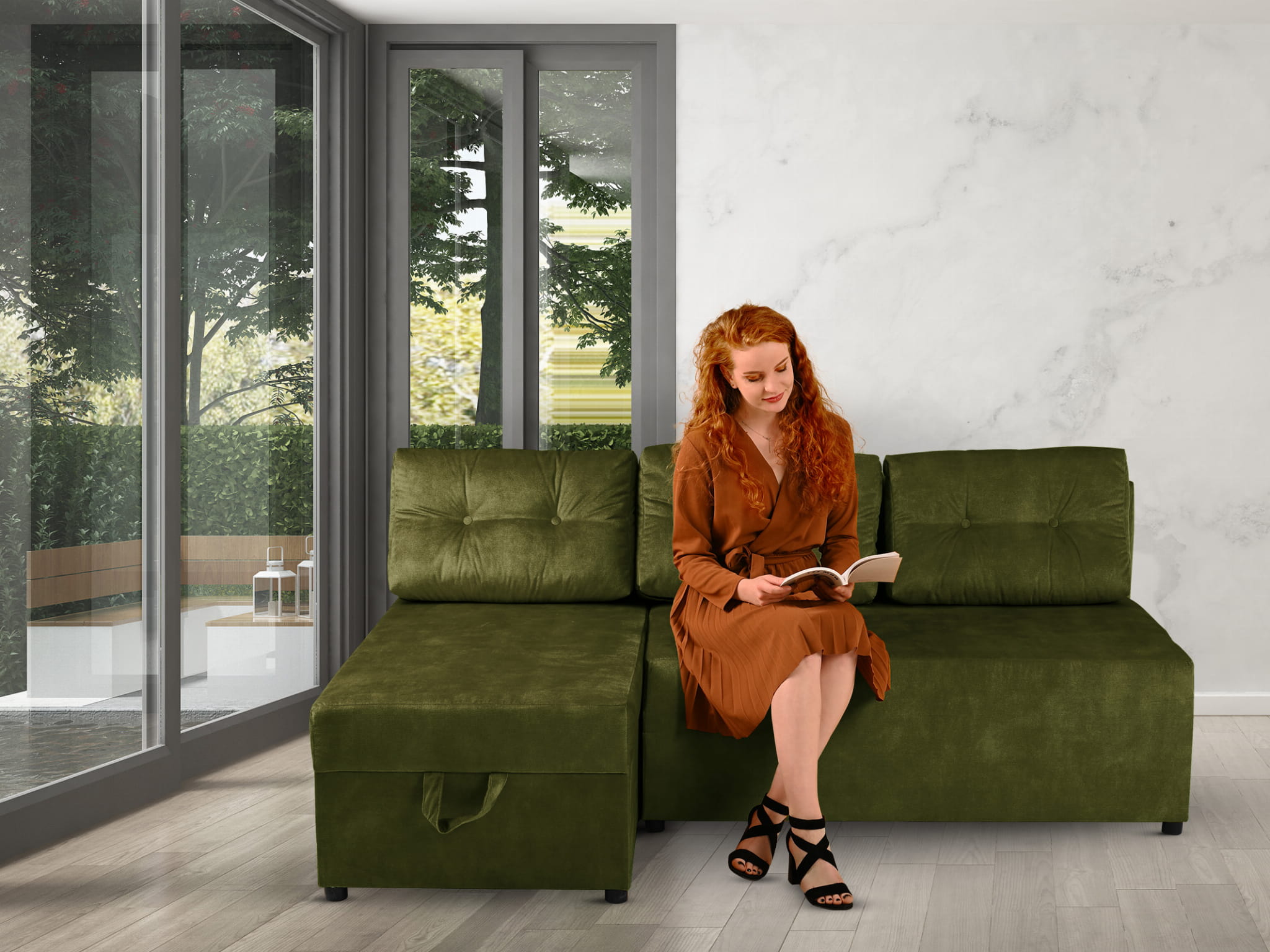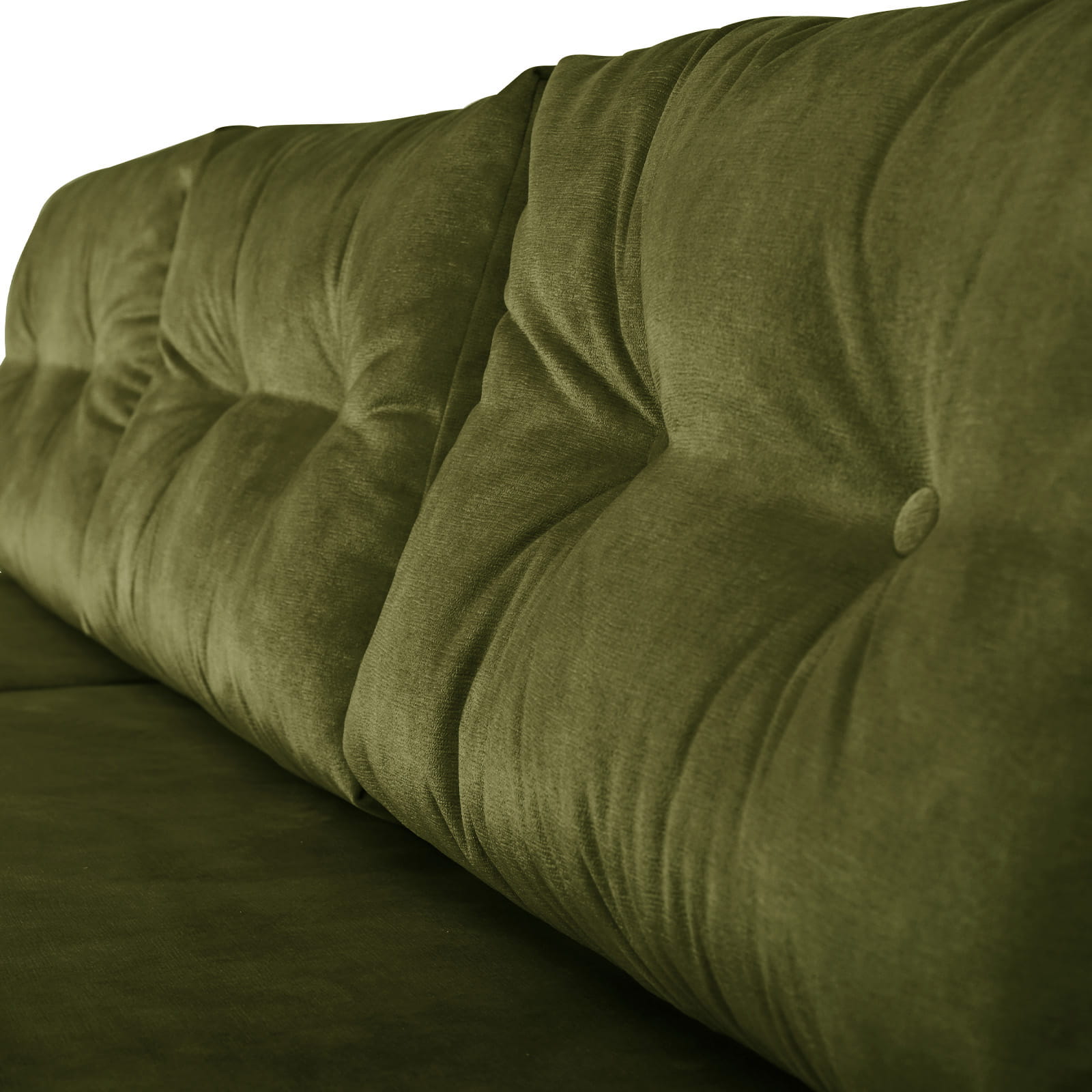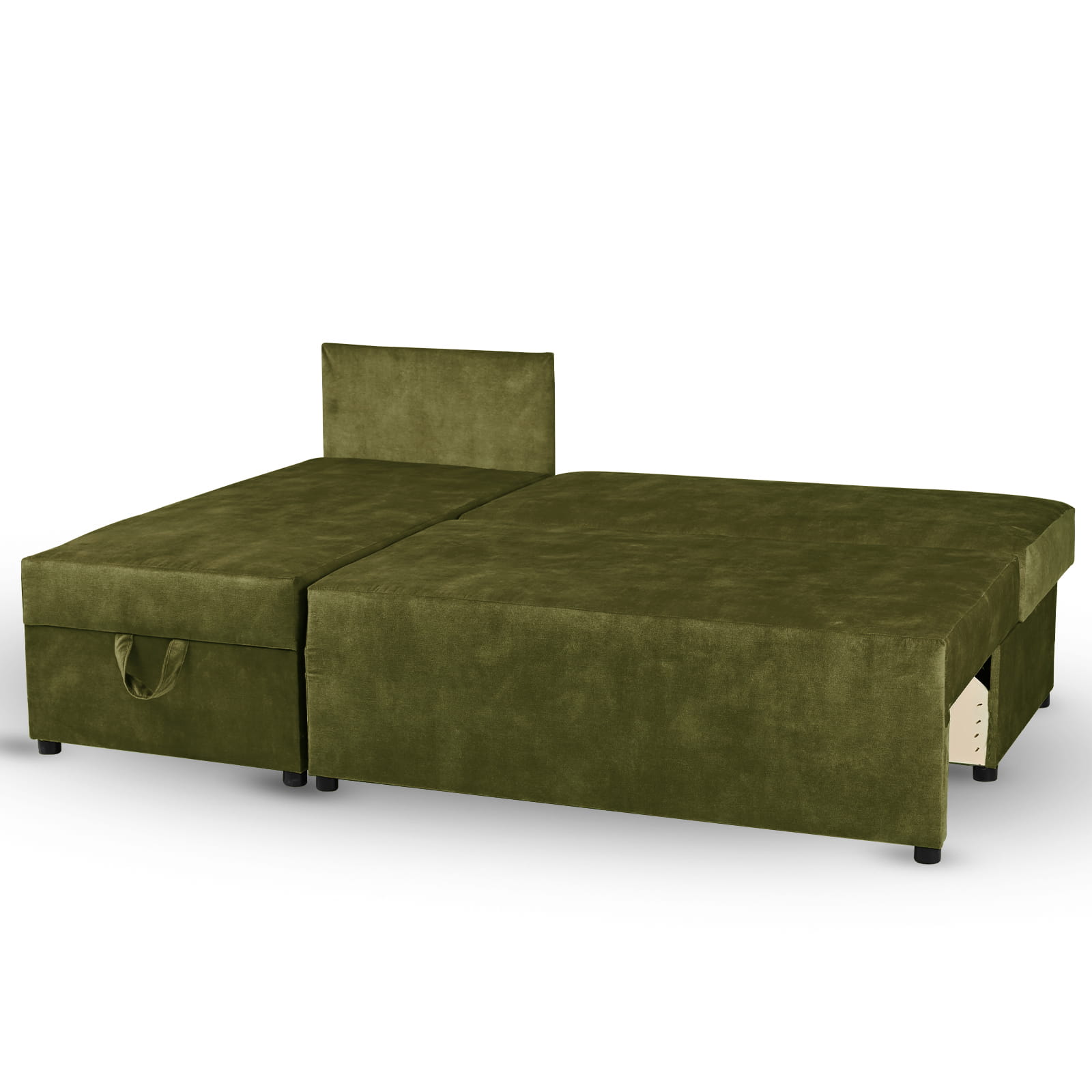 Rozkładany narożnik ALAN lewy z welurowej tkaniny w kolorze oliwkowym z funkcją spania i dwoma pojemnikami na pościel
