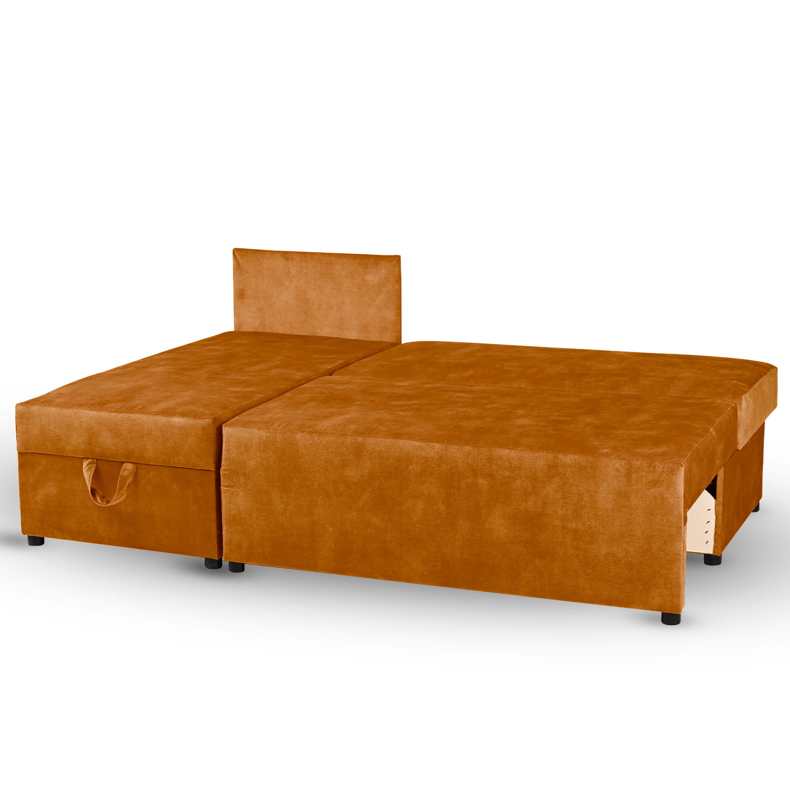 Rozkładany narożnik ALAN lewy z welurowej tkaniny w kolorze pomarańczowym z funkcją spania i dwoma pojemnikami na pościel