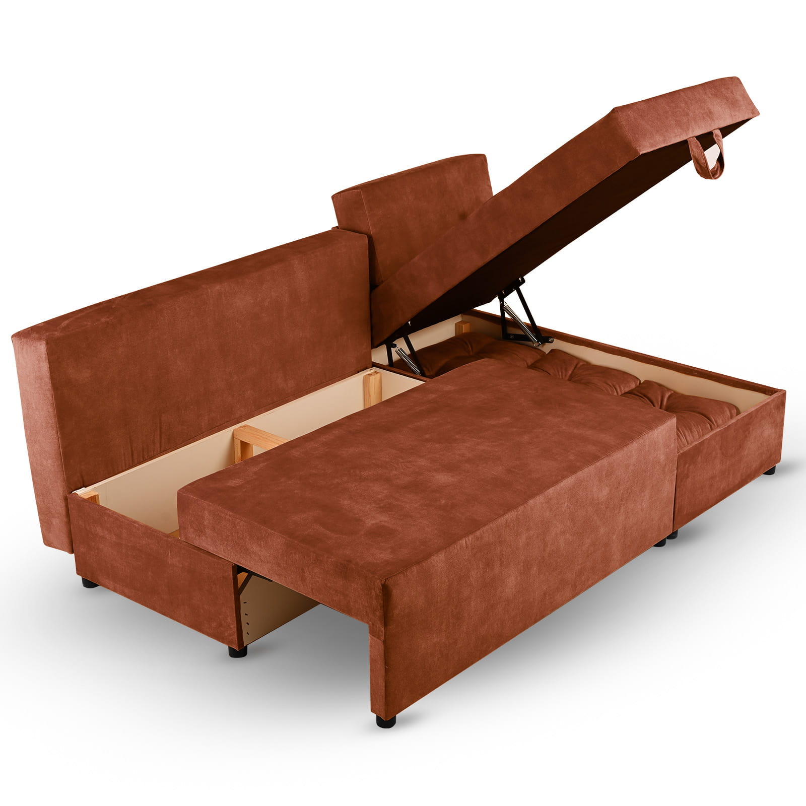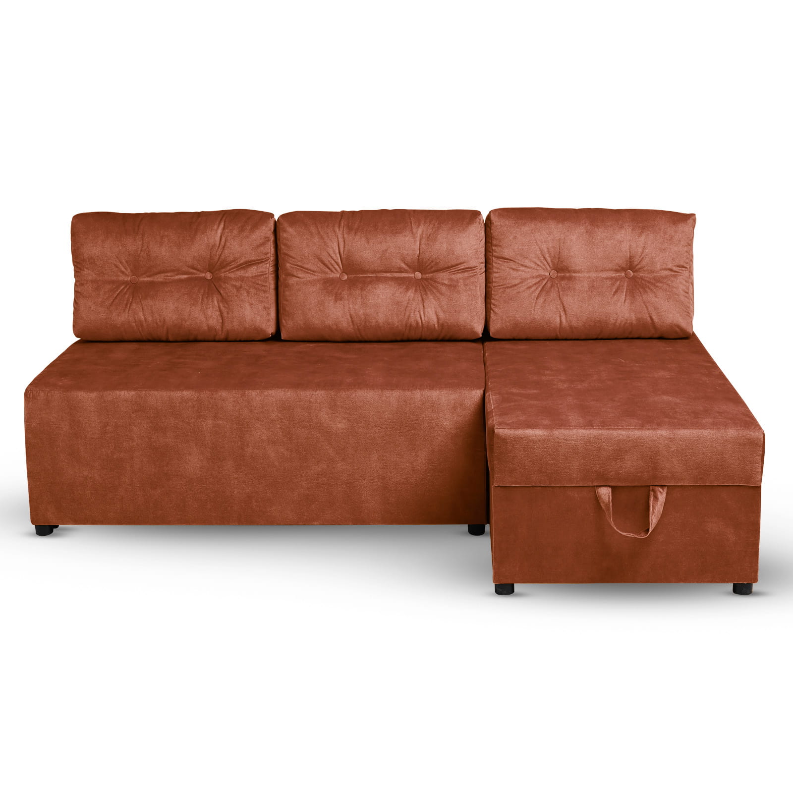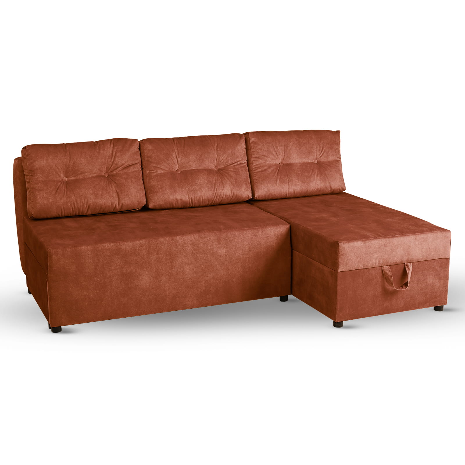 Rozkładany narożnik ALAN prawy z welurowej tkaniny w kolorze ciemnopomarńczowym z funkcją spania i dwoma pojemnikami na pościel