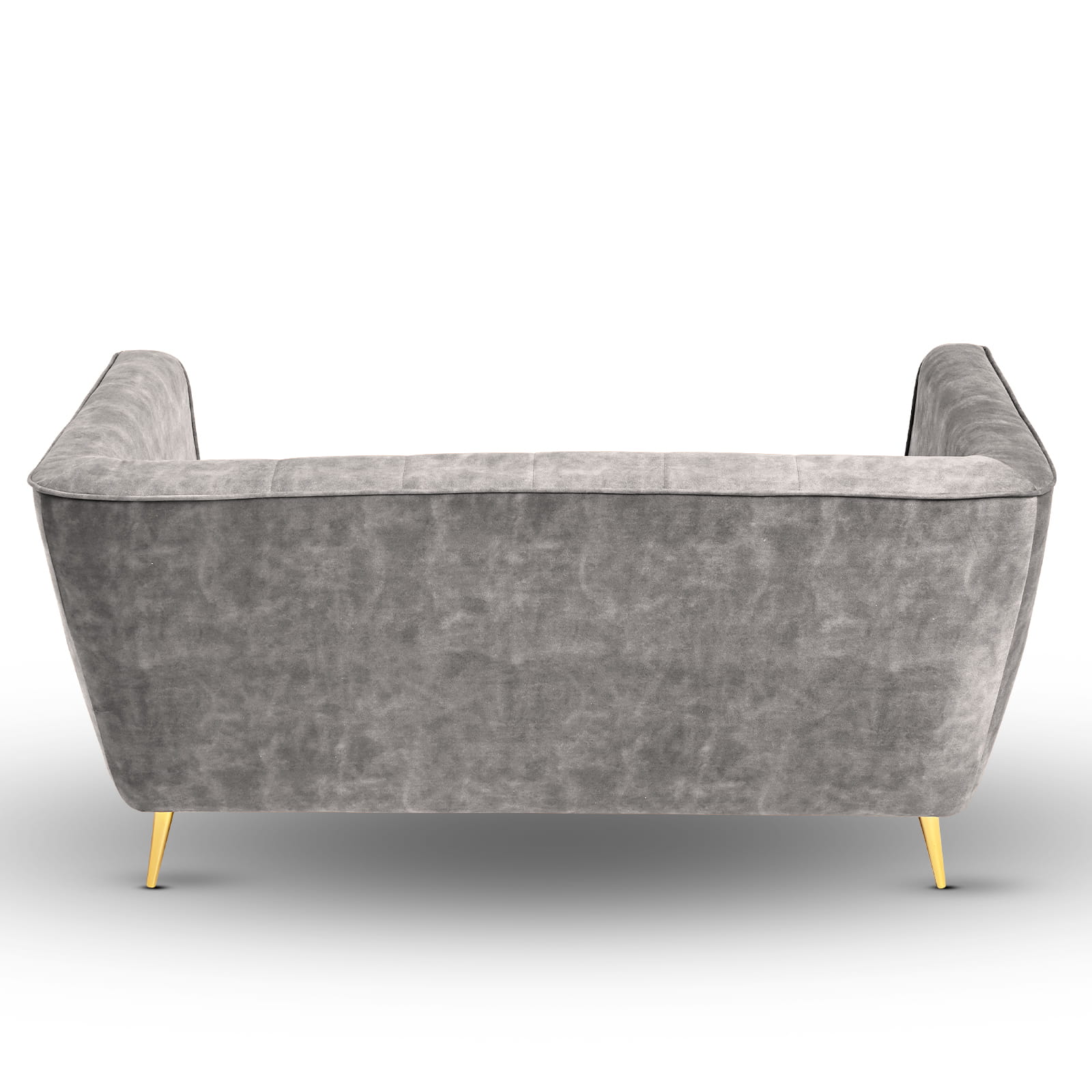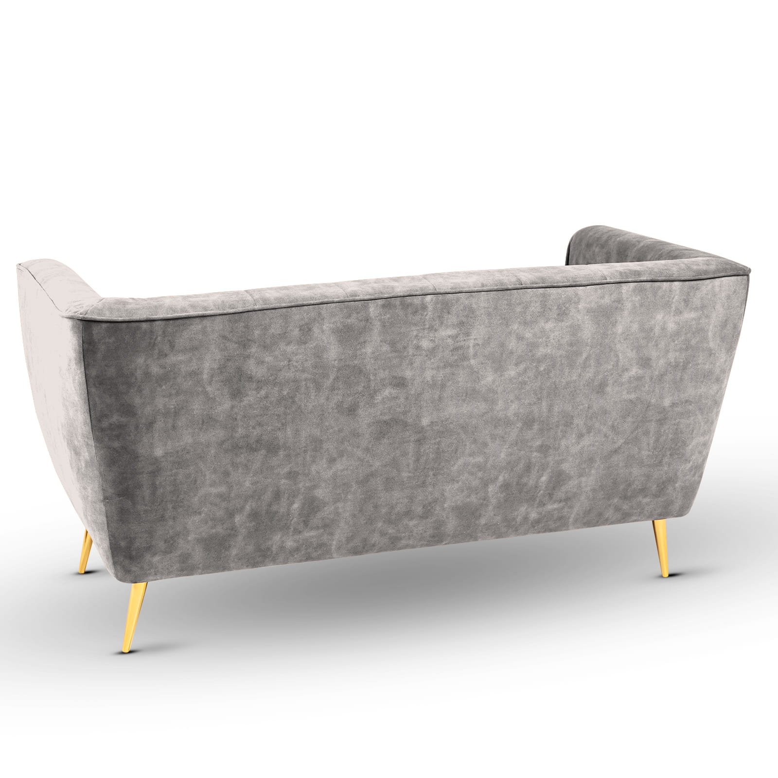 Sofa Lara z welurowej tkaniny w kolorze jasnoszarym z przeszyciami i złotymi nogami
