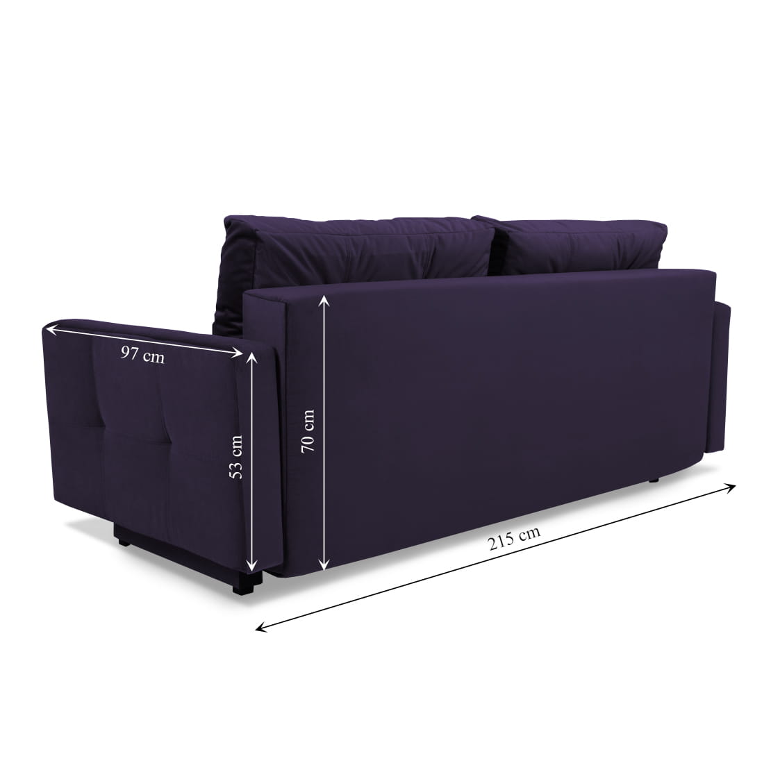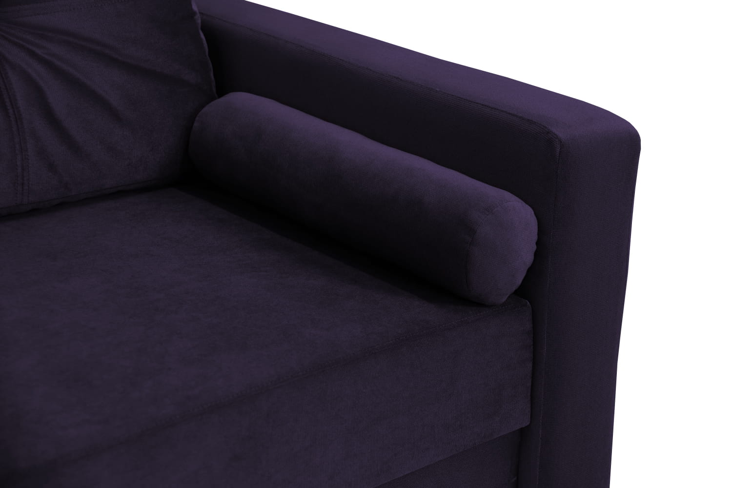 Rozkładana ciemnofioletowa sofa Stella z poduszkami w kształcie wałka, z pojemnikiem na pościel wyposażona w funkcję spania