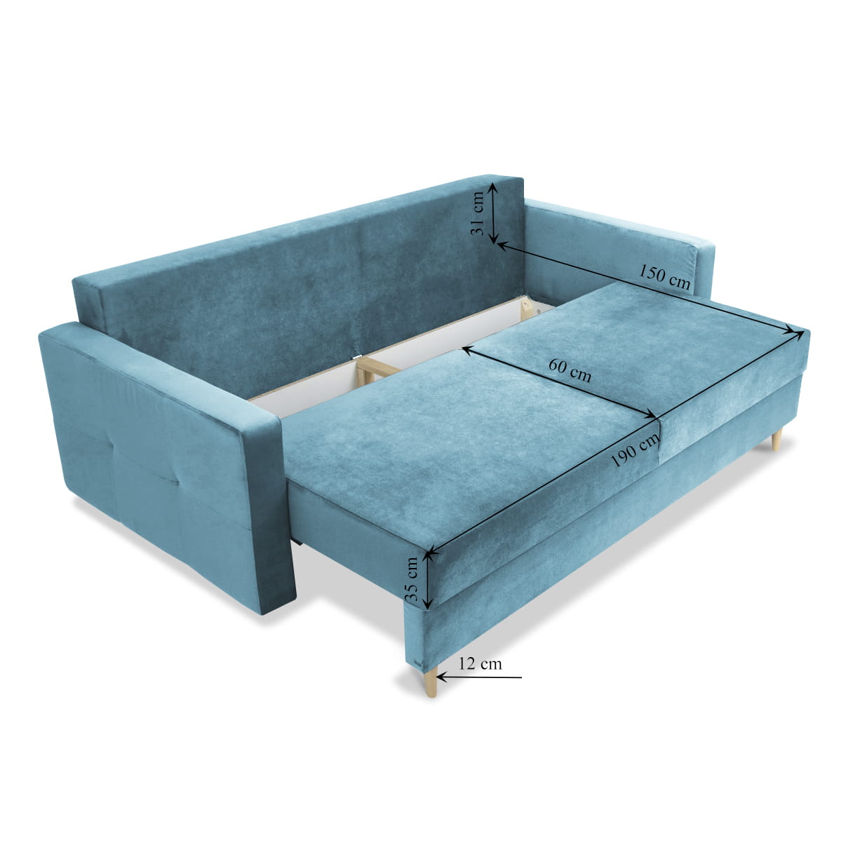 Sofa STELLA w kolorze jasnoniebieskim z funkcją spania i pojemnikiem na pościel