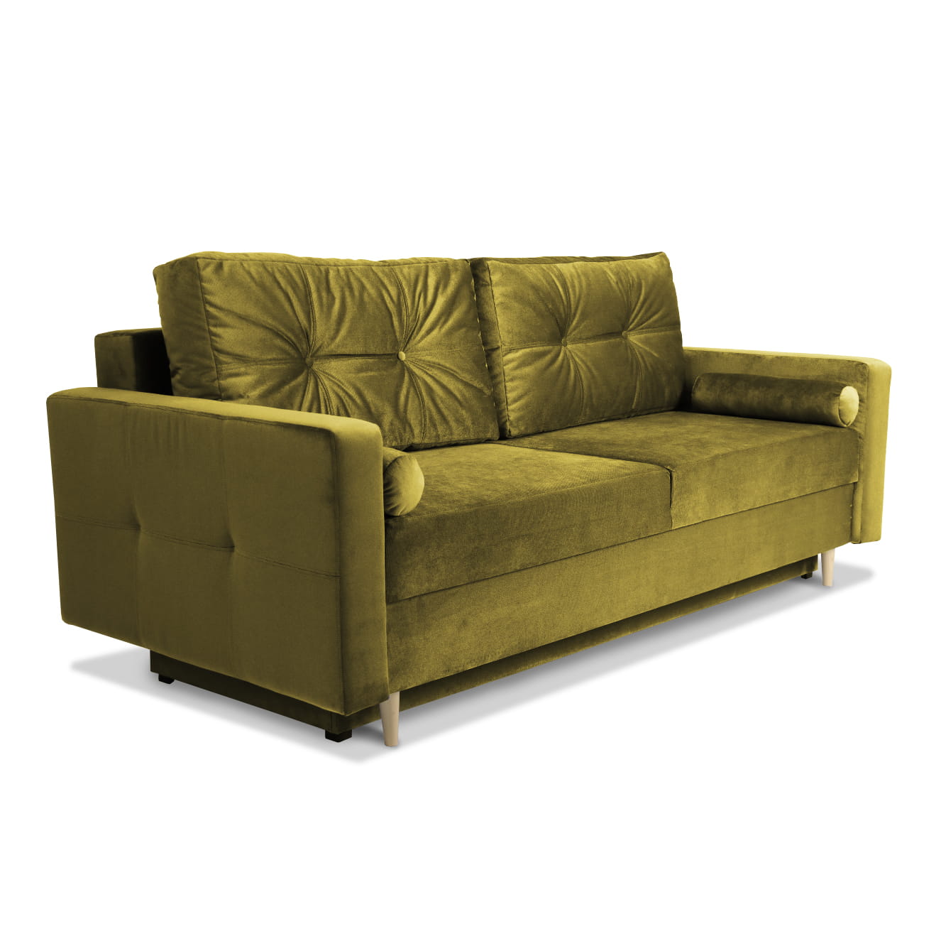 Sofa STELLA w kolorze oliwkowym z funkcją spania i pojemnikiem na pościel