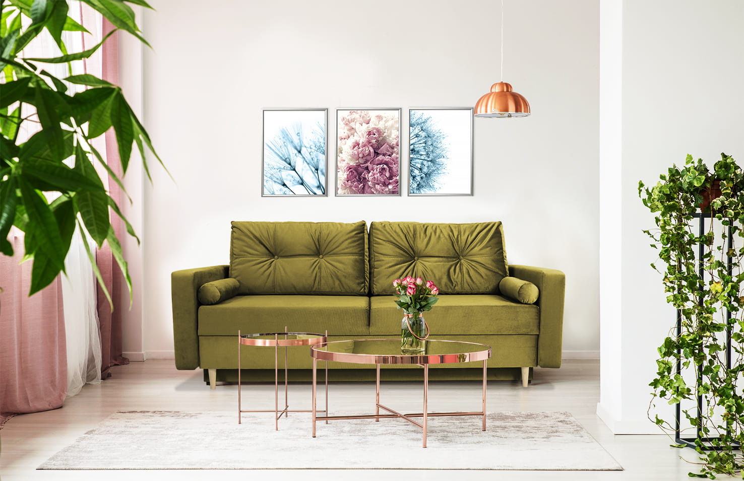 Elegancką sofę Stella w kolorze oliwkowym dopasujesz do każdego stylu i wnętrza.