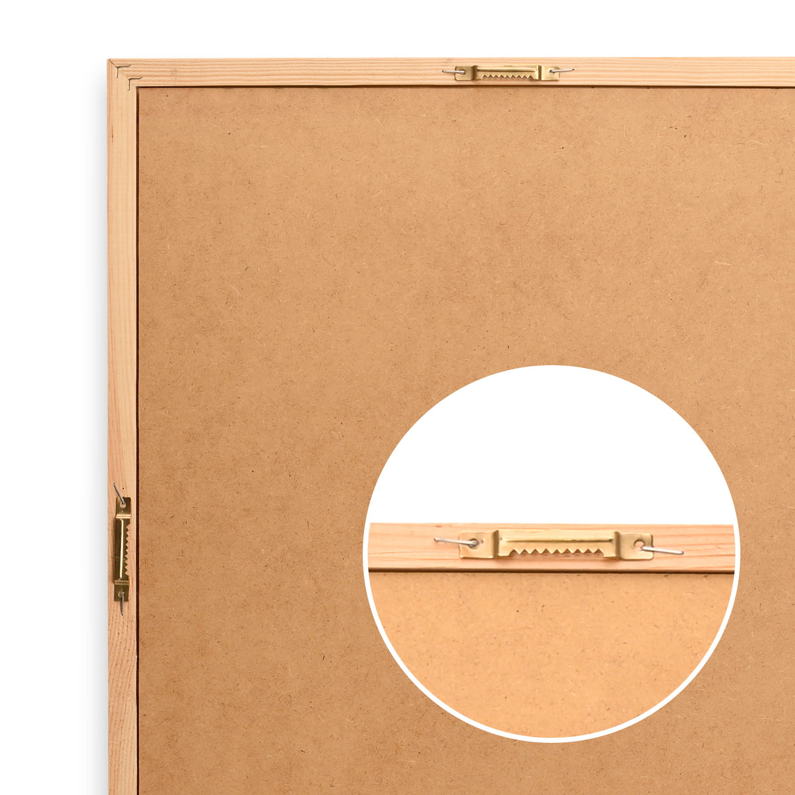 - Metalowe zawieszki – dwie zawieszki przymocowane na stałe do tylnej części ramy pozwalają na powieszenie tablicy korkowej na ścianie zarówno w pionie, jak i w poziomie.