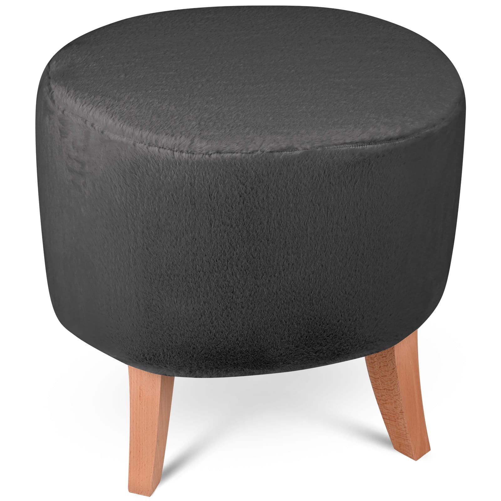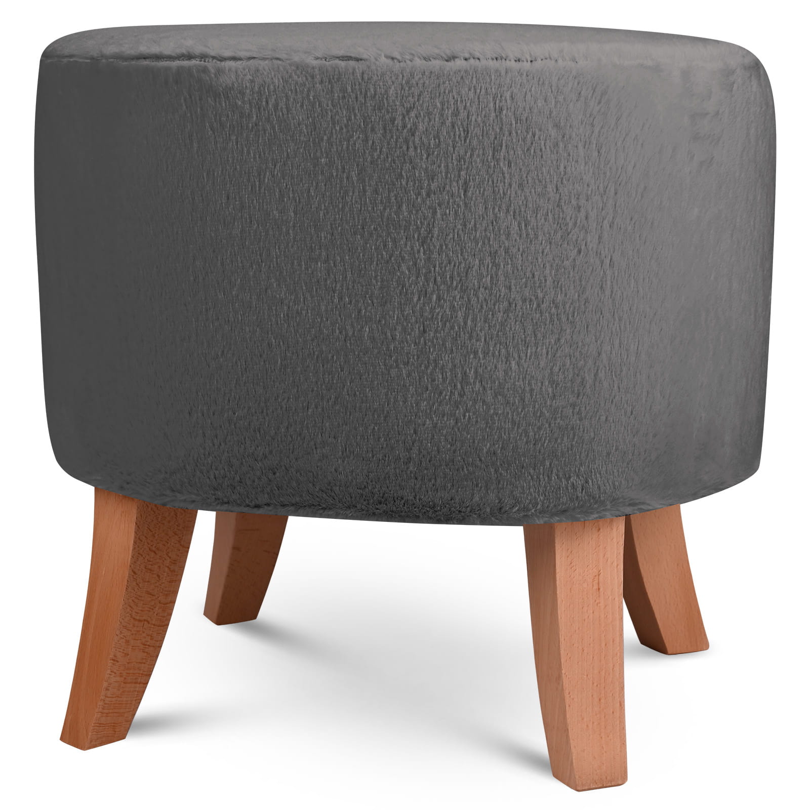 Tapicerowana pufa owalna 42x52x45 cm MAŁA w kolorze grafitowym - siedzisko z tkaniny imitującej futro, z drewnianymi nóżkami w kolorze naturalnego drewna