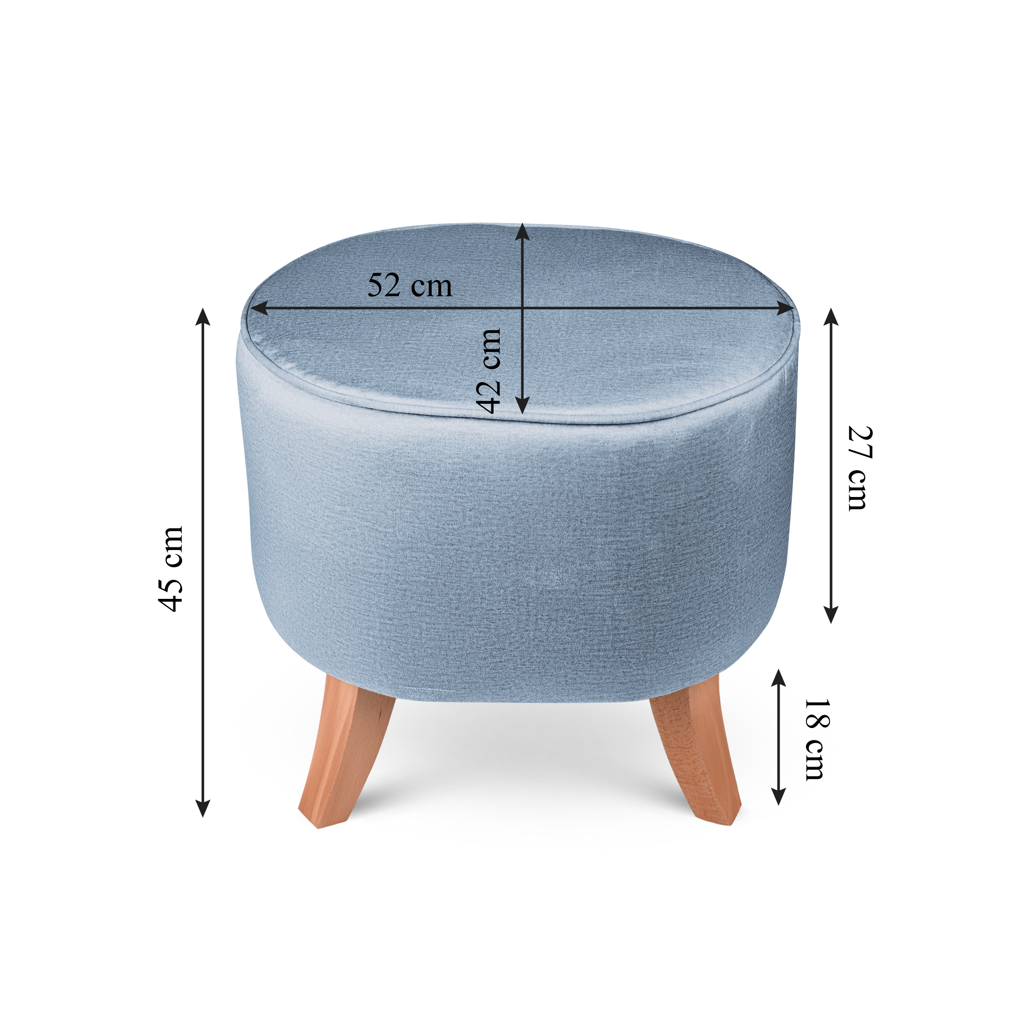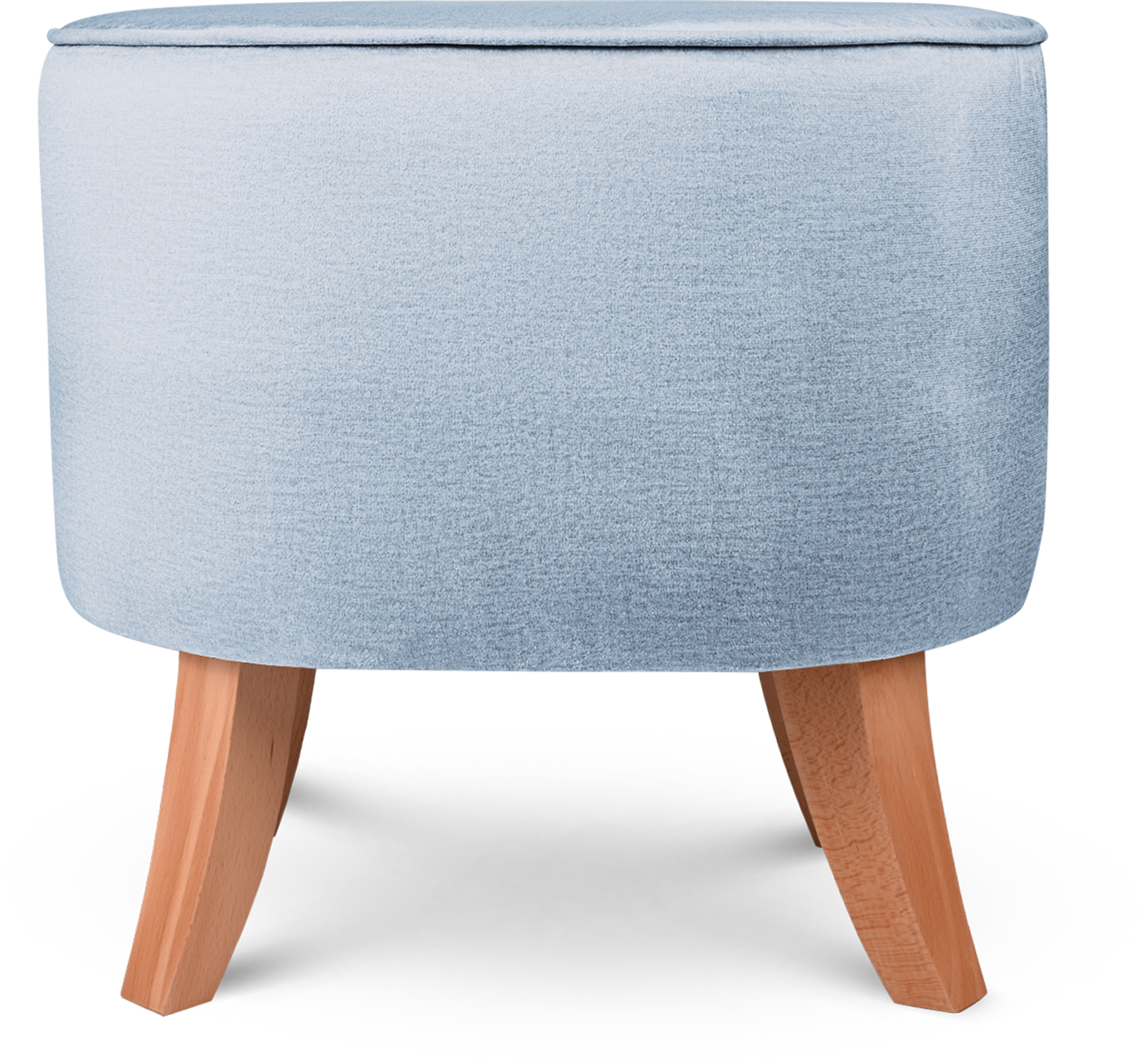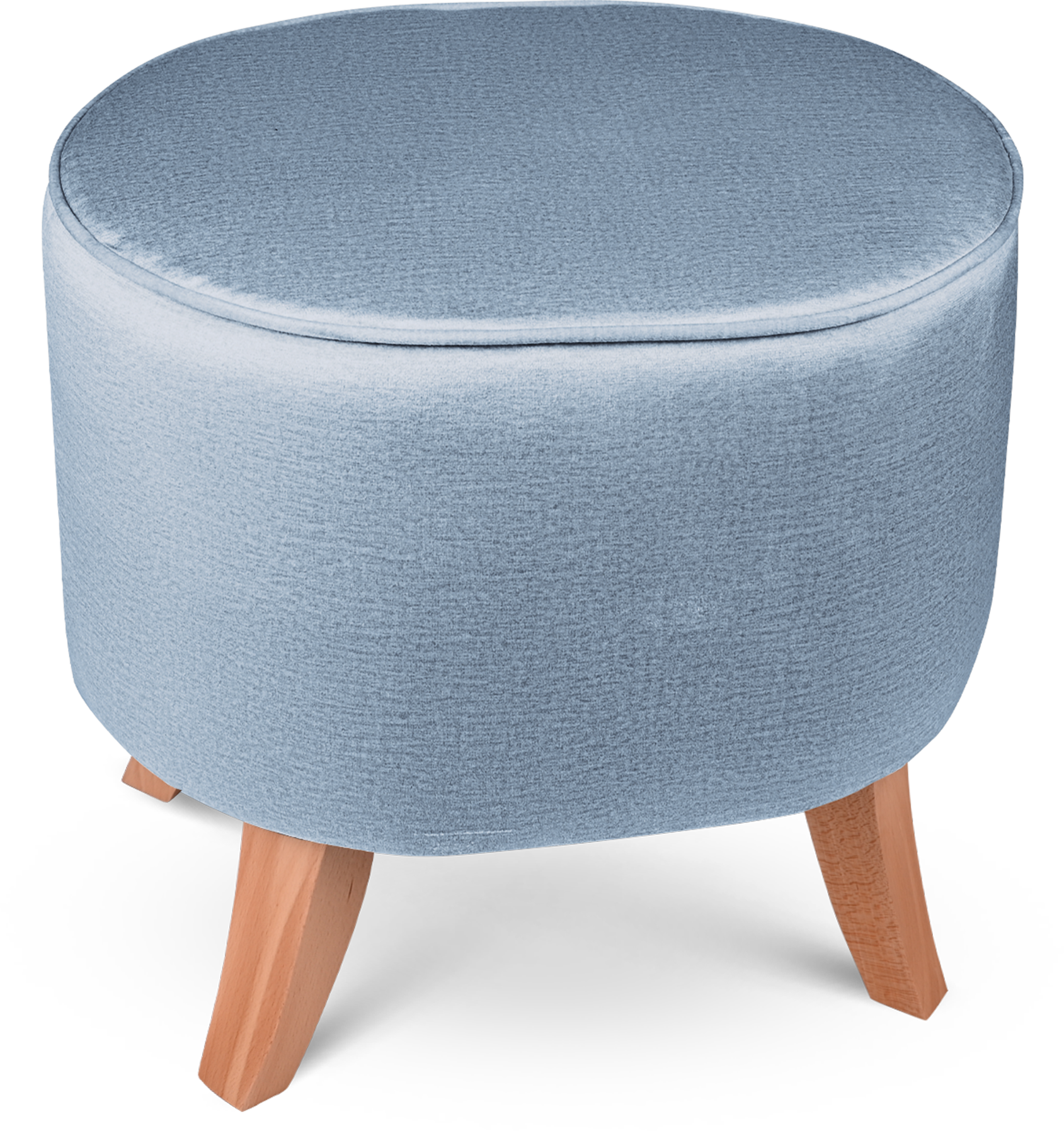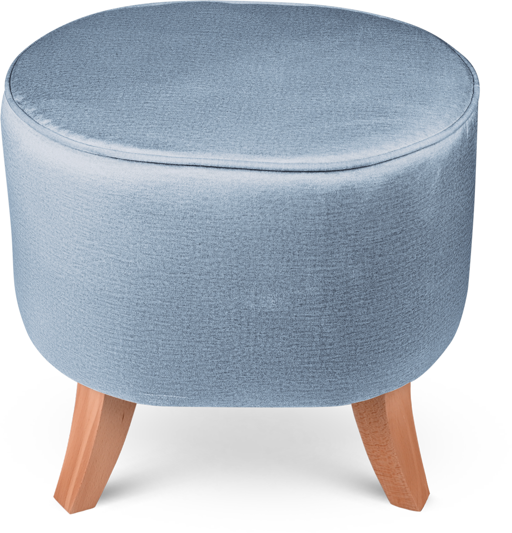 Tapicerowana pufa owalna 42x52x45 cm MAŁA w kolorze jasnoniebieskim - siedzisko z welurowej tkaniny, z drewnianymi nóżkami w kolorze naturalnego drewna