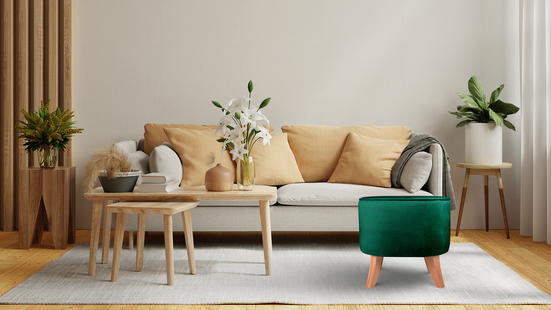 - Pufę wyposażono w drewniane nóżki w kolorze naturalnego drewna.