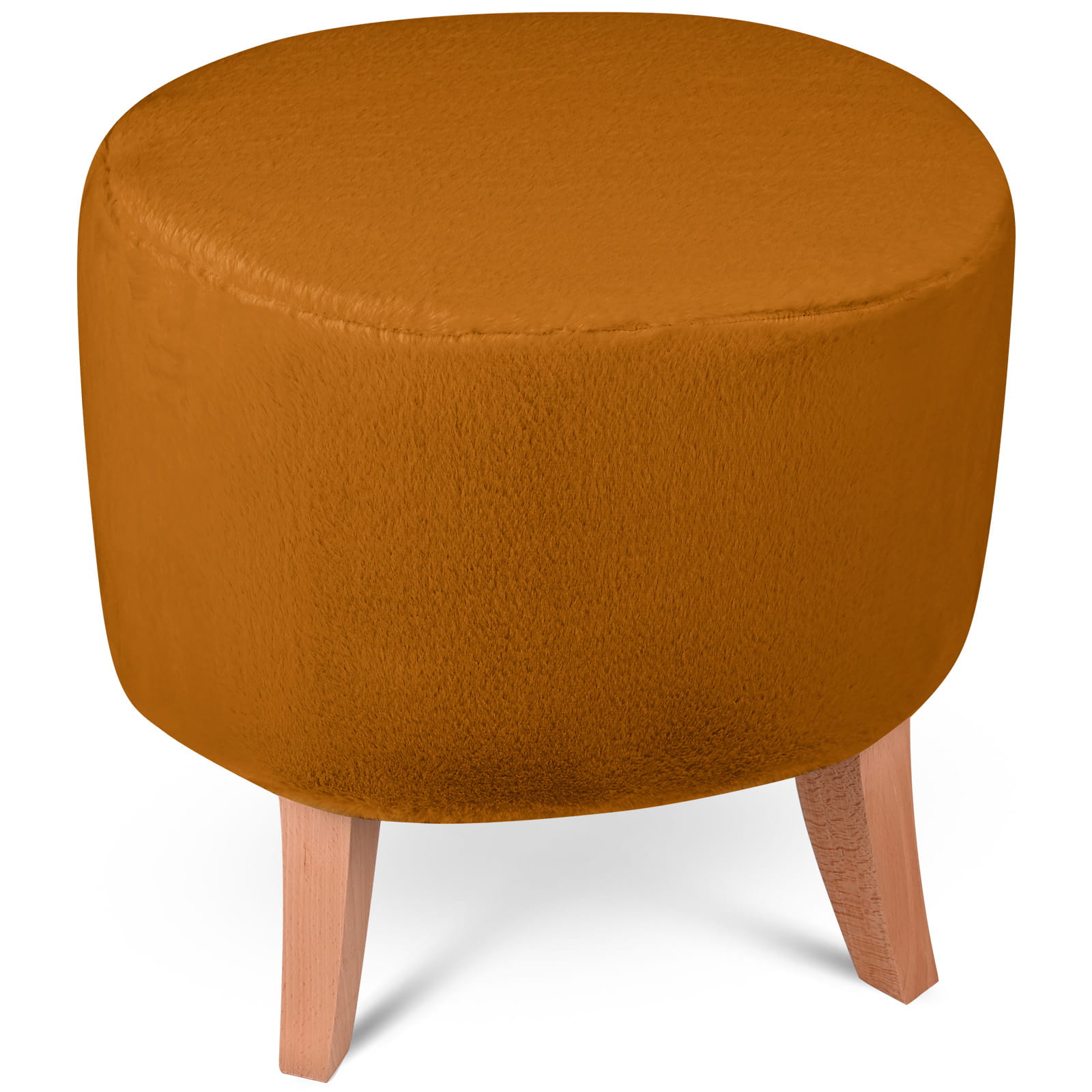 Tapicerowana pufa owalna 42x52x45 cm MAŁA w kolorze żółtym - siedzisko z tkaniny imitującej futro, z drewnianymi nóżkami w kolorze naturalnego drewna