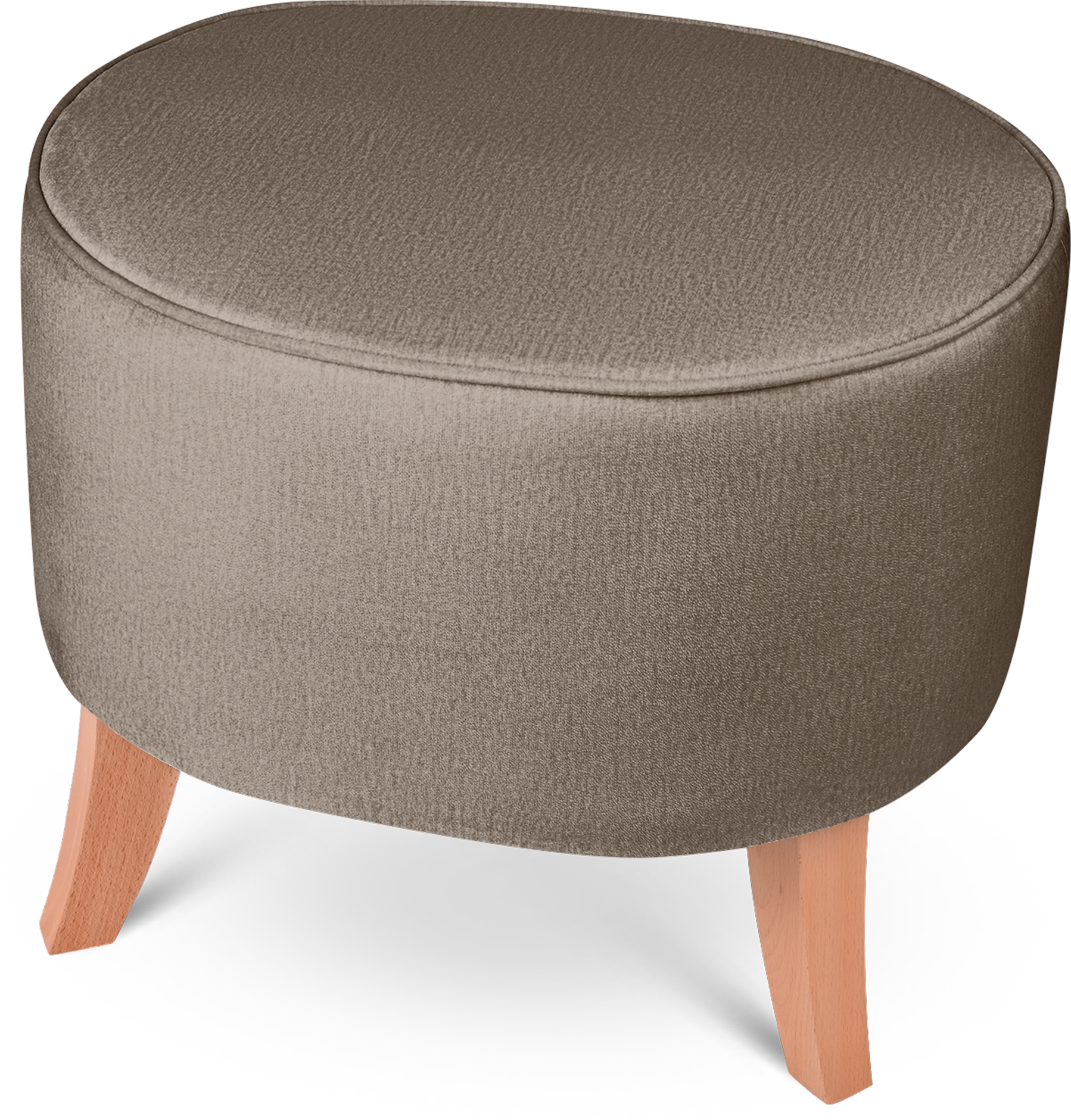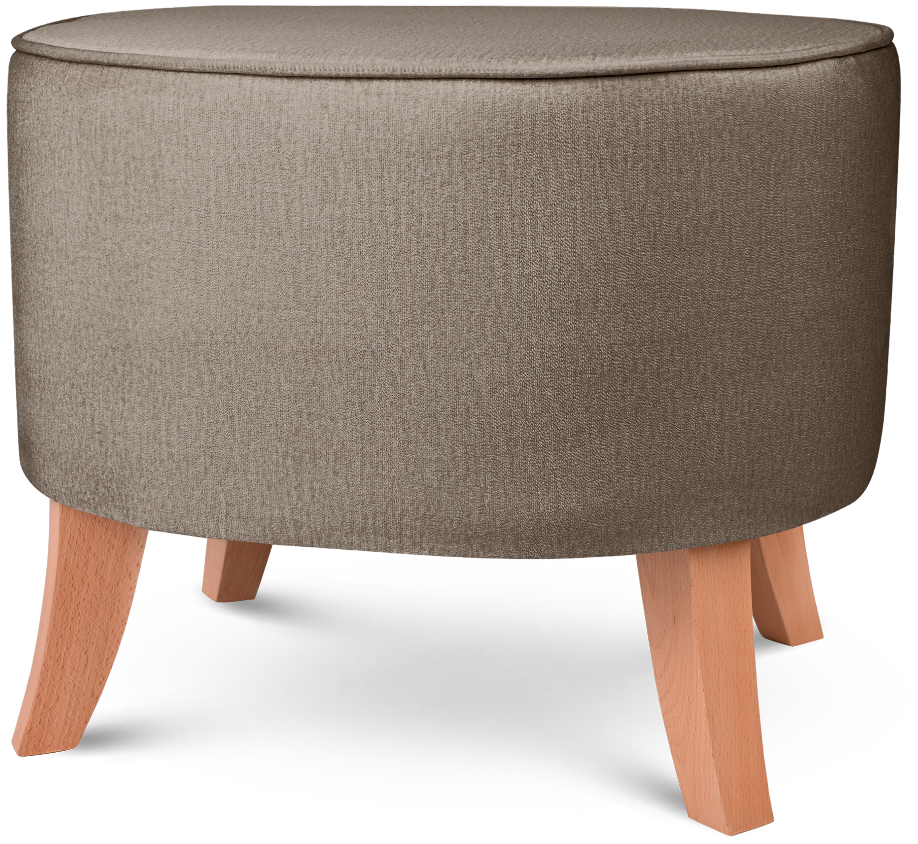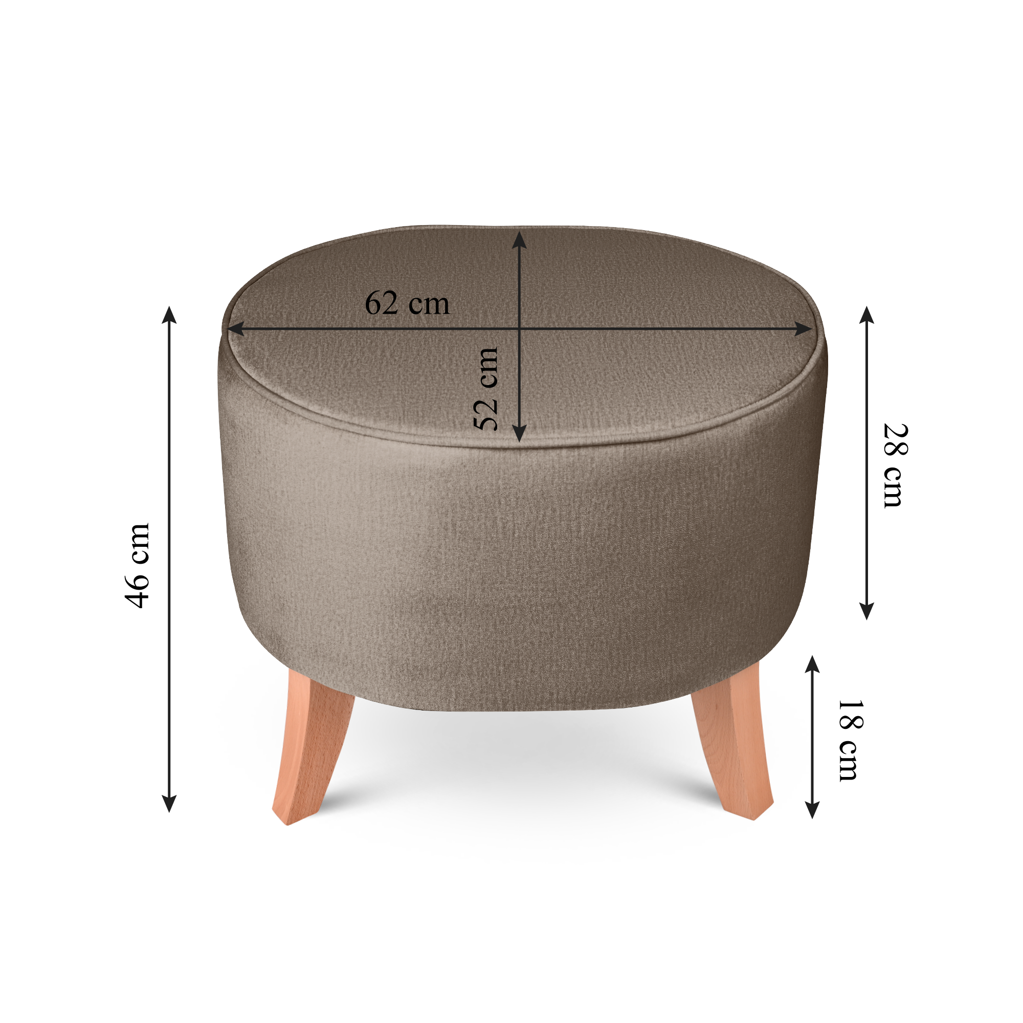 Tapicerowana pufa owalna 52x62x46 cm ŚREDNIA w kolorze beżowym - siedzisko z welurowej tkaniny, z drewnianymi nóżkami w kolorze naturalnego drewna