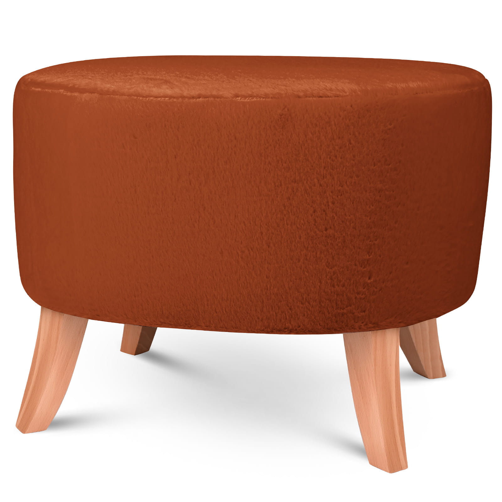 Tapicerowana pufa owalna 52x62x46 cm ŚREDNIA w kolorze ciemnopomarańczowym - siedzisko z tkaniny imitującej futro, z drewnianymi nóżkami w kolorze naturalnego drewna