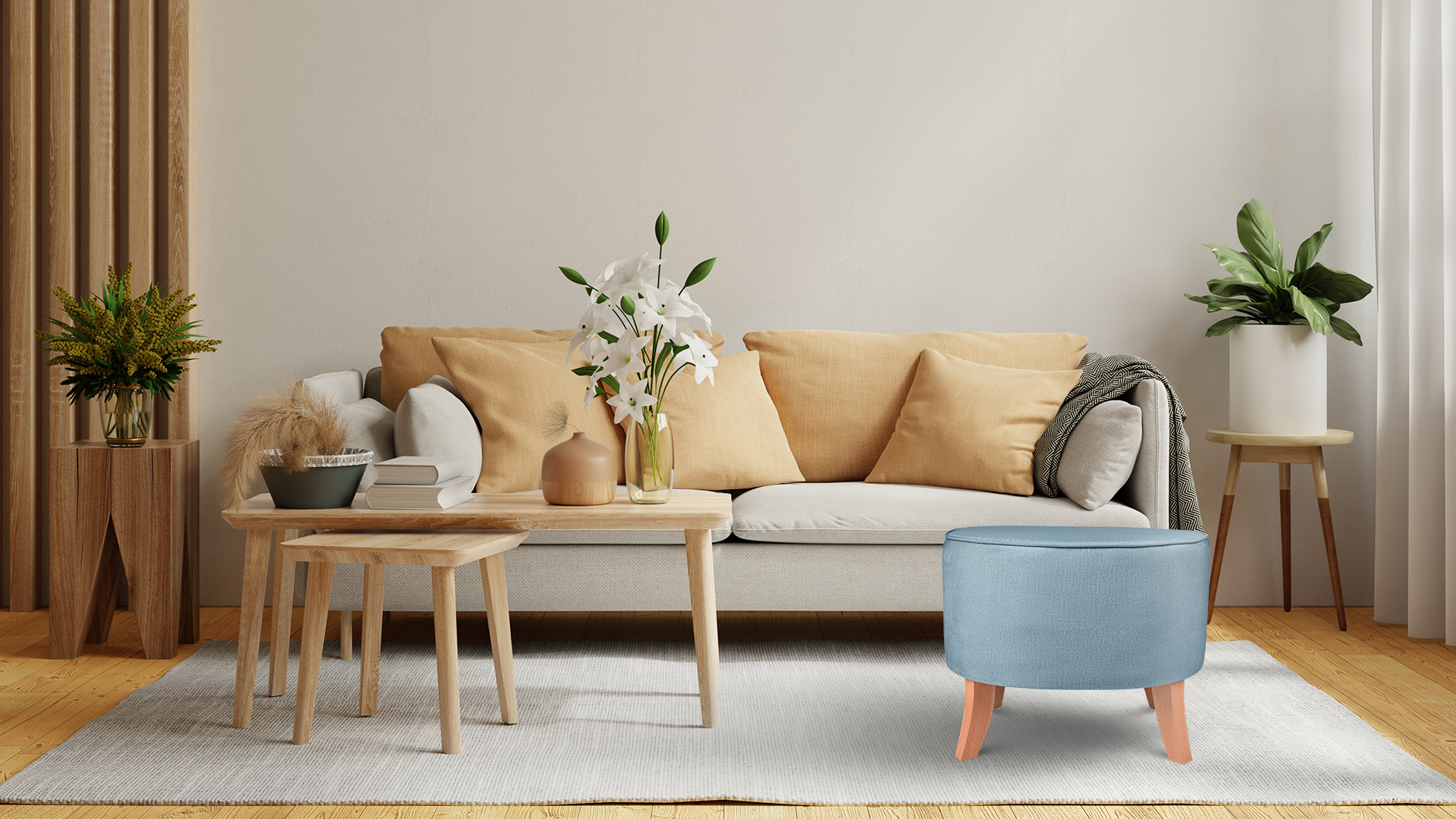 - Pufę wyposażono w drewniane nóżki w kolorze naturalnego drewna.