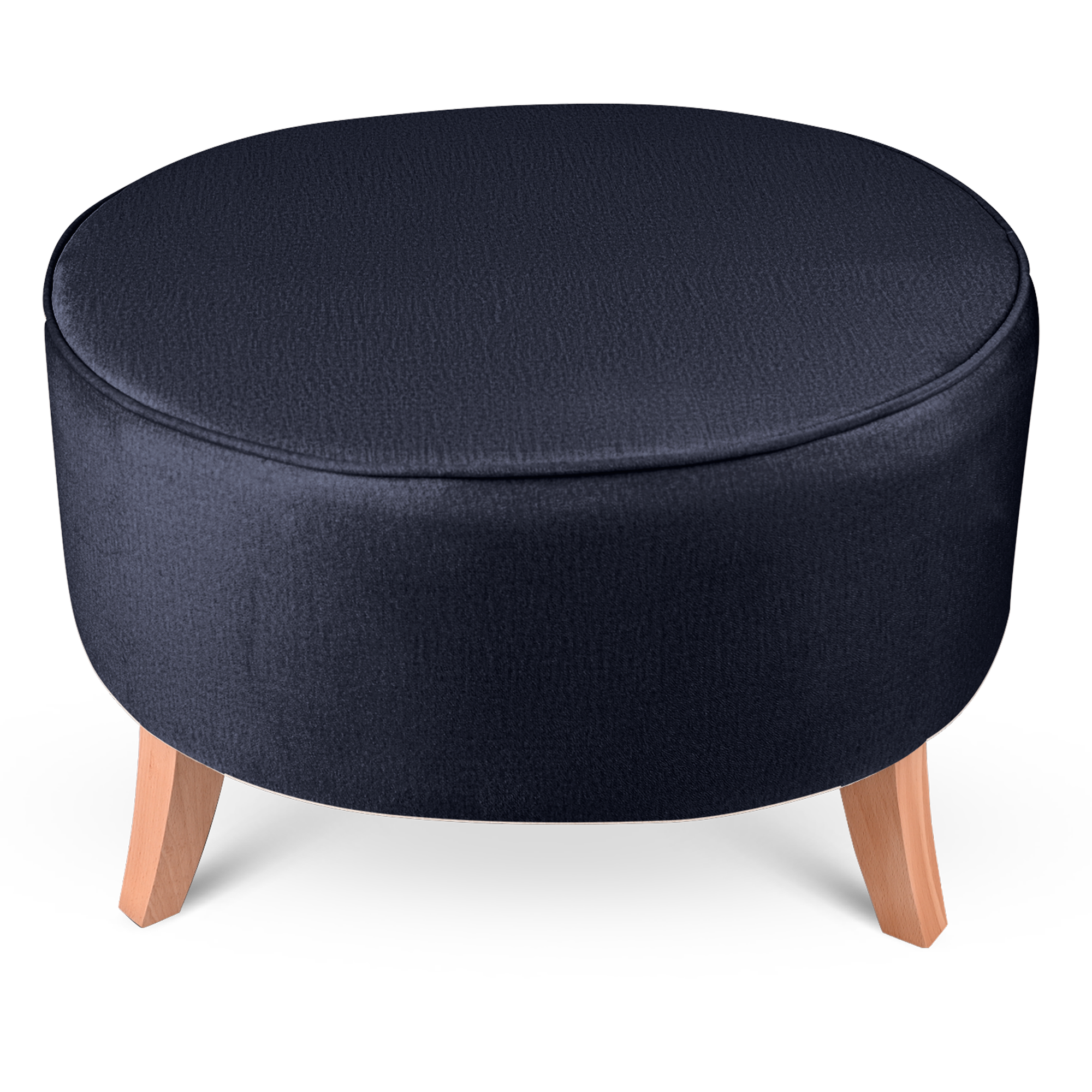 Elegancka, owalna pufa welurowa z drewnianymi nóżkami w kolorze granatowym w rozmiarze 72 x 62 x 45 cm