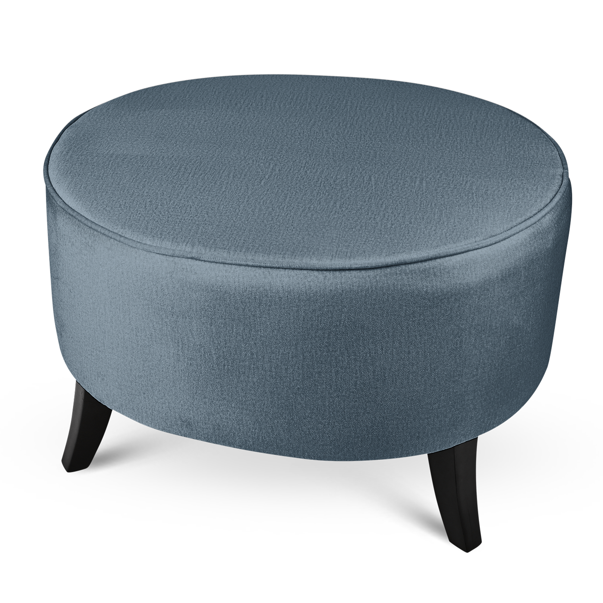 Elegancka, owalna pufa welurowa z drewnianymi nóżkami w kolorze niebieskim w rozmiarze 72 x 62 x 45 cm