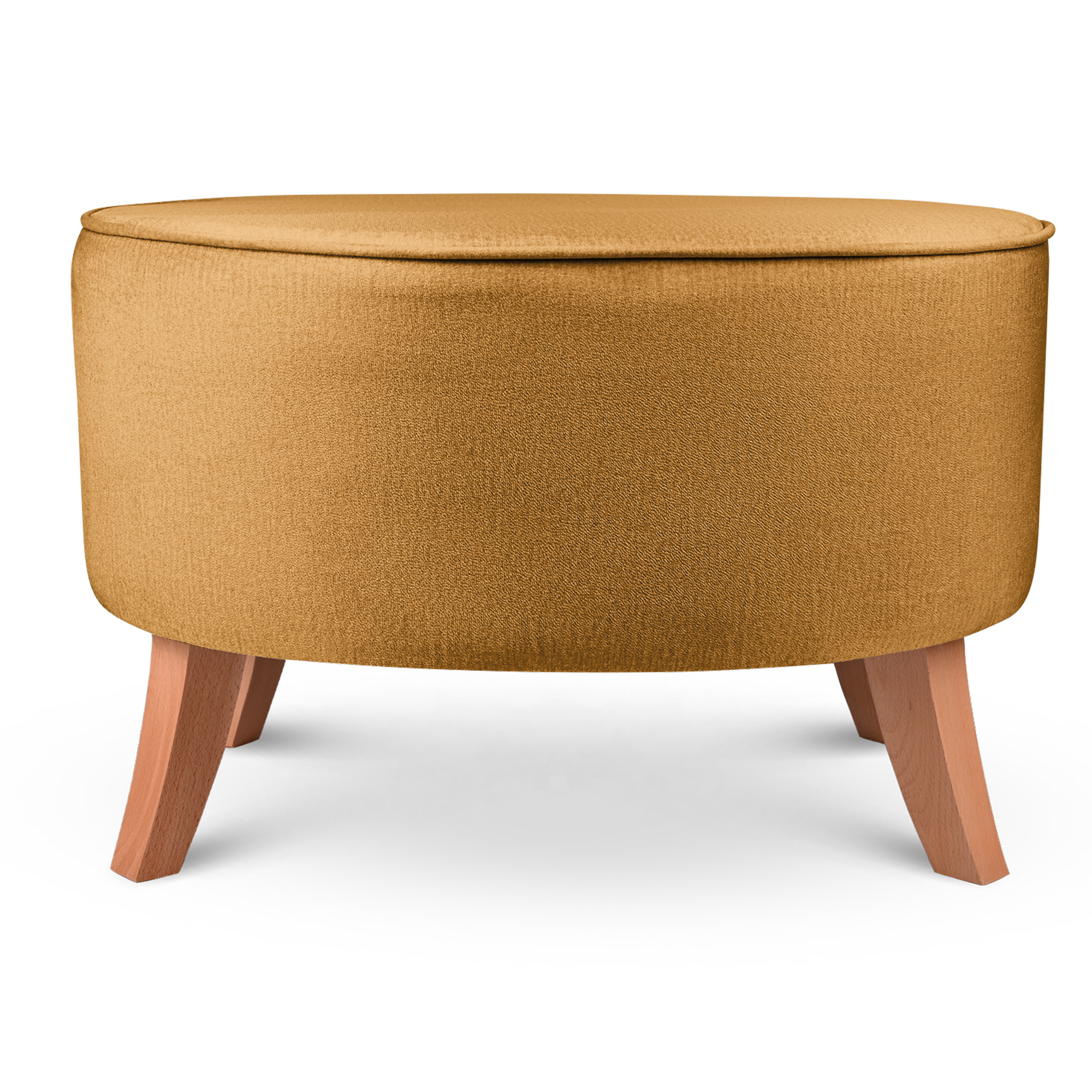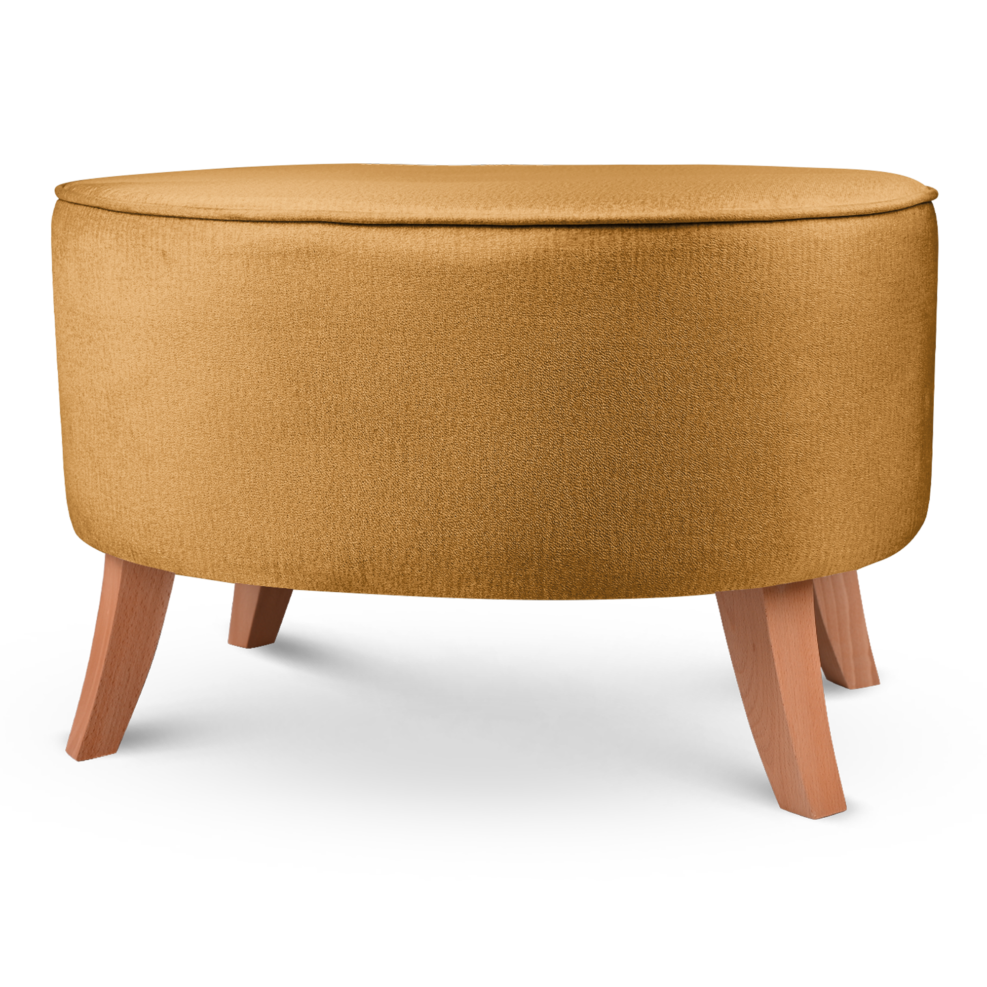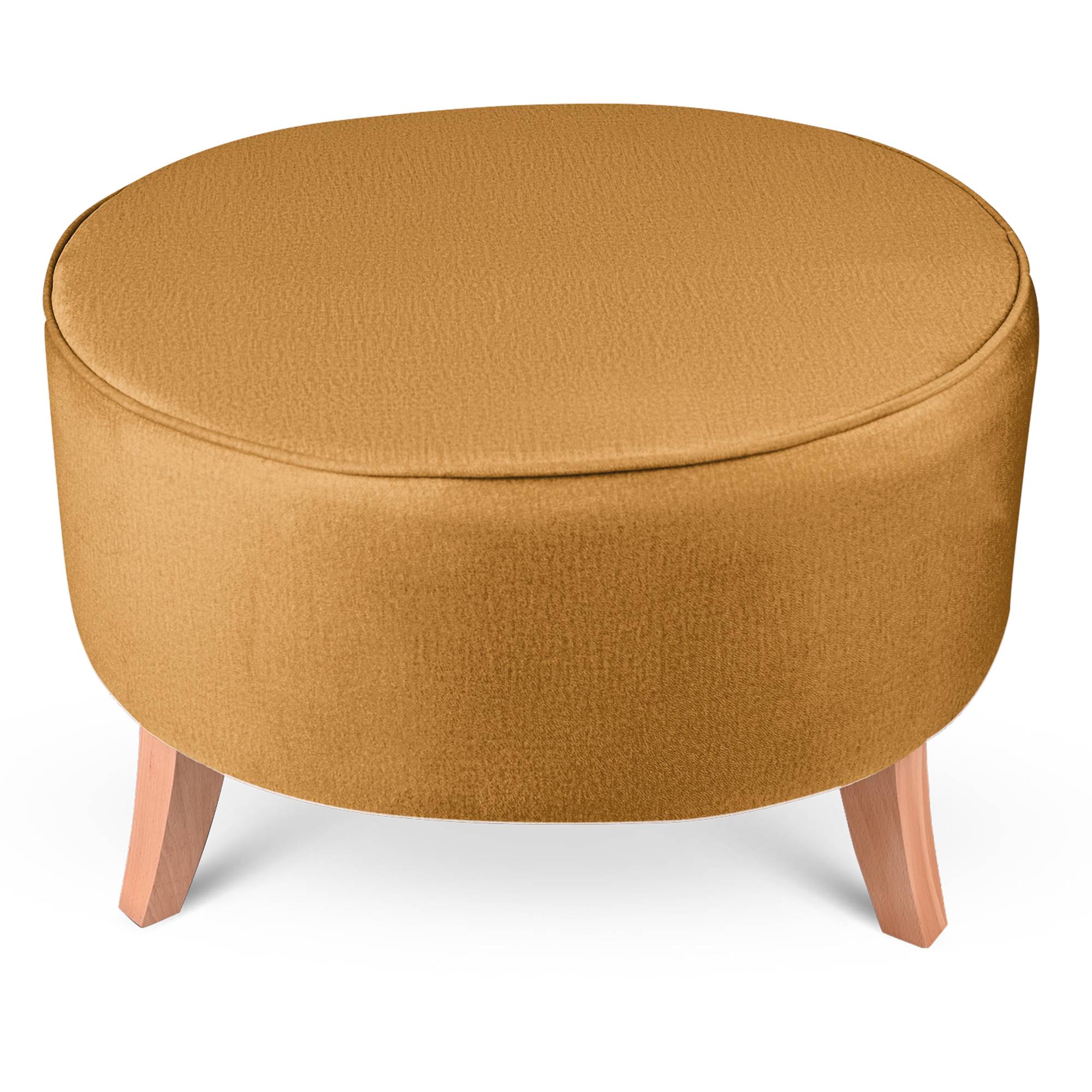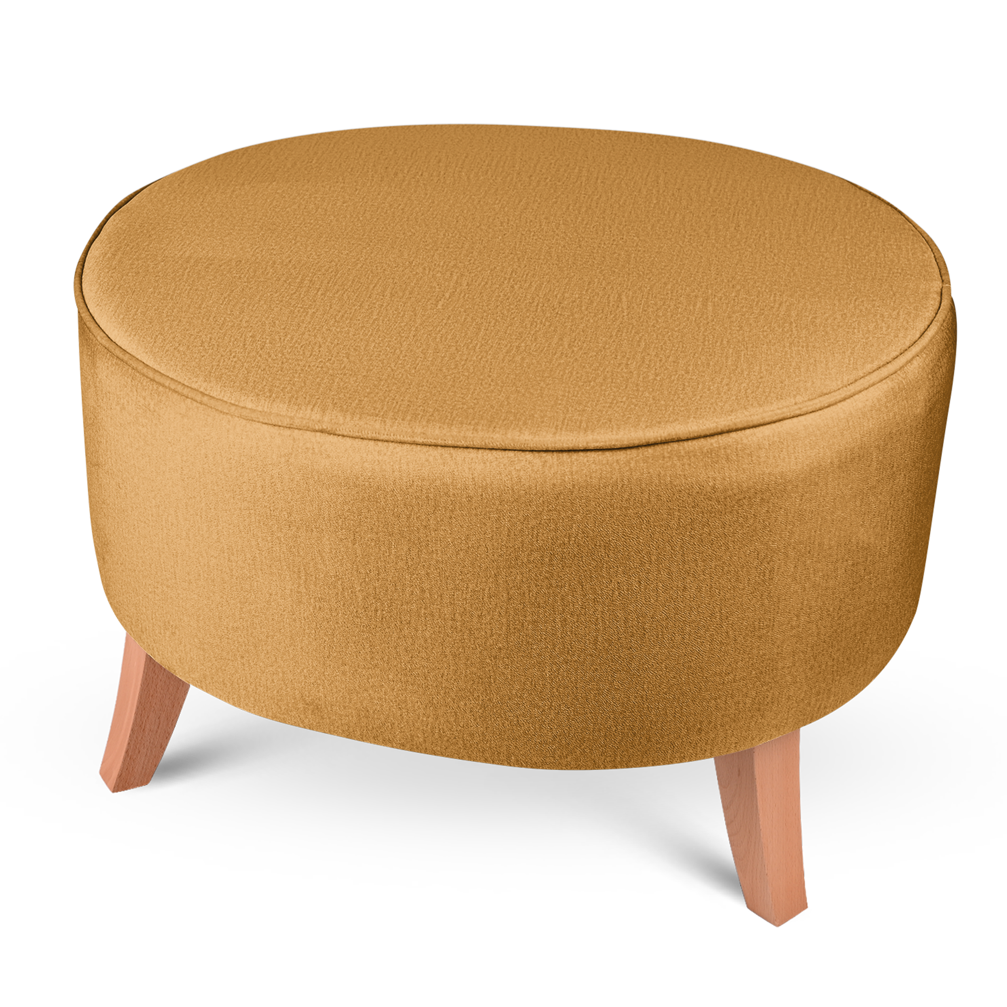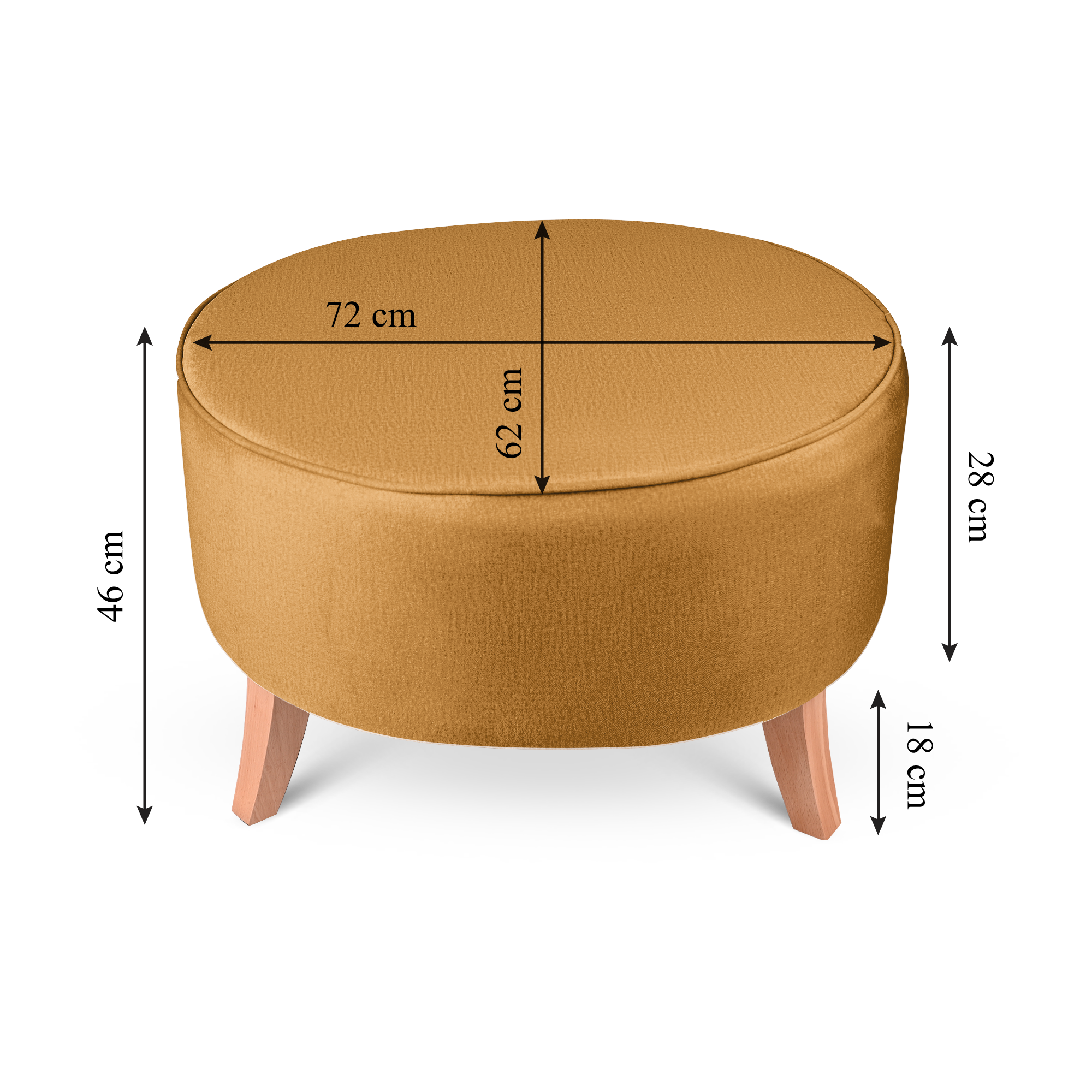 Elegancka, owalna pufa welurowa z drewnianymi nóżkami w kolorze żółtym w rozmiarze 72 x 62 x 45 cm