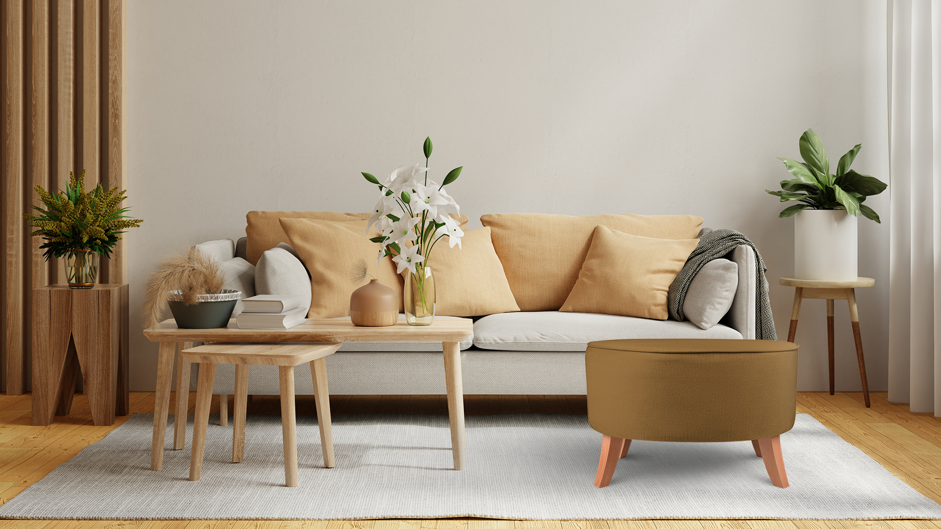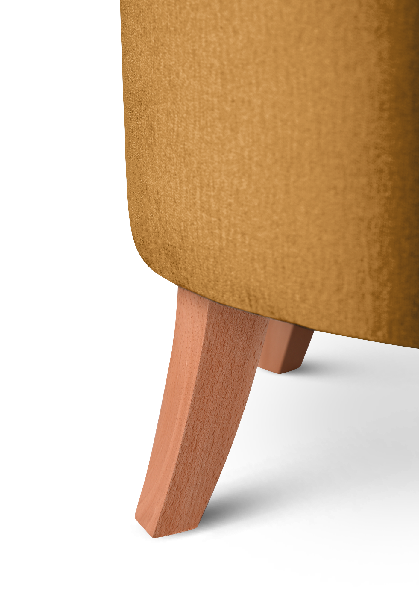 - Pufę wyposażono w drewniane nóżki w kolorze naturalnego drewna.
