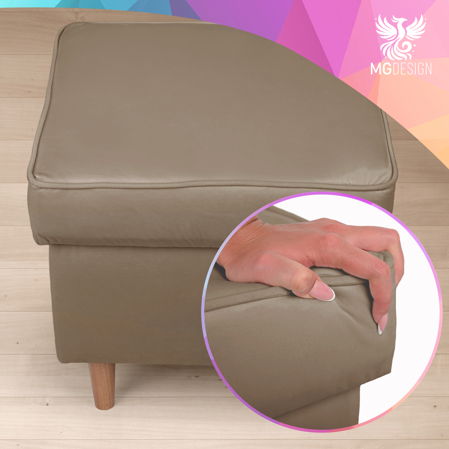 Tapicerka o aksamitnej, welurowej strukturze jest przyjemna w dotyku i subtelnie odbija światło, dzięki czemu pufa prezentuje się wyjątkowo elegancko. Stabilne drewniane nóżki nadają meblowi lekkości i zapewniają solidną konstrukcję, która dobrze sprawdza się w codziennym użytkowaniu.