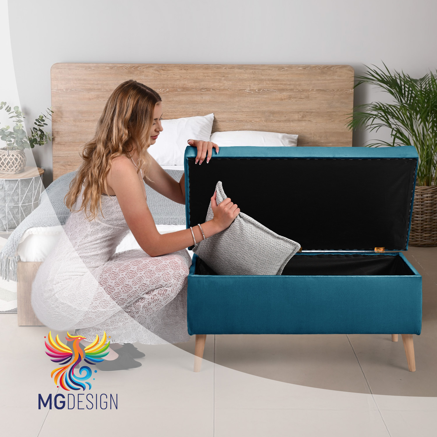 Podnoszone siedzisko kryje pojemny schowek, w którym można przechowywać poduszki, koce, tekstylia lub inne drobiazgi, pomagając utrzymać porządek w pomieszczeniu. Miękkie siedzisko z eleganckimi przeszyciami zapewnia komfort użytkowania, a aksamitna tkanina welurowa jest przyjemna w dotyku i subtelnie odbija światło, nadając meblowi elegancki charakter.