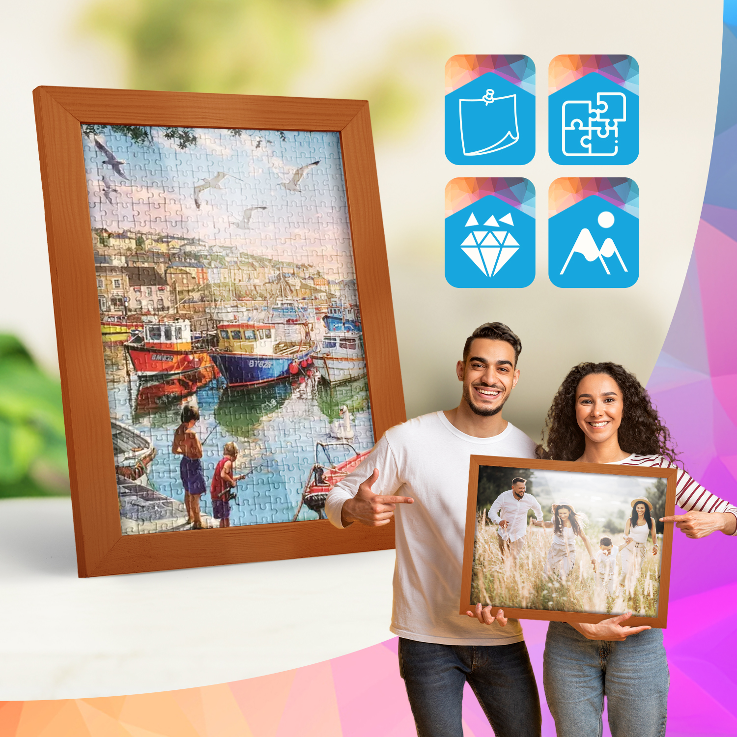 Zestaw drewnianych ramek to estetyczne i uniwersalne rozwiązanie do oprawy zdjęć, plakatów, grafik oraz wydruków dekoracyjnych. Klasyczny, profil ramek nadaje całej kompozycji elegancki wygląd i podkreśla prezentowane motywy, zachowując spójny i uporządkowany charakter aranżacji.