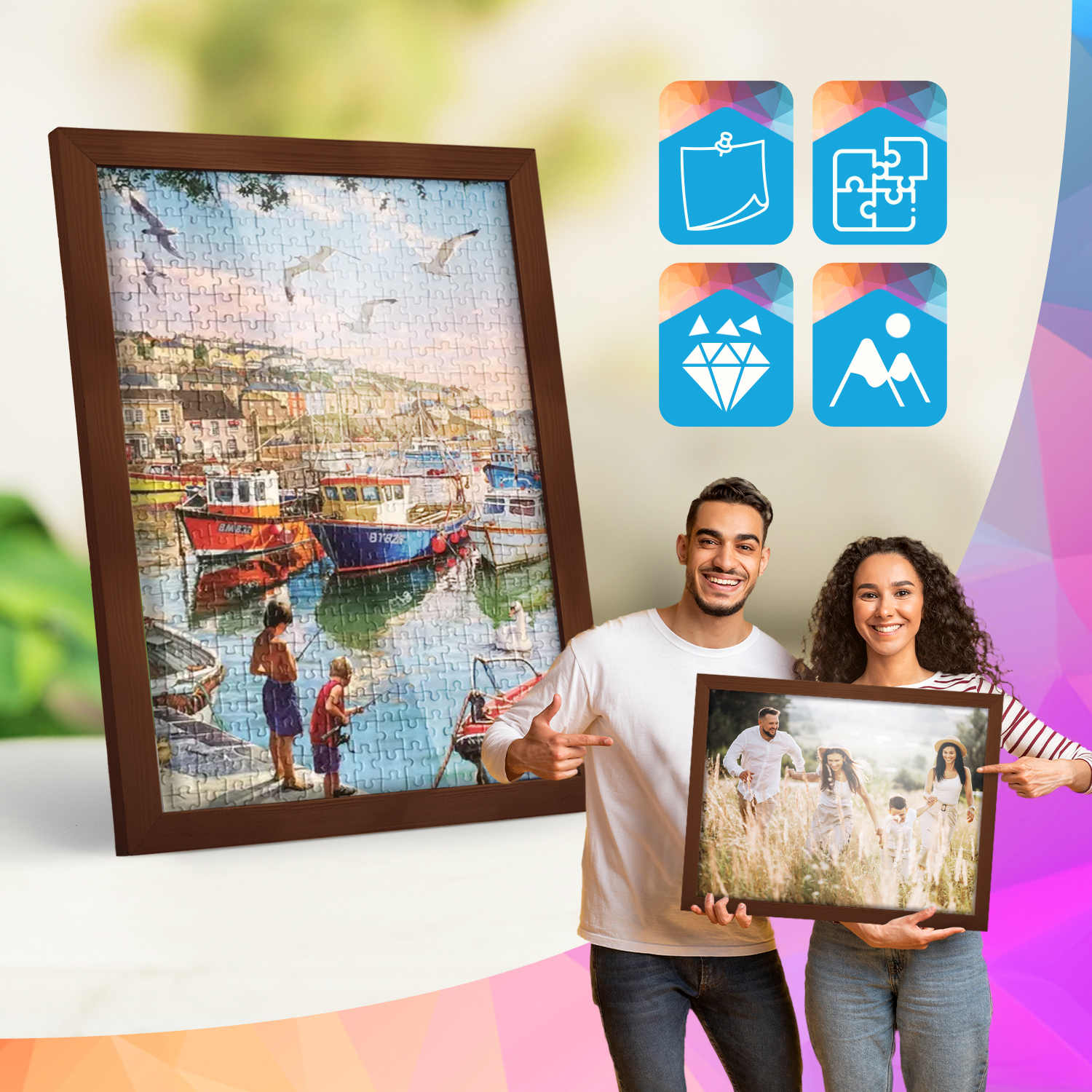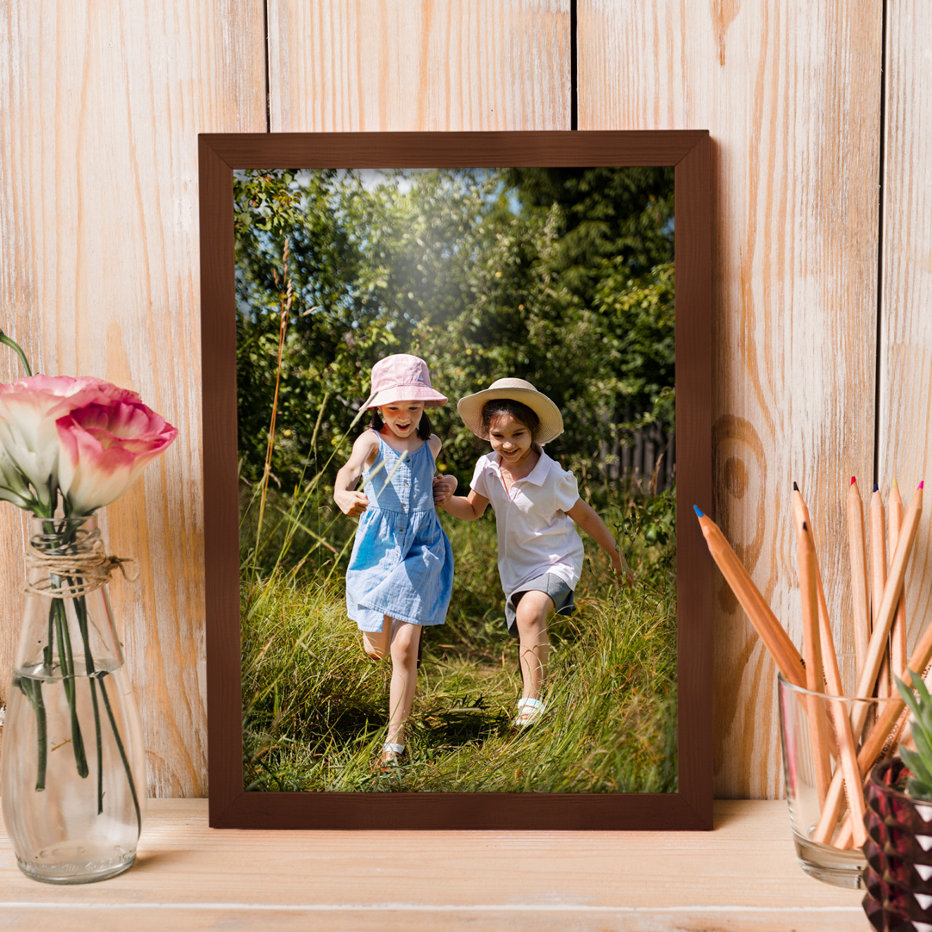 Zestaw drewnianych ramek to estetyczne i uniwersalne rozwiązanie do oprawy zdjęć, plakatów, grafik oraz wydruków dekoracyjnych. Klasyczny, profil ramek nadaje całej kompozycji elegancki wygląd i podkreśla prezentowane motywy, zachowując spójny i uporządkowany charakter aranżacji.