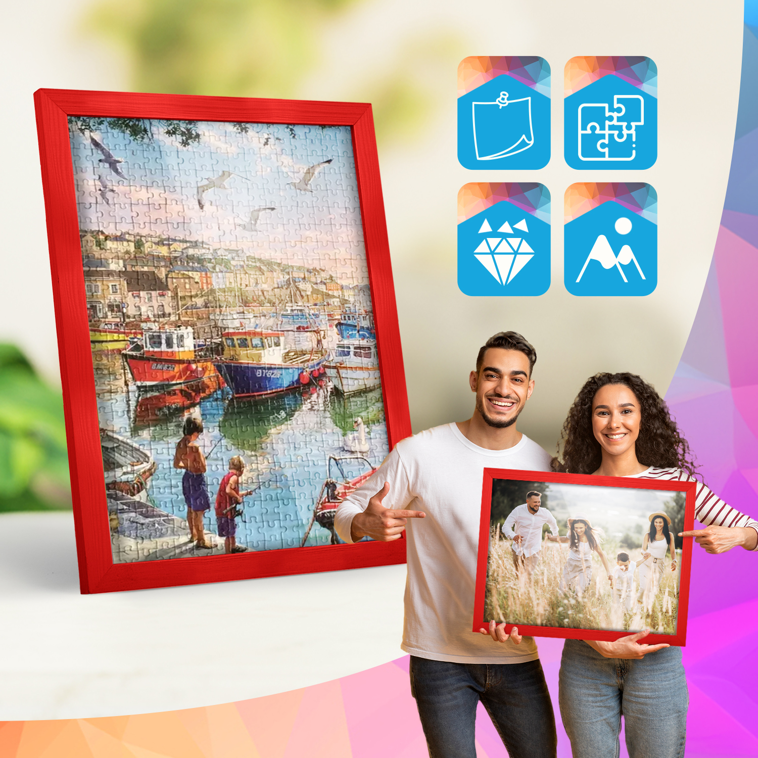 Ramki mogą być eksponowane zarówno na meblach, jak i na ścianie. Zintegrowane zawieszki pozwalają na ustawienie lub zawieszenie ramek w pionie lub w poziomie, dzięki czemu łatwo dopasować zestaw do aranżacji wnętrza.