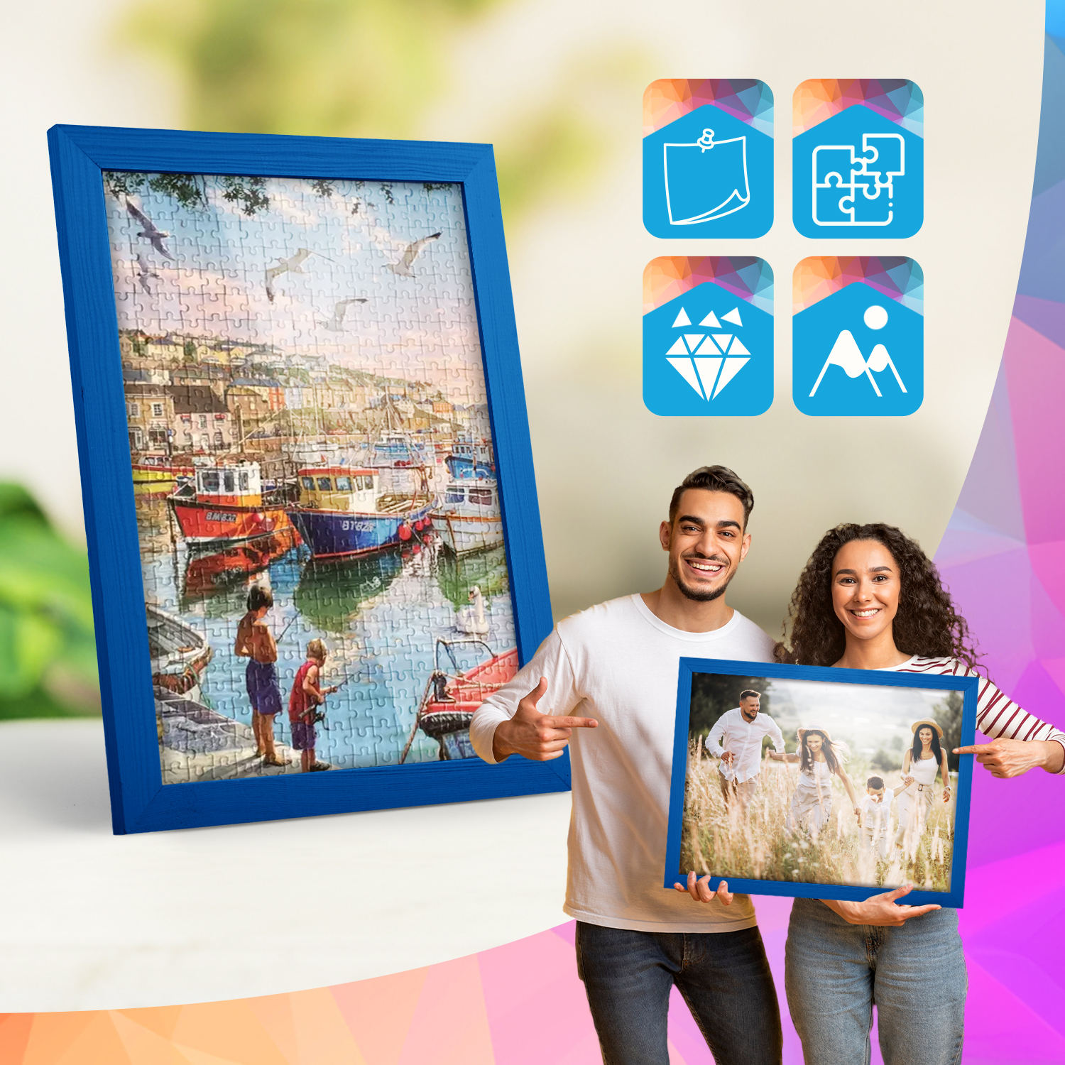Ramki mogą być eksponowane zarówno na meblach, jak i na ścianie. Zintegrowane zawieszki pozwalają na ustawienie lub zawieszenie ramek w pionie lub w poziomie, dzięki czemu łatwo dopasować zestaw do aranżacji wnętrza.